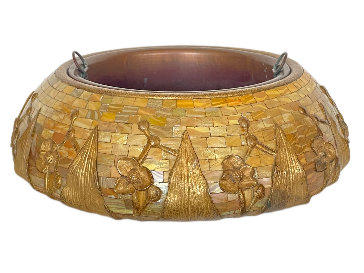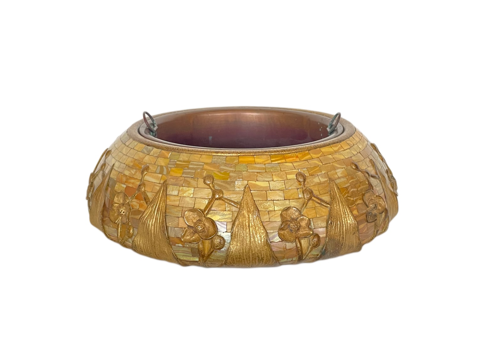 An extremely rare Early 20th Century American Art Nouveau bronze and favrile glass "Mosaic "Arrowhead Fern" Jardinière by, Tiffany Studios decorated with inlaid mosaic iridized yellow favrile "damascene glass" with cast bronze arrowhead decoration finished in an original gold and further acid etched bronze patina. The planter retains its original copper liner the jardinere is impressed, "TIFFANY STUDIOS NEW YORK 835"