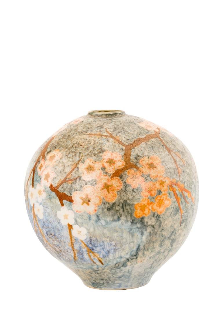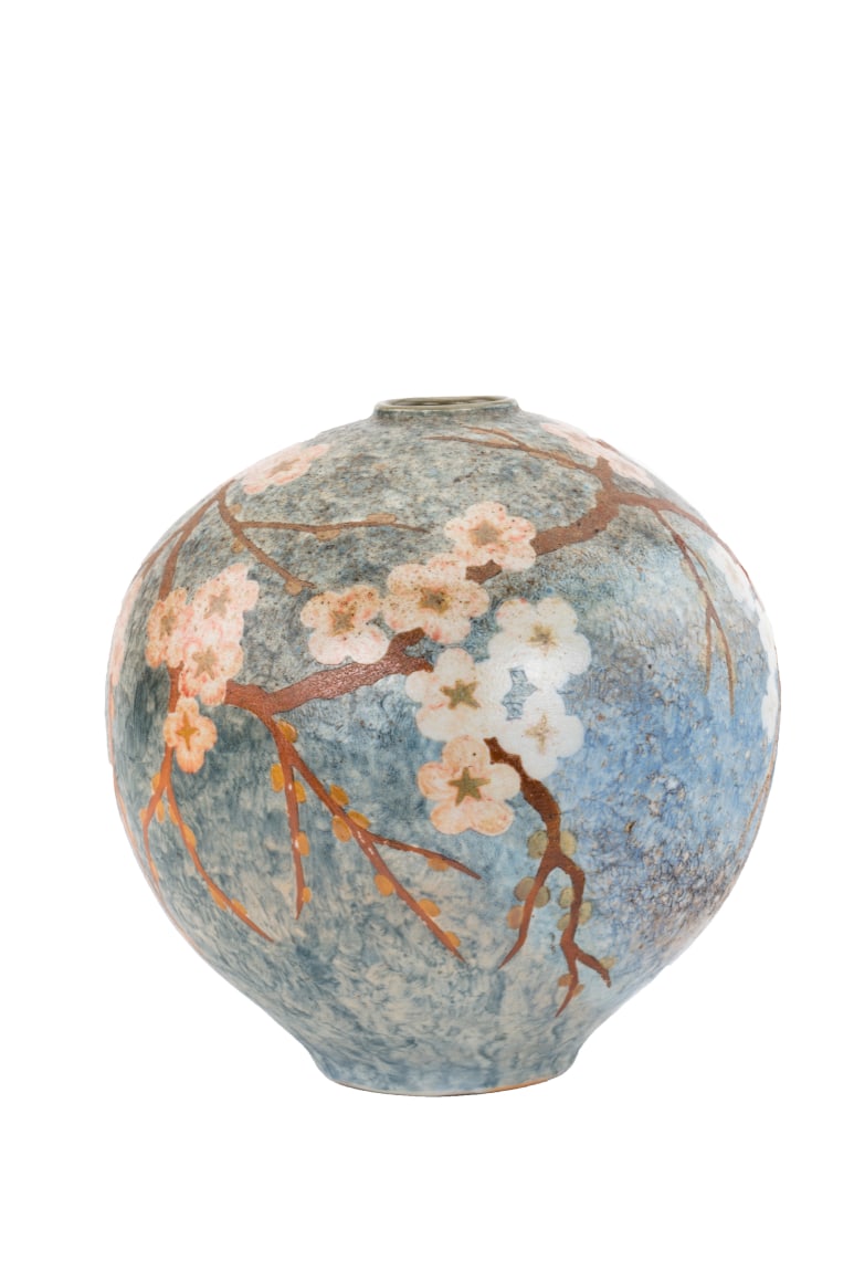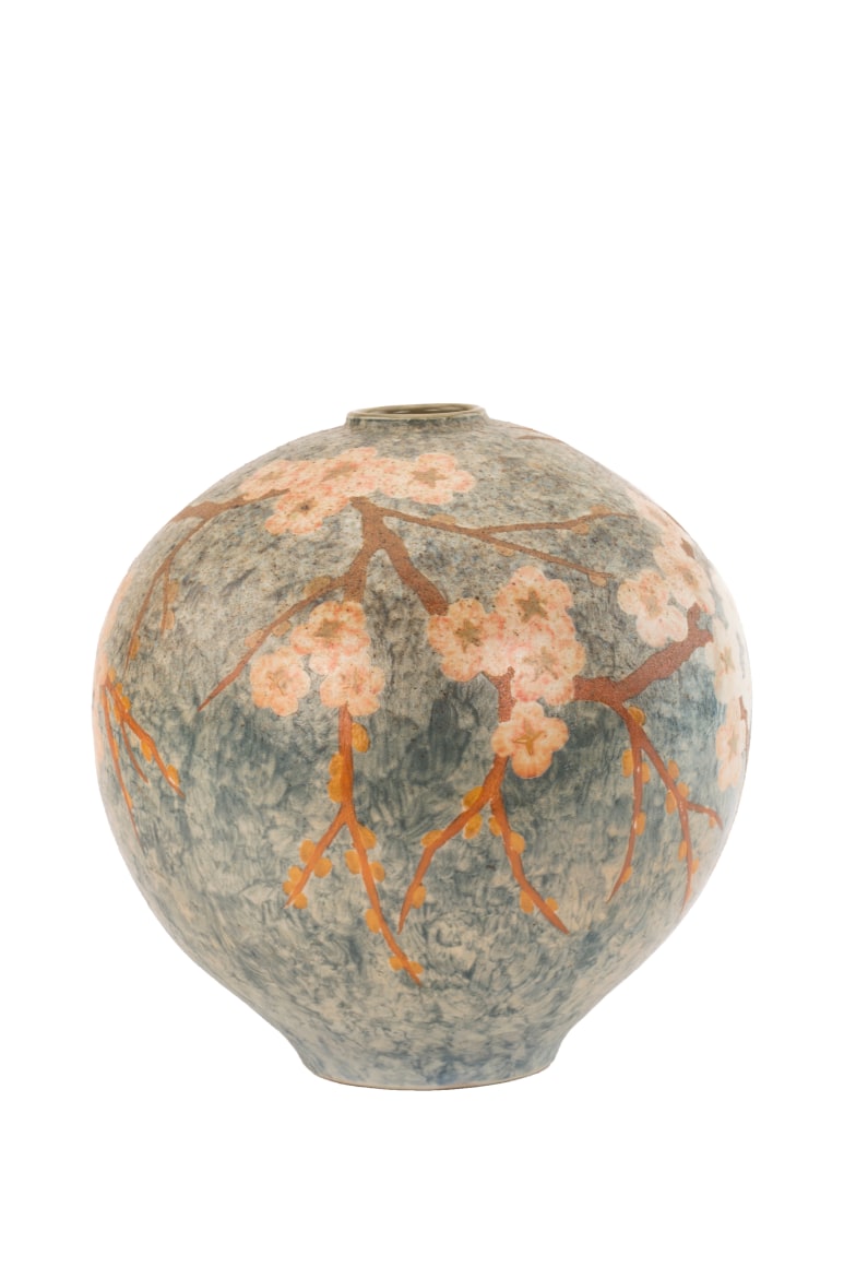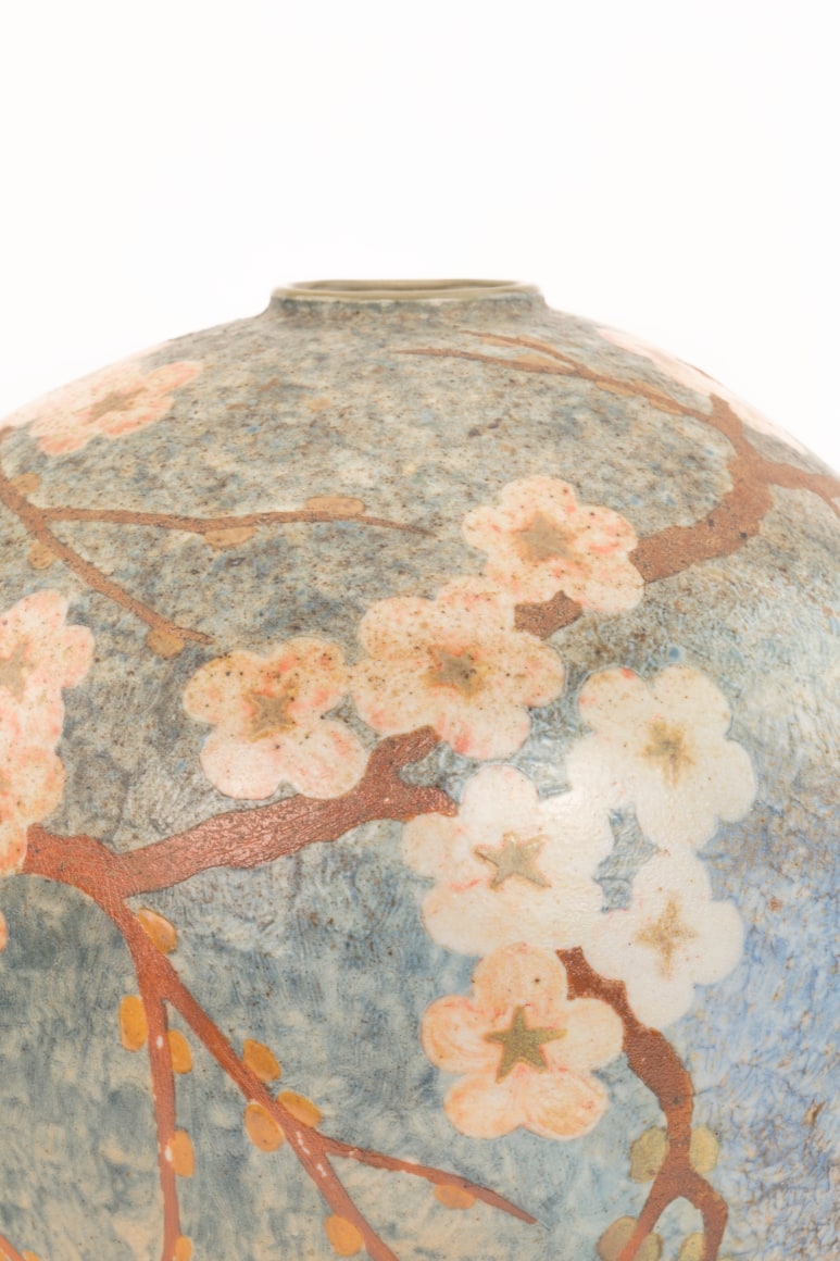 An American contemporary wheel thrown, slip-decorated, and wood fired Art Nouveau inspired vase by ceramist Douglas Breitbart decorated with all over pink-white cherry blossoms in various stages of growth growing off glazed browm branches against blue-grey glazed background with a fully glazed interior. The vase is signed, "Breitbart 12"