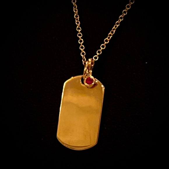 14 Karat Yellow Gold Dog Tag Pendant further decorated with a bezel set Ruby Charm on a 14 Karat Yellow Gold Chain