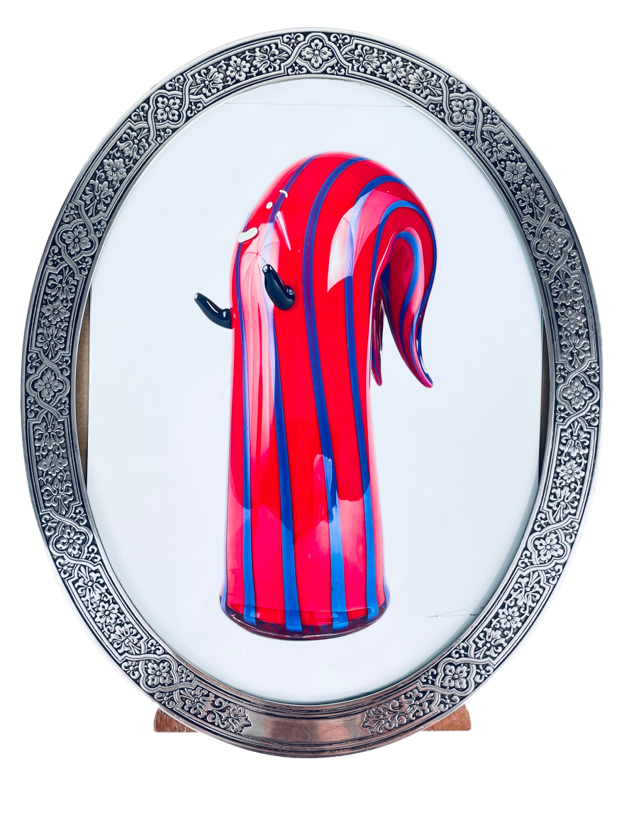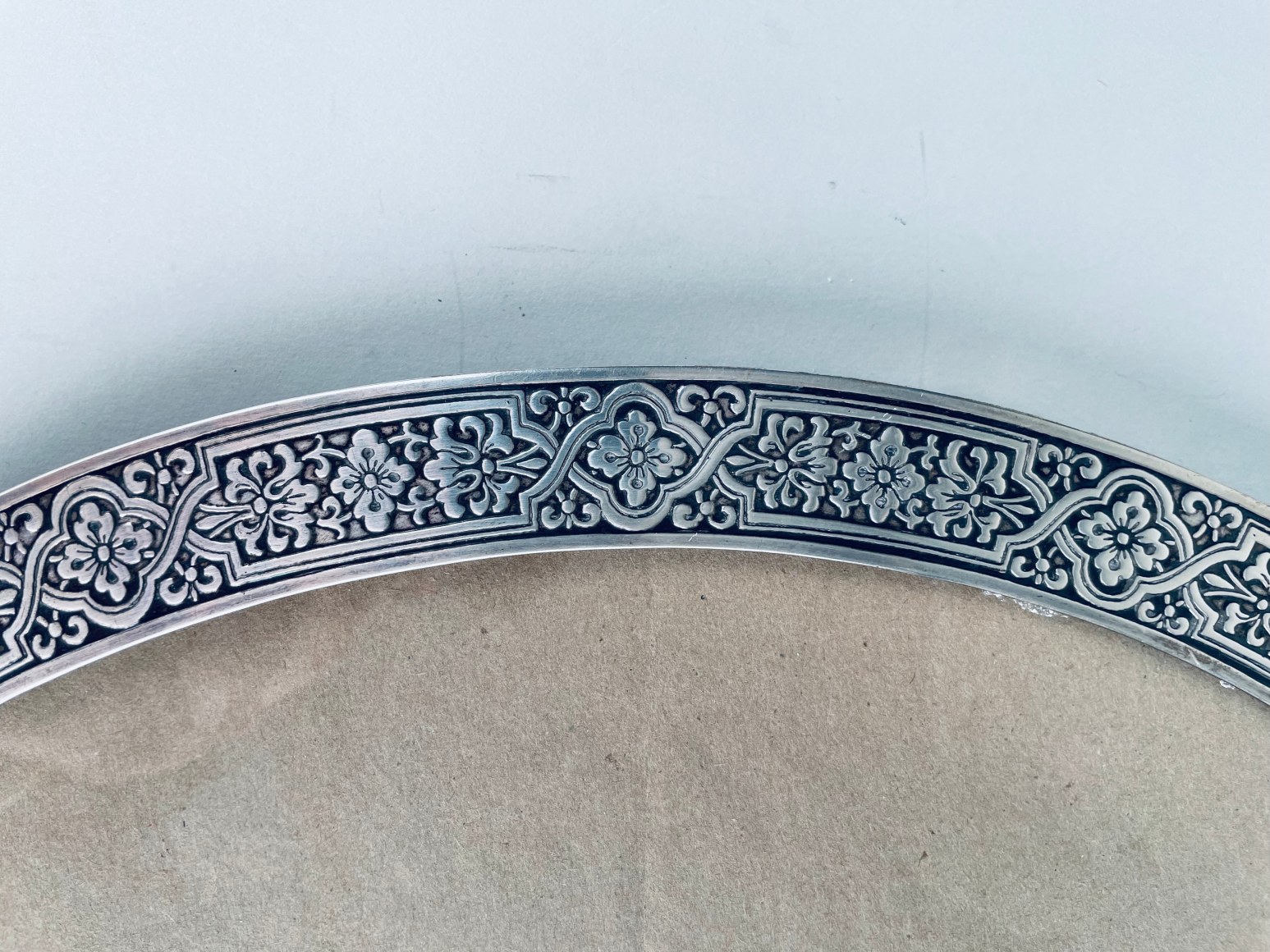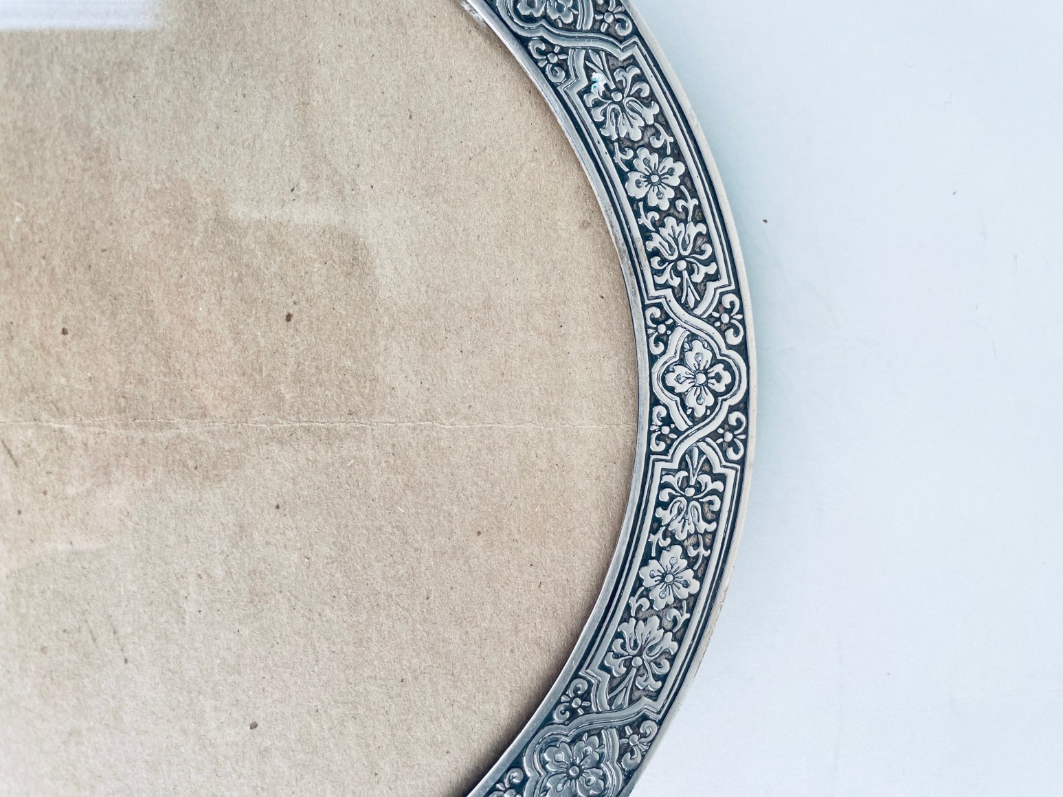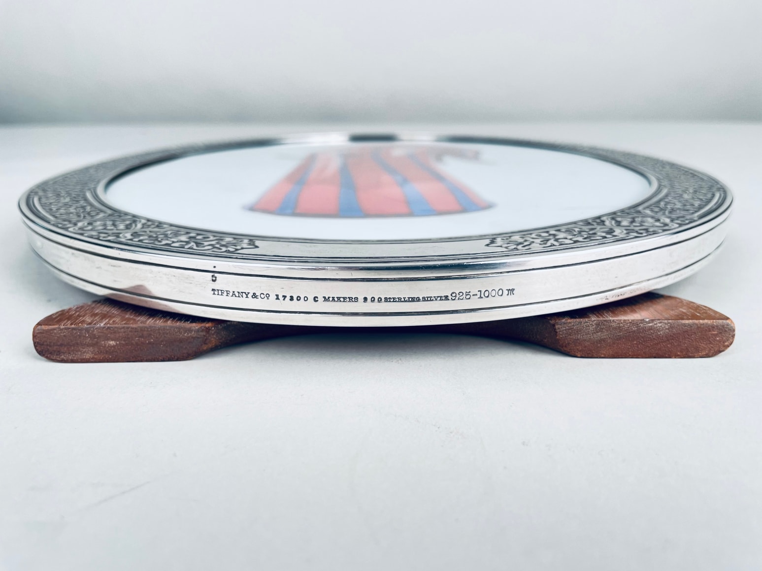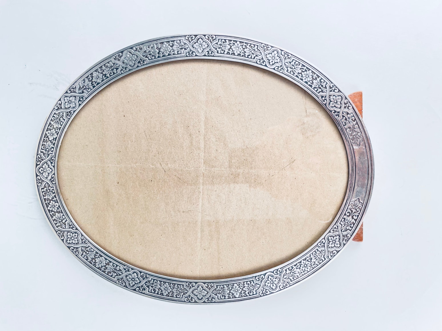 An Early 20th century American Art Nouveau sterling silver and wood Oval picture frame by, Tiffany & Co. with hand chased scroll motif throughout, without monogramming, retains its original wood and sterling back. The frame is signed Tiffany & Co. 17300 C Makers 900 Sterling Silver M - Circa 1910