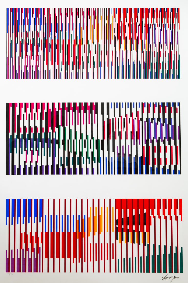 Yaacov Agam was born in Rishon-le-Zion, Palestine (now Israel), in 1928, the son of a rabbi and kabbalist, Yehoshua Gibstein. He studied at the Bezalel Academy in Jerusalem under Mordecai Ardon in 1946, moved to Zurich and then Paris, and studied at the Atelier d'art abstrait and at the Académie de la grande chaumière. While in Zurich, he met and was influenced by artist and teacher Johannes Itten, who was propagating Bauhaus ideas; he also found inspiration in Vasily Kandinsky's defense of abstraction, ber das Geistige in der Kunst. Insbesondere in der Malerei (On the Spiritual in Art: And Painting in Particular, 1911).