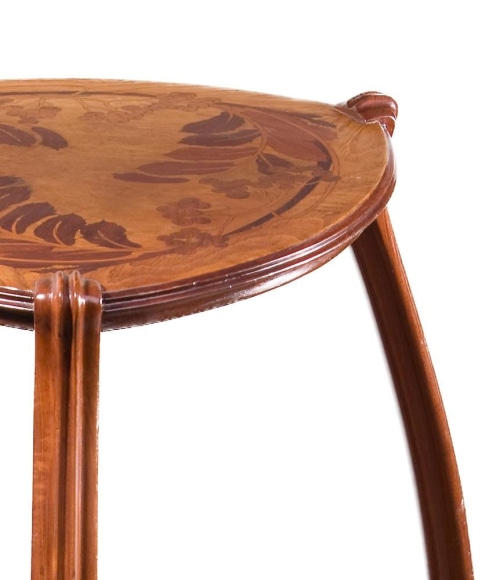 A French Art Nouveau tri-cornered and bow-legged table by Louis Majorelle, featuring an inlaid marquetry top with leaf and berry exotic wood marquetry decoration. The table is signed, "L. Majorelle Nancy."