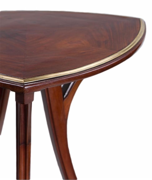 A French Art Nouveau two-tier tri-cornered carved wood table by Louis Majorelle, decorated with a bronze edge on the top tier further decorated with bronze sabots at the feet.