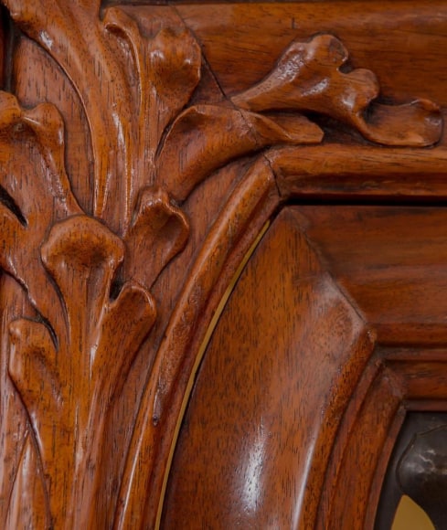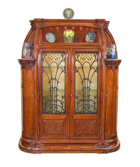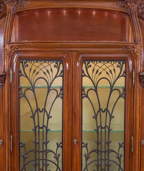 An important and rare French Art Nouveau carved wood, glassand wrought iron "Aux Algues" (seaweed) cabinet by, Louis Majorelle with carved seaweed motif throughout, further embellished with wrought iron inserts with in the two front double doors retaining its original whiplash keys.