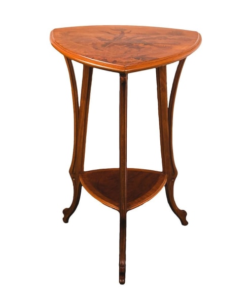 A French Art Nouveau carved wood & marquetry two-tier tri cornered table decorated with various exotic wood thistle marquetry decoration. The table is signed, "gallé."