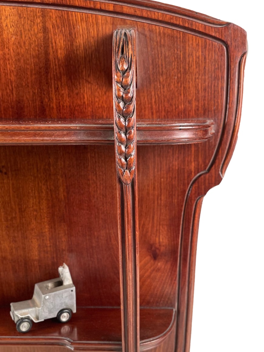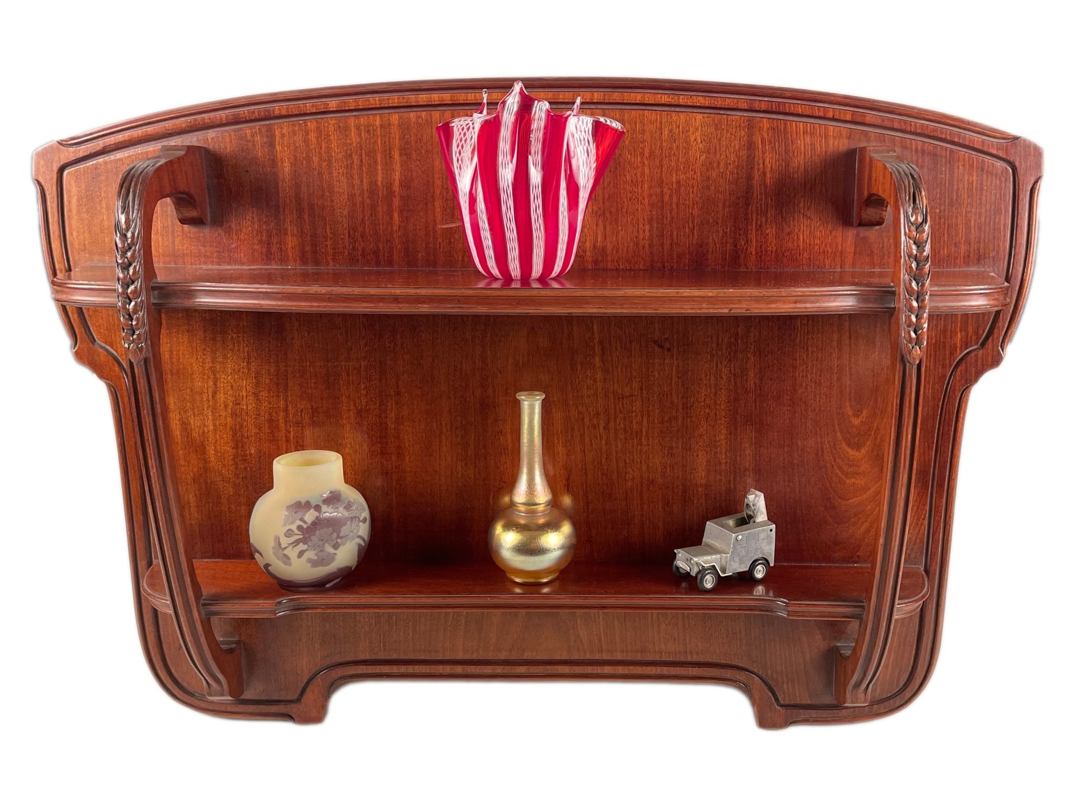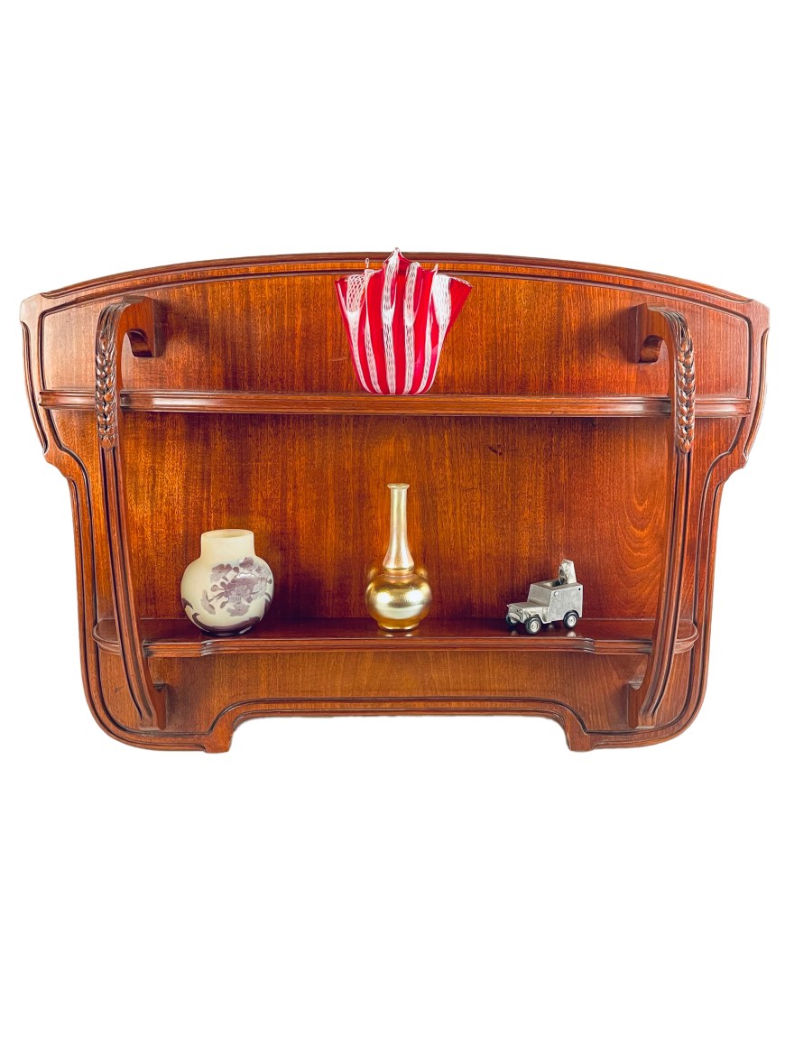 Early 20th Century French Art Nouveau carved wood "Les Blés" (The Wheat) pattern wall shelf by, Louis Majorelle decorated with two shallow display shelves further carved with "Les Blés" (Wheat) decoration on each bend. The shelf is ready to hang. circa 1905.