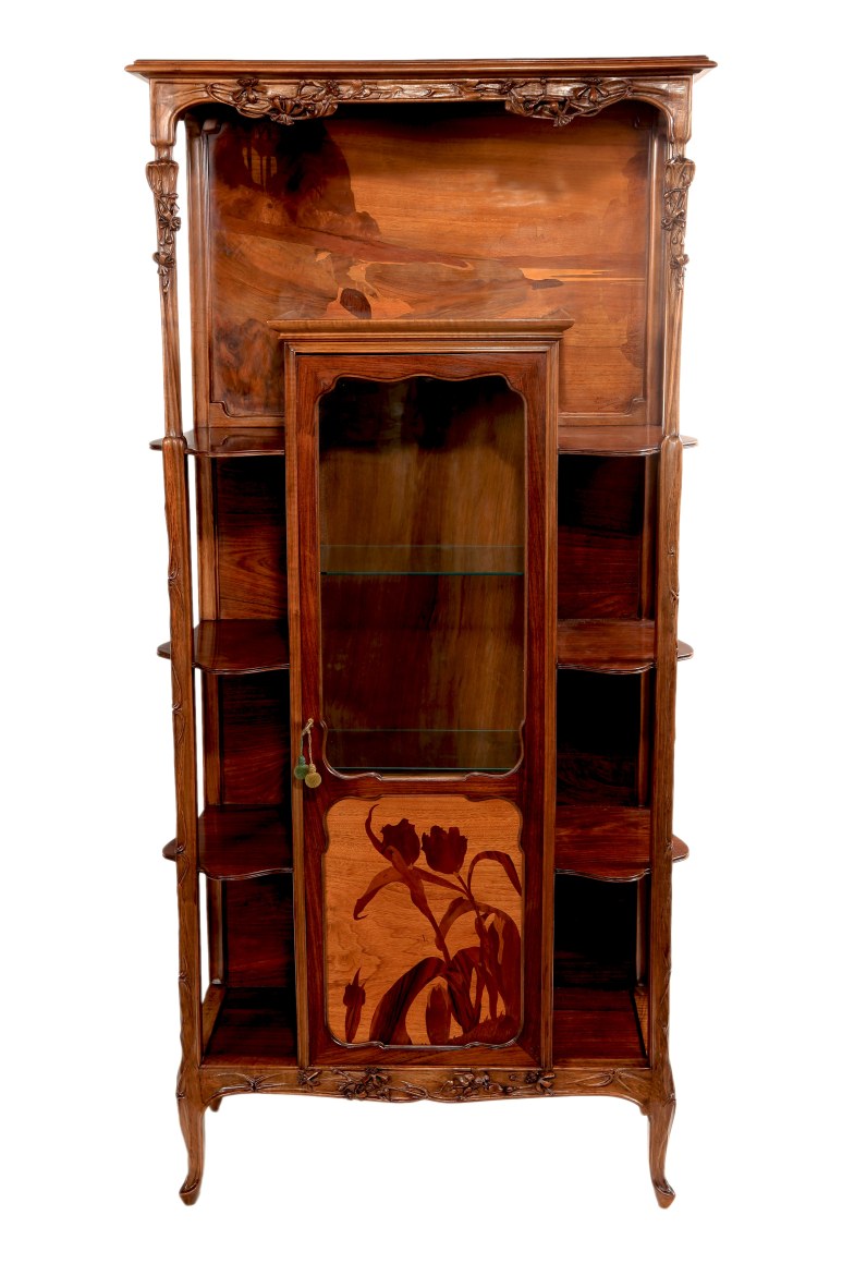 A fine and rare French Art Nouveau carved wood and exotic wood marquetry étagère by, Louis Majorelle decorated with carved flora, marquetry scenic landscape and tulip marquetry decorated door. The étagère is signed, "L. Majorelle, Nancy"