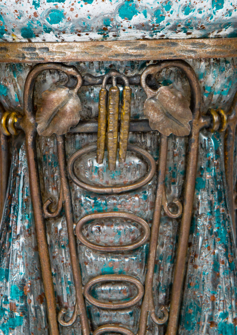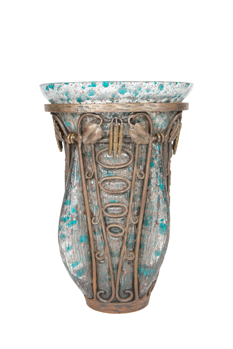 An Art Deco blown glass & wrought iron vase by, Daum Nancy & Louis Majorelle decorated with clear rippled glass (which gives the appearance of water) further decorated with multi-color fractured glass blown with in the clear all blown out into a decorated wrought iron frame. The glass was blown by, Daum Nancy and the wrought iron mount was created by, Louis Majorelle. The vase is signed underneath, "Louis Majorelle" & "Daum Nancy France"