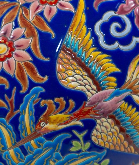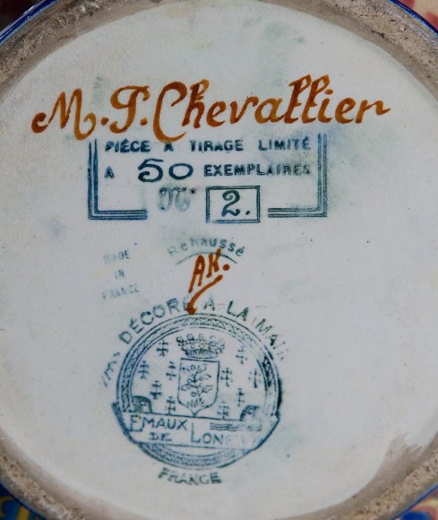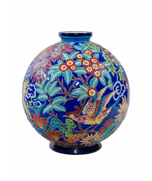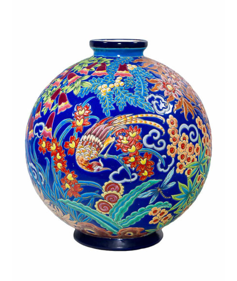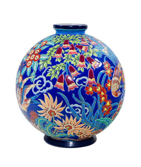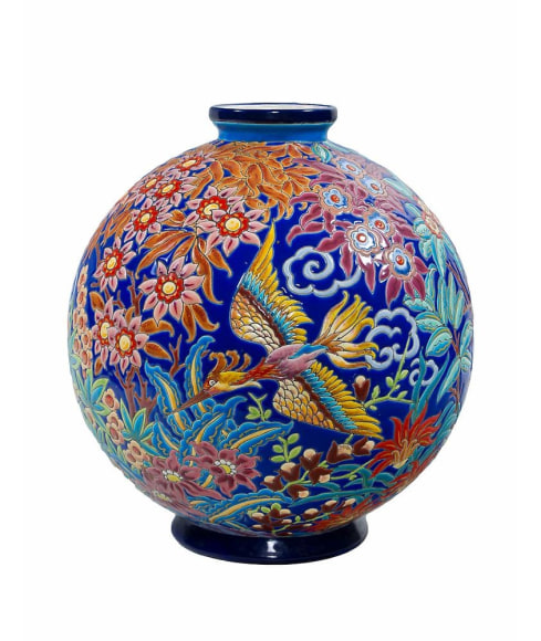 A rare French Art Deco ceramic & enameled "Boule Jungle Bird" (Jungle Bird Vase) ceramic vase designed by, Maurice Paul Chevallier for Faïences de Longwy decorated in a crackle glaze of vibrant colors and gilt, with a frieze of exotic foliage, dragonflies and a jungle bird in various stages of flight. The vase is signed "M.P. Chevallier" and furhter marked "Of 50 Examples this is N. 2"