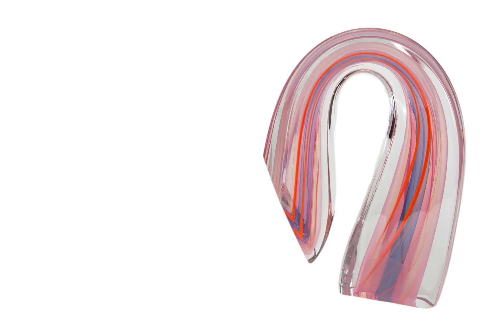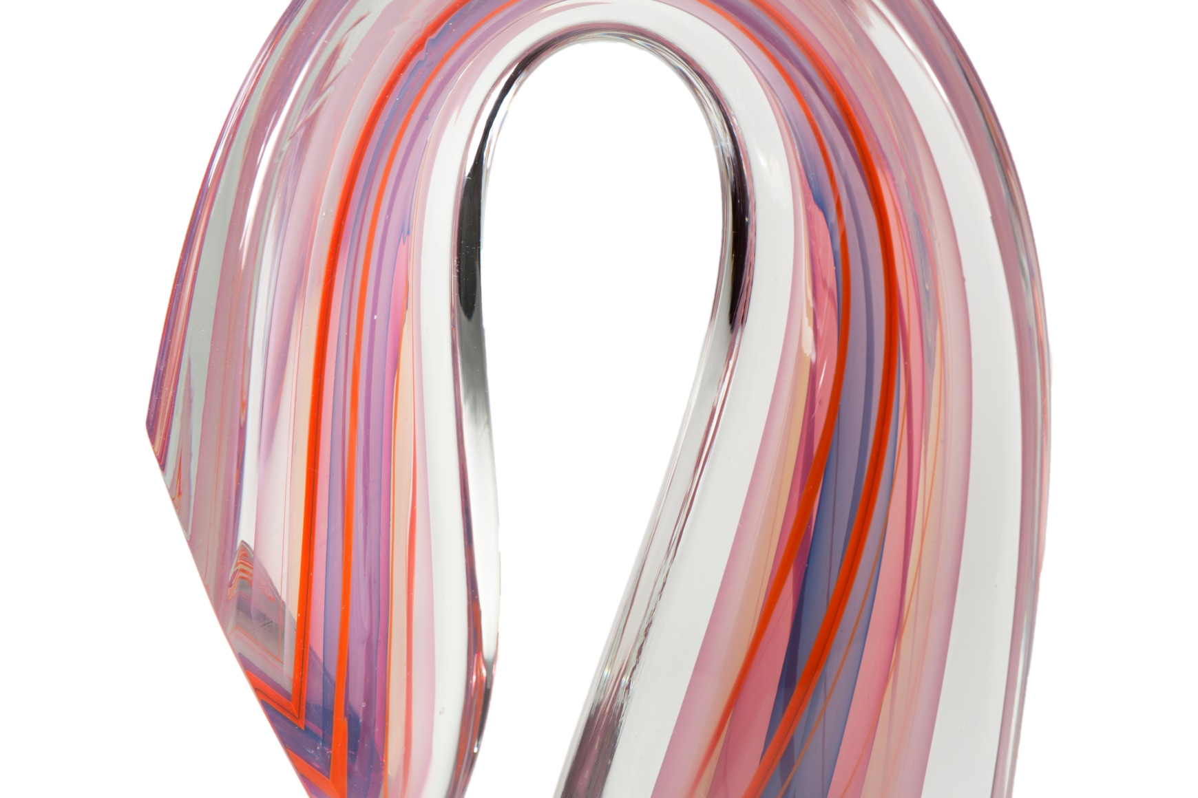 An American Studio Glass Movement Glass Sculpture titled "Descending Form" by, Harvey K. Littleton consists of blown overlay, colored glass in colors of purple, pink, lilac, and orange cased in a heavy clear glass overlay and further cut and polished. The piece is signed, "©Harvey K. Littleton 11-1989-3"