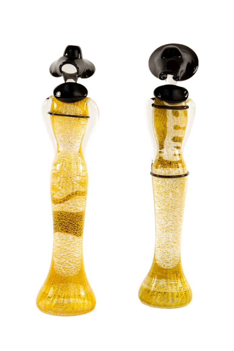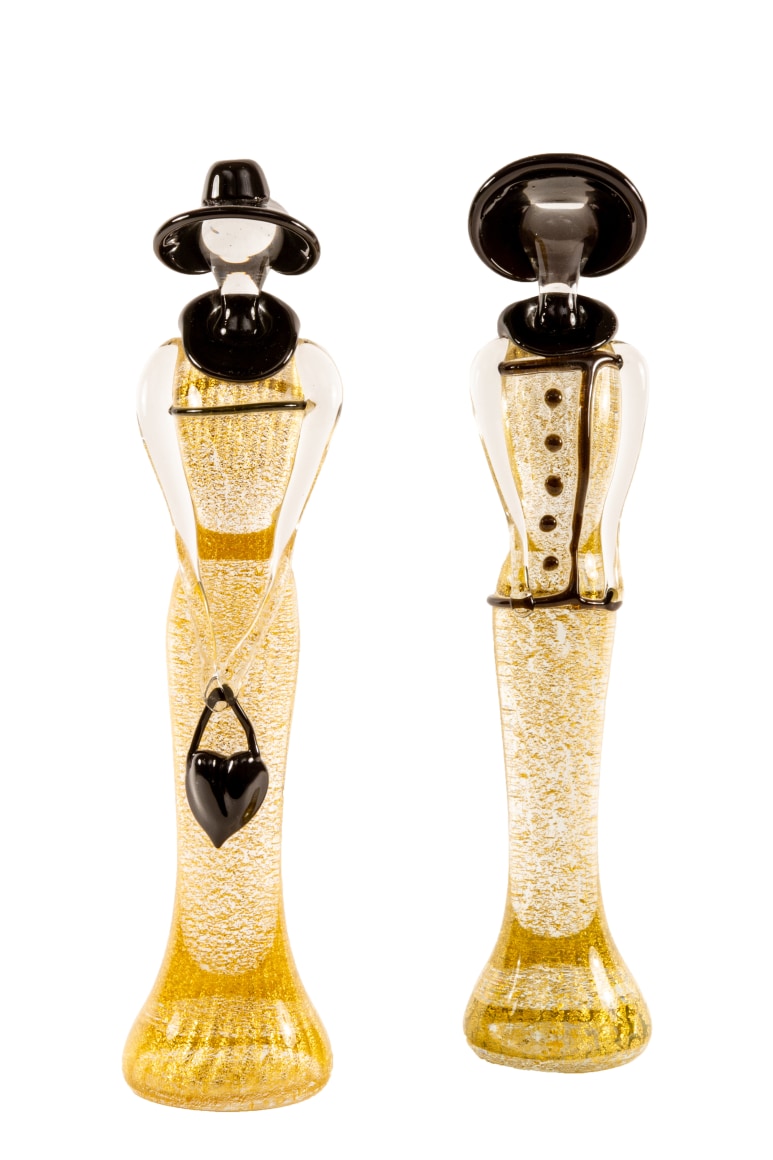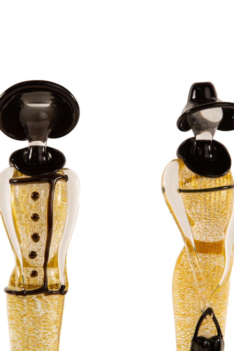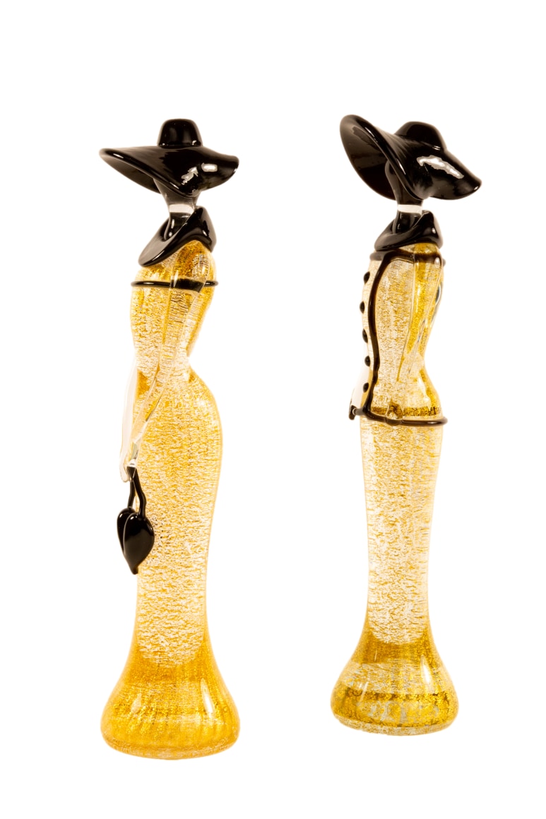 A pair of Mid-Century Modern Italian blown glass sculpture figurines by, Mario Badioli for Ogetti. Each figurine in 1920s' style depicts two females; one figure wearing a large black hat and buttoned blouse and the other figure with a purse. The bodies are transparent with fleck metallic gold cased in clear throughout They are each signed with etched signature on the underside "Badioli M".