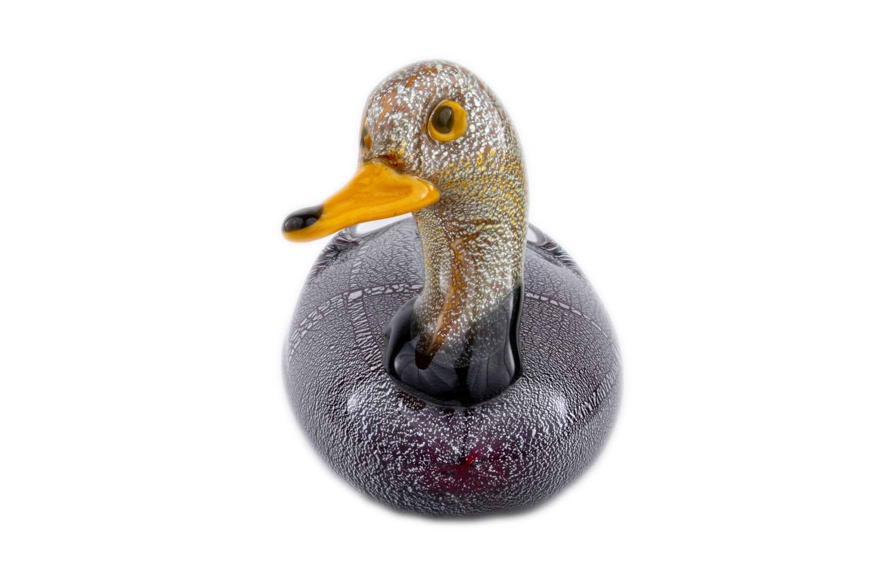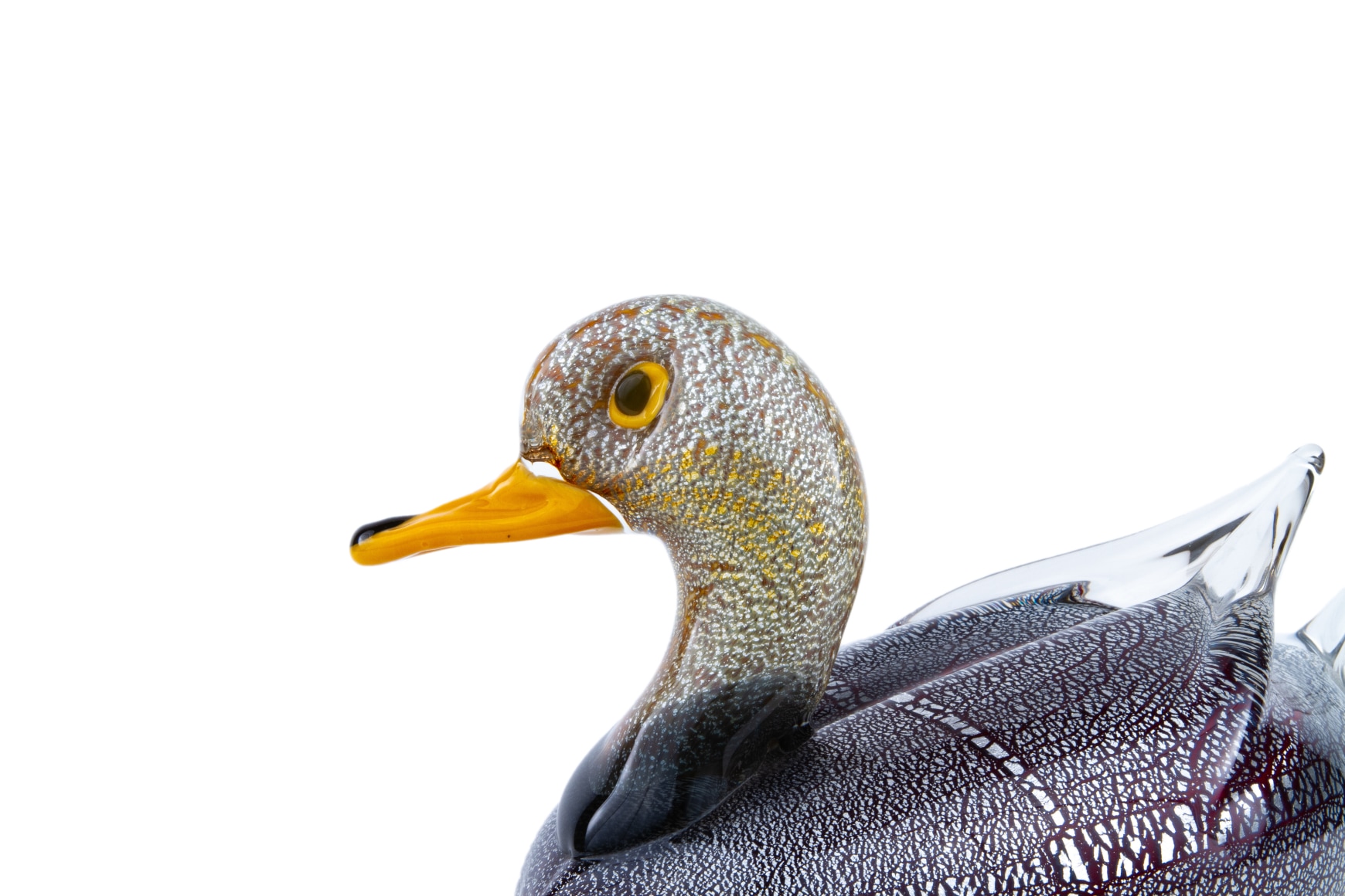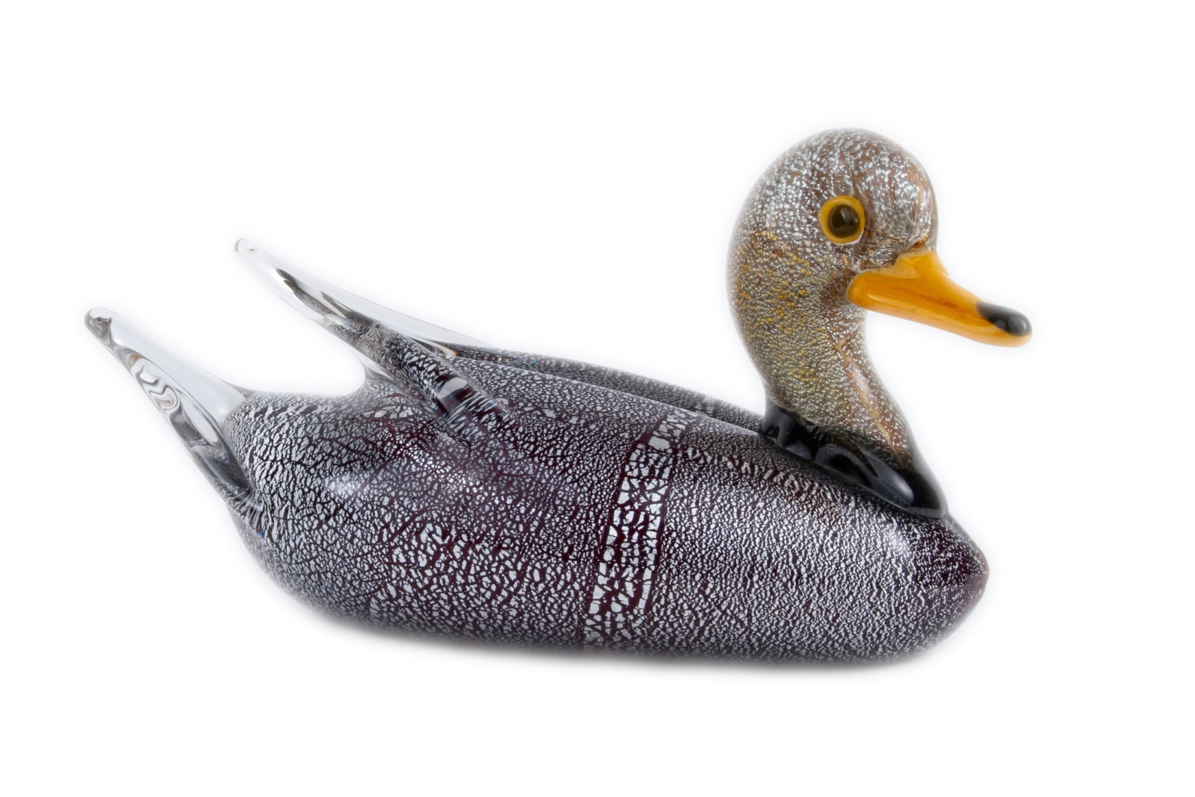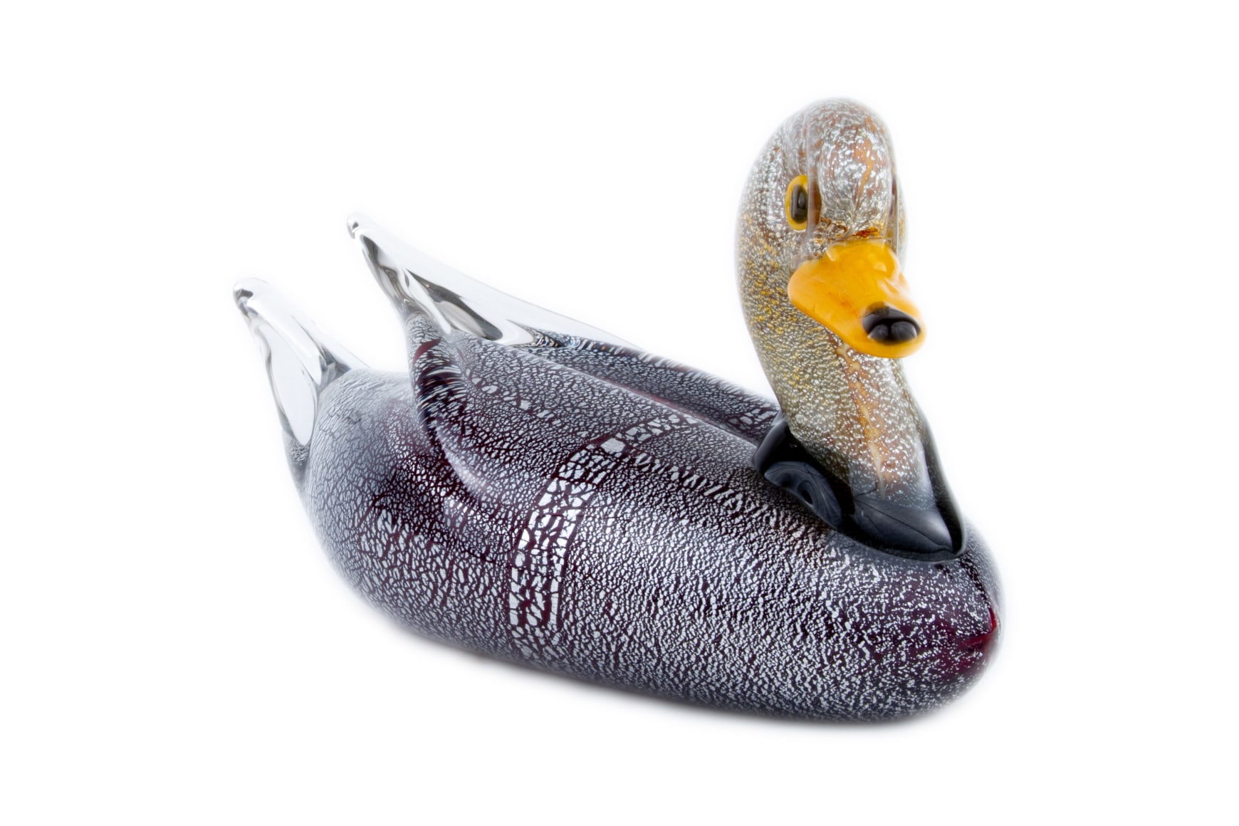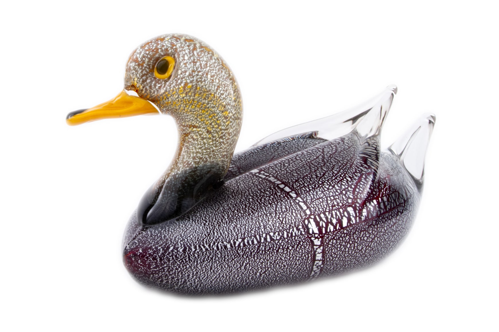 A Mid-Century Modern Italian glass "Anatra Selvatica" (Mallard Duck) sculpture beleived to be designed by, Ferro Toso for decorated in a black and silver foil decoration with deep red coloration throughout in the body and further decorated with silvery - gold coloration of the head with applied eyes and beak all cased in a thick layer of clear glass.