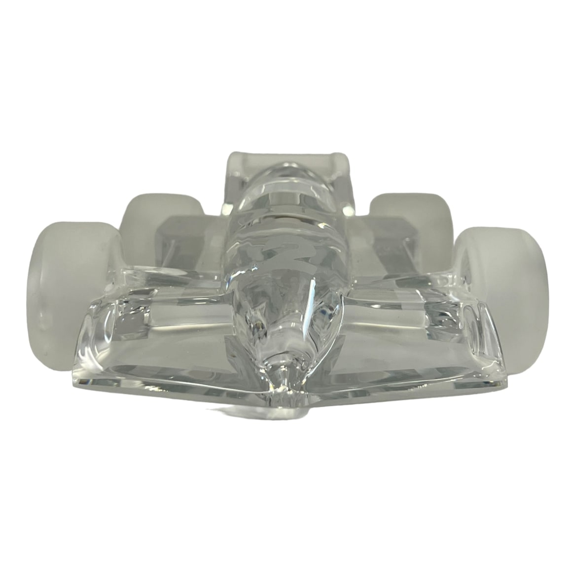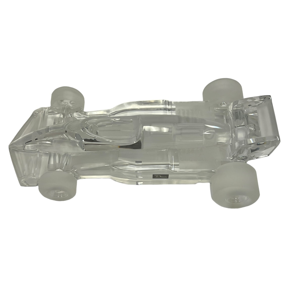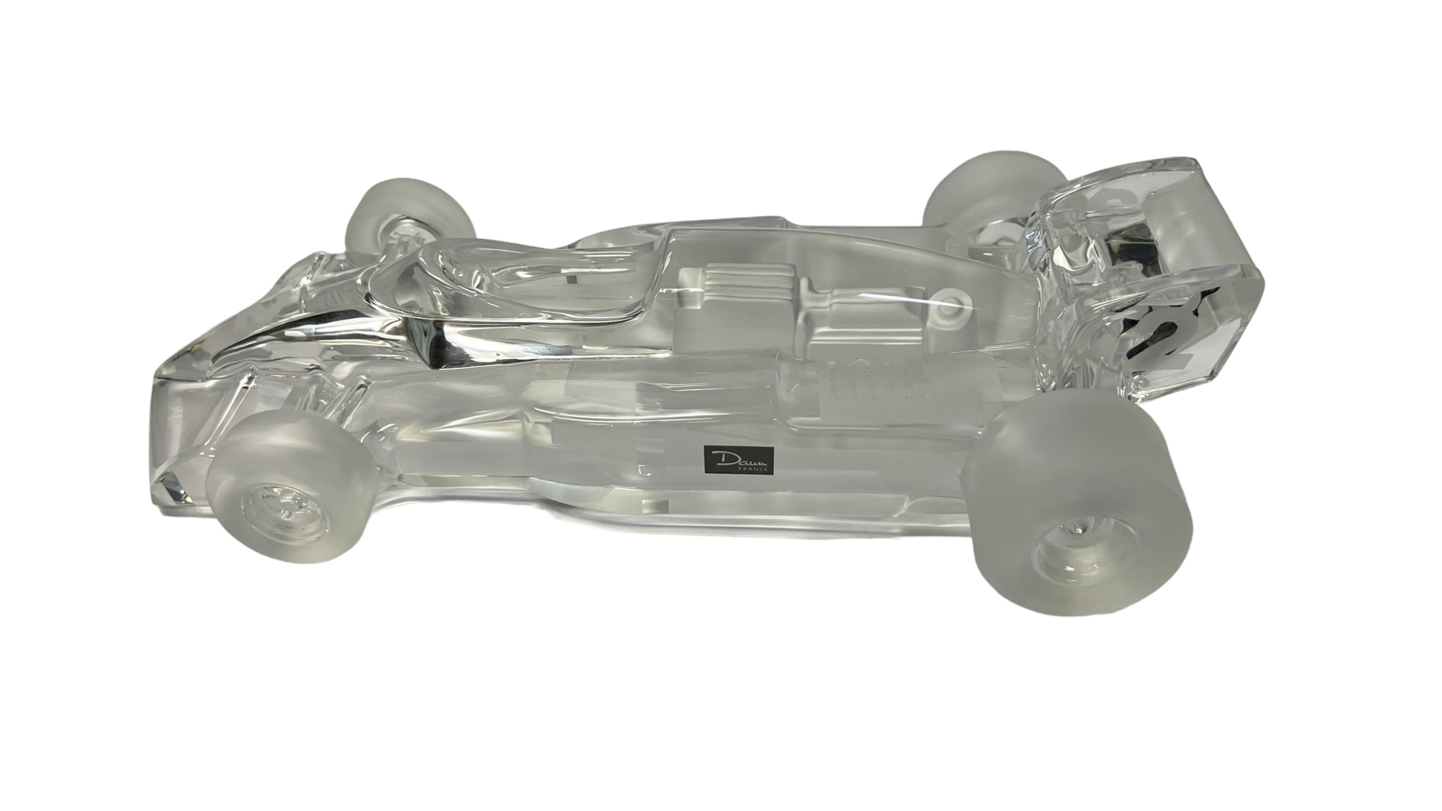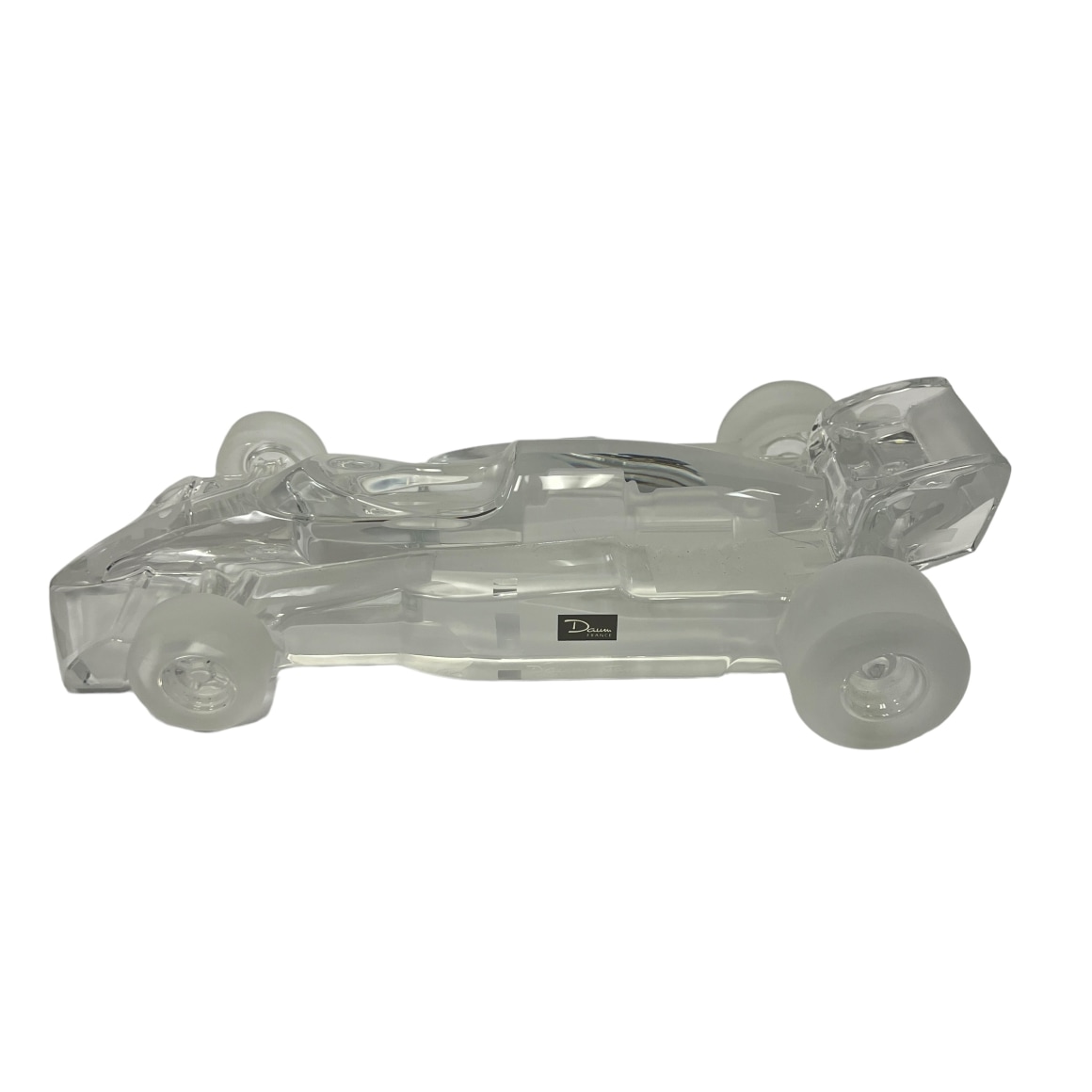 A French Late 20th Century Crystal "Grand Prix" Formula 1 race car designed by Xavier Froissart and made by Daum, France, circa 1985. The racer is a mixture of frosted and polished glass depicting the realness of a Formula 1 Race Car. The Grand Prix Racer is also further etched with the number "2" on the nose guard and on both sides of the rear fin. The Grand Prix #2 was the 5th of 13 Standard Large Automobiles Daum produced for general distribution. Designed by Xavier Froissart in 1988, this model personified speed and technology.