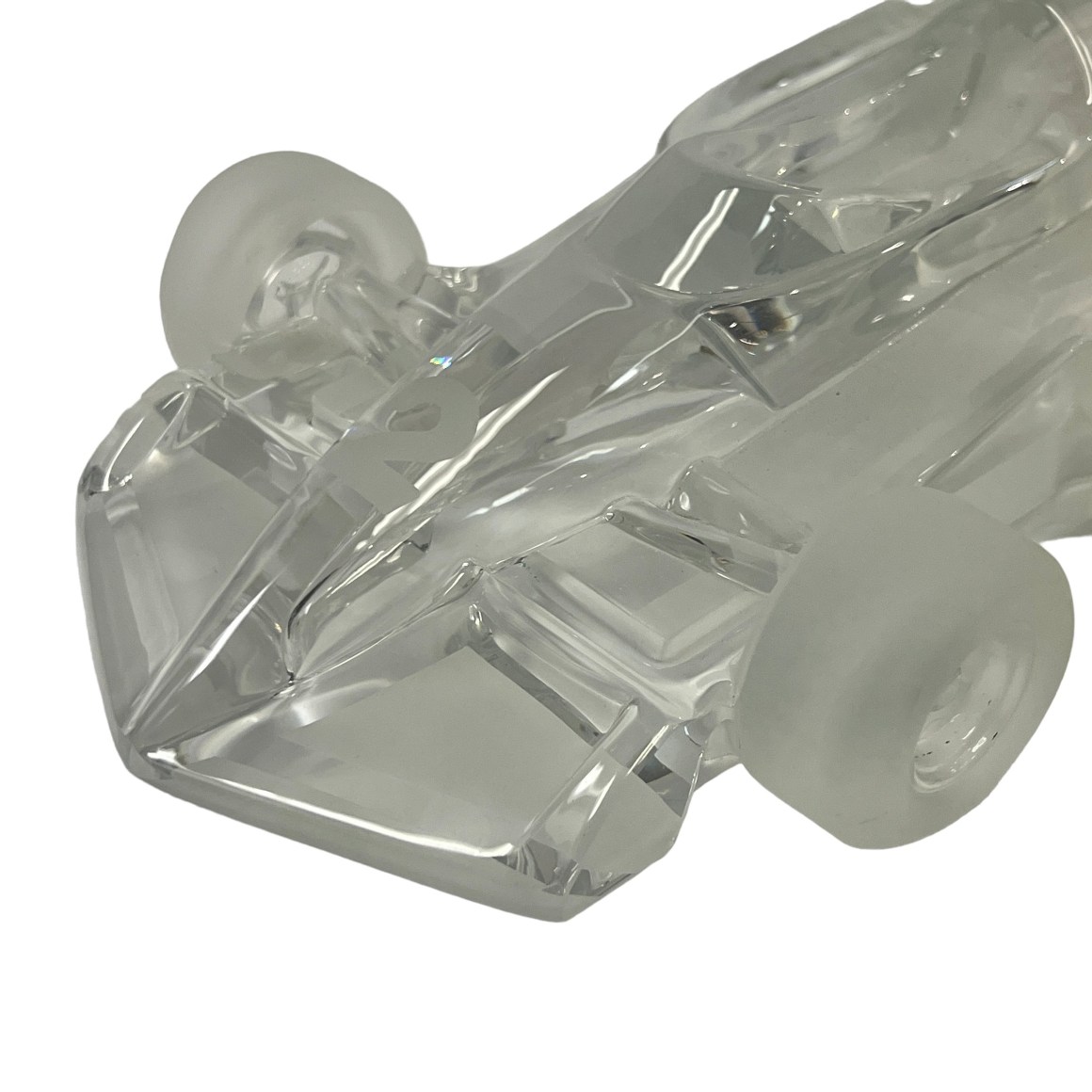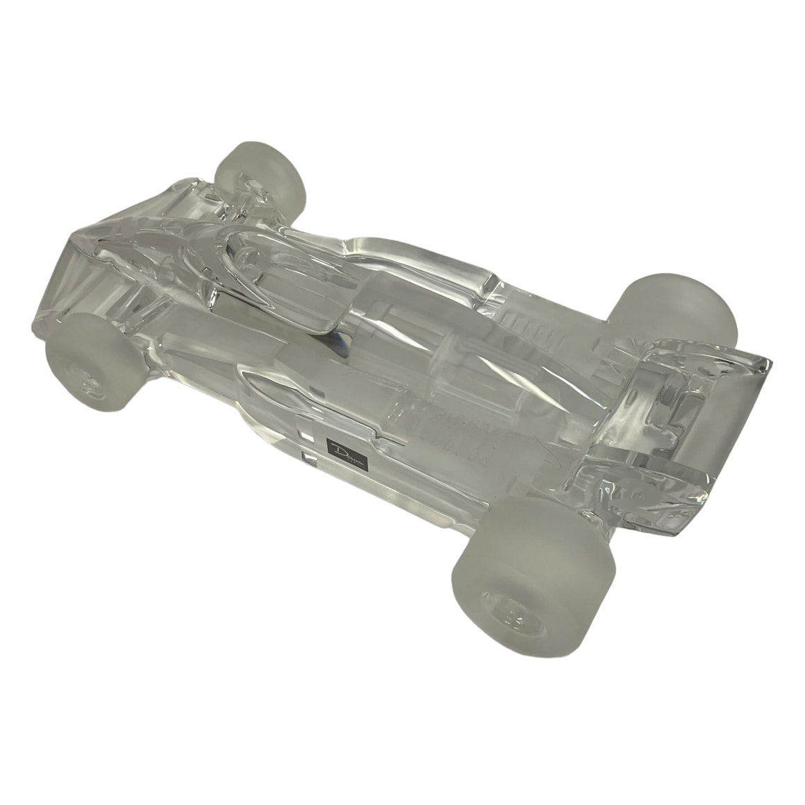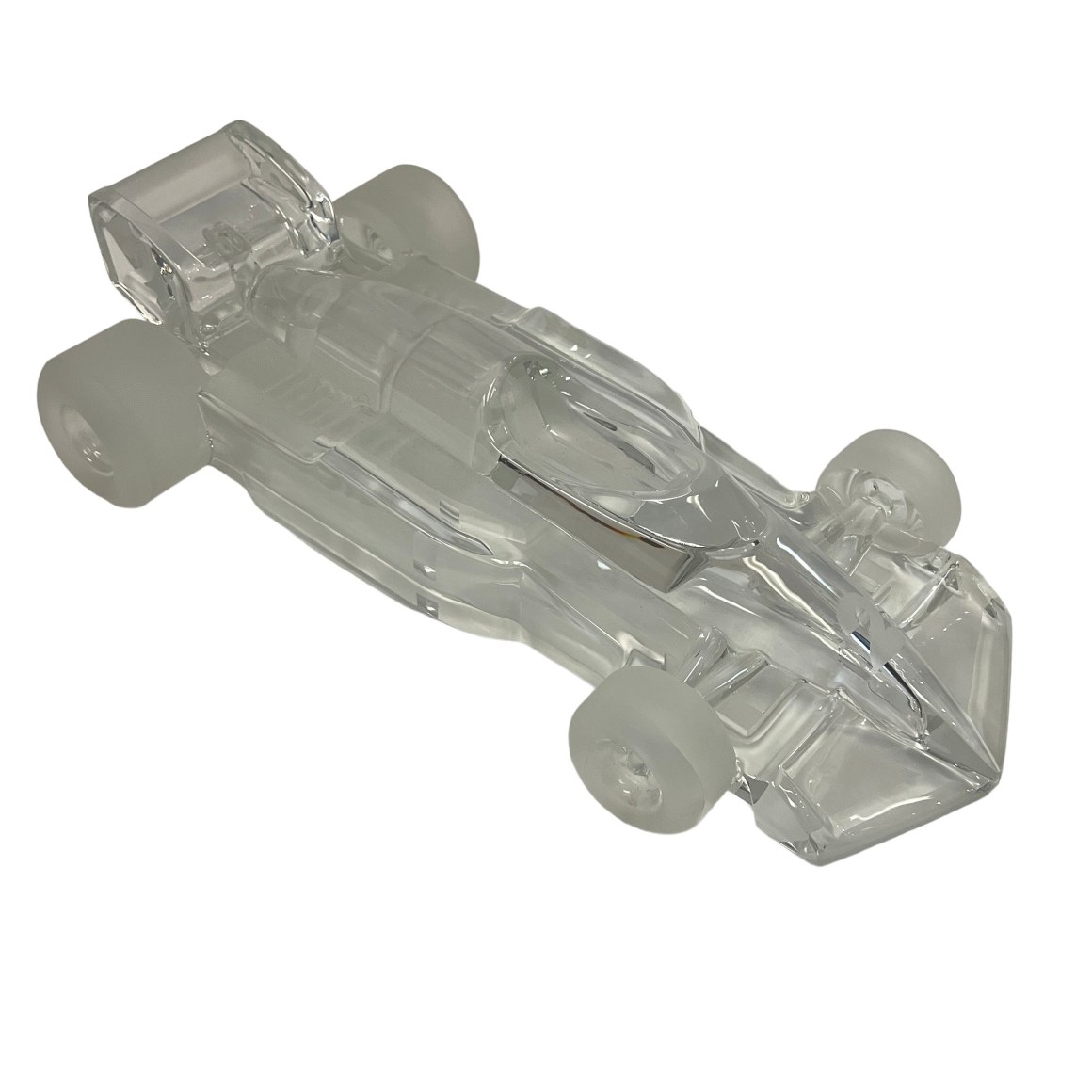 A French Late 20th Century Crystal "Grand Prix" Formula 1 race car designed by Xavier Froissart and made by Daum, France, circa 1985. The racer is a mixture of frosted and polished glass depicting the realness of a Formula 1 Race Car. The Grand Prix Racer is also further etched with the number "2" on the nose guard and on both sides of the rear fin. The Grand Prix #2 was the 5th of 13 Standard Large Automobiles Daum produced for general distribution. Designed by Xavier Froissart in 1988, this model personified speed and technology.