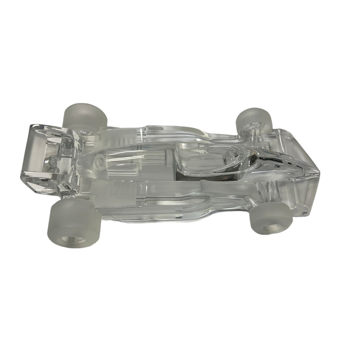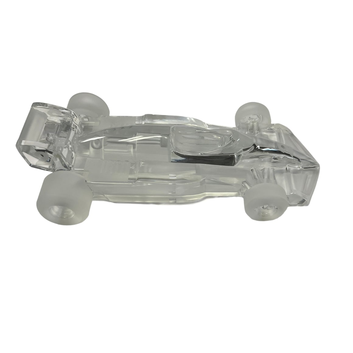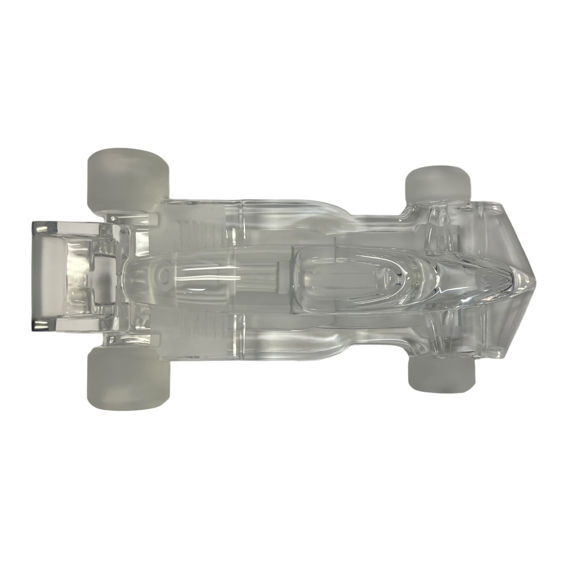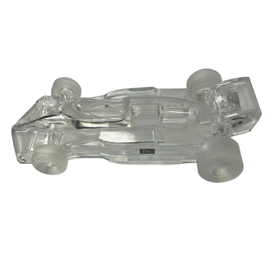 A French Late 20th Century Crystal "Grand Prix" Formula 1 race car designed by Xavier Froissart and made by Daum, France, circa 1985. The racer is a mixture of frosted and polished glass depicting the realness of a Formula 1 Race Car. The Grand Prix Racer is also further etched with the number "2" on the nose guard and on both sides of the rear fin. The Grand Prix #2 was the 5th of 13 Standard Large Automobiles Daum produced for general distribution. Designed by Xavier Froissart in 1988, this model personified speed and technology.