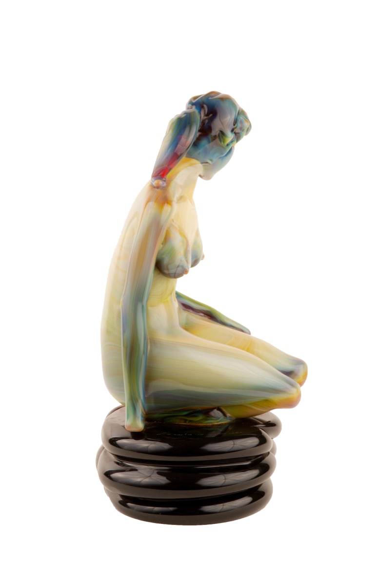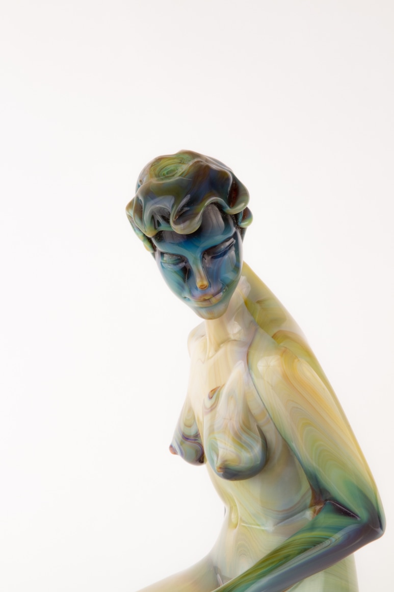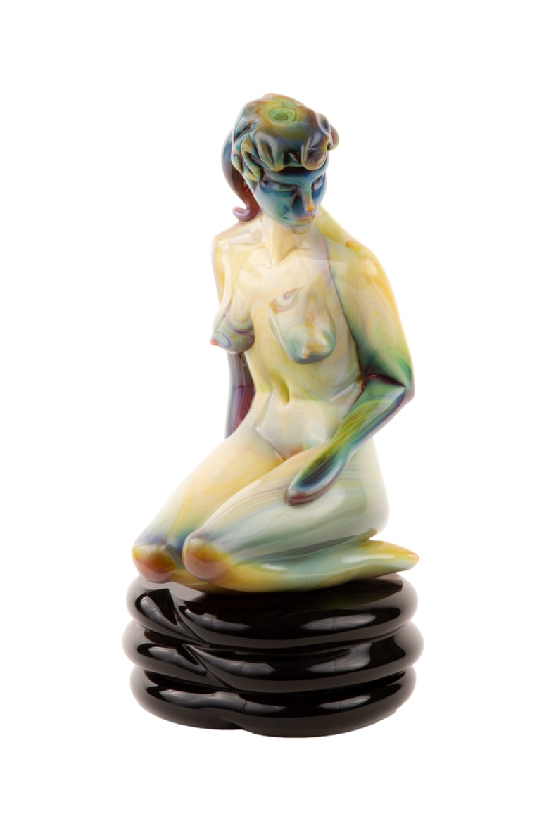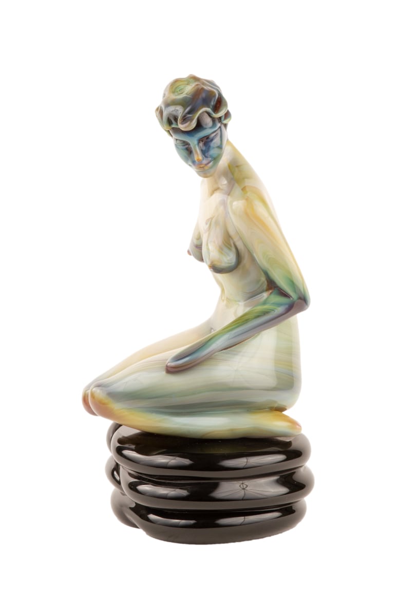 In Italian Mid-Century Modern "calcedonia" glass sculpture "Lorelei" by, master glass blower Loredano Rosin depicting a nude woman kneeling a top an applied green-black glass base. The sculpture is signed on the base, "Loredano Rosin"