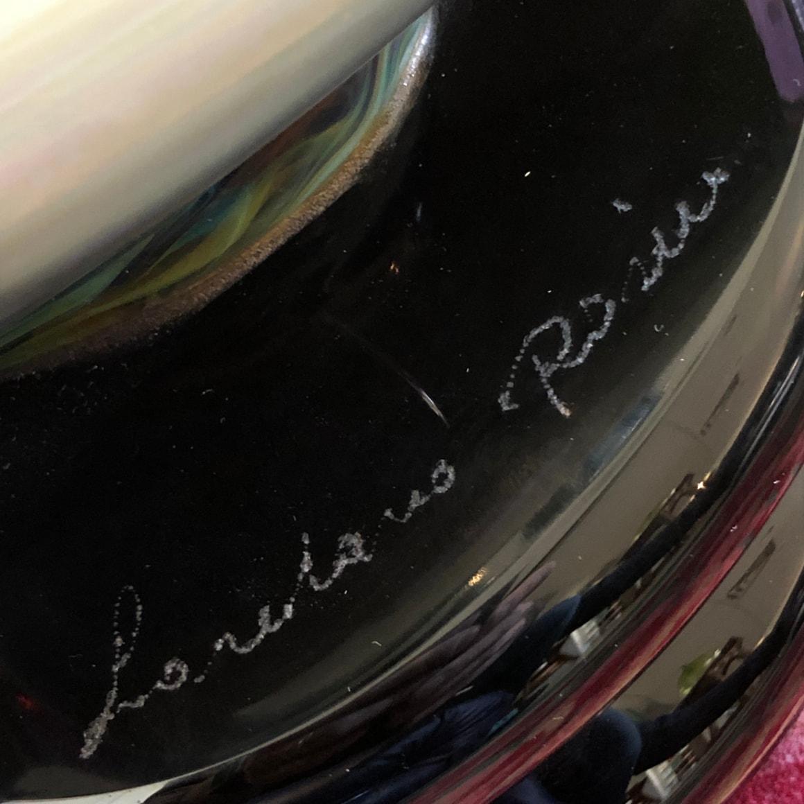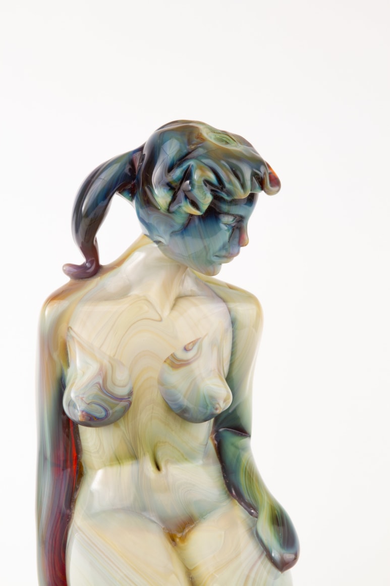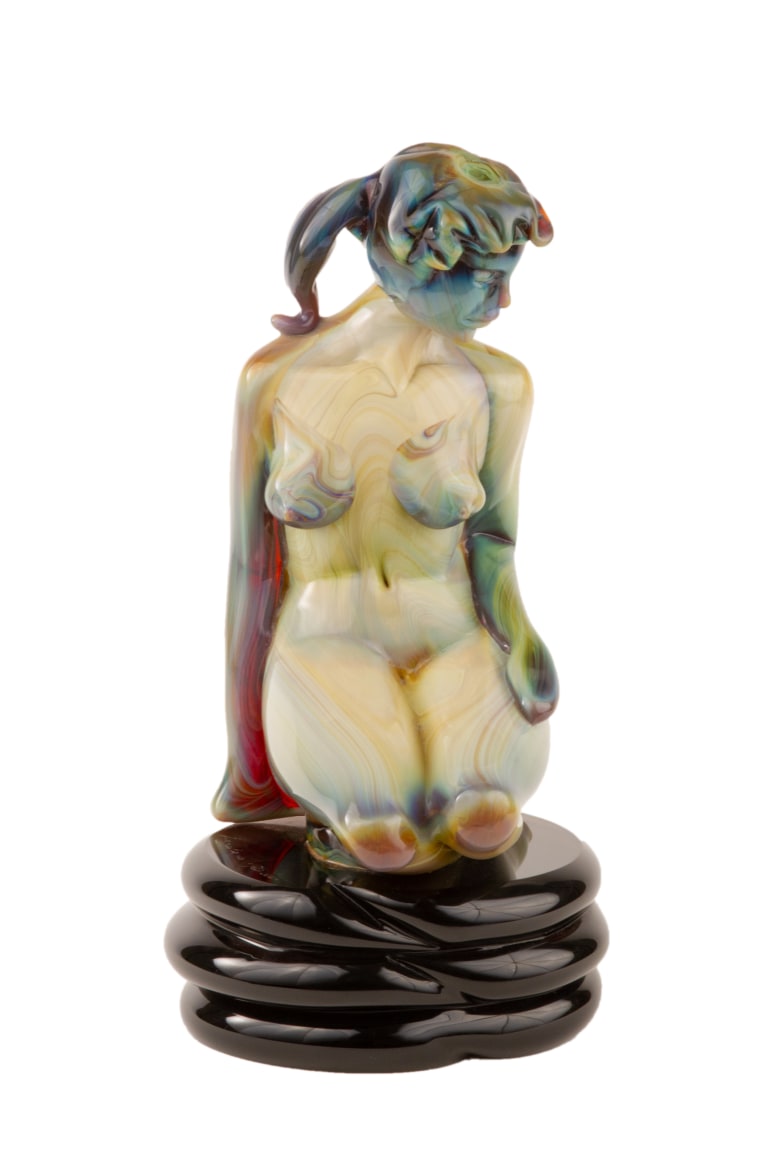 In Italian Mid-Century Modern "calcedonia" glass sculpture "Lorelei" by, master glass blower Loredano Rosin depicting a nude woman kneeling a top an applied green-black glass base. The sculpture is signed on the base, "Loredano Rosin"