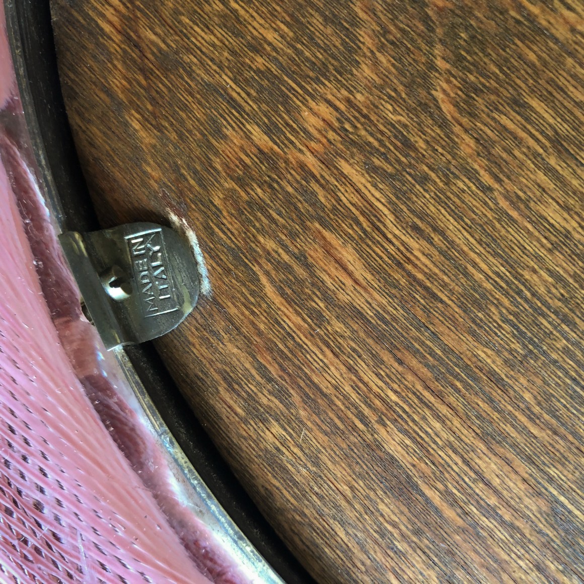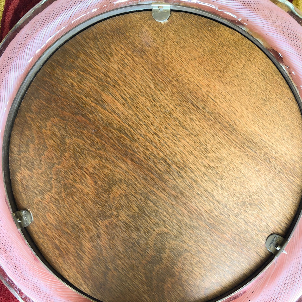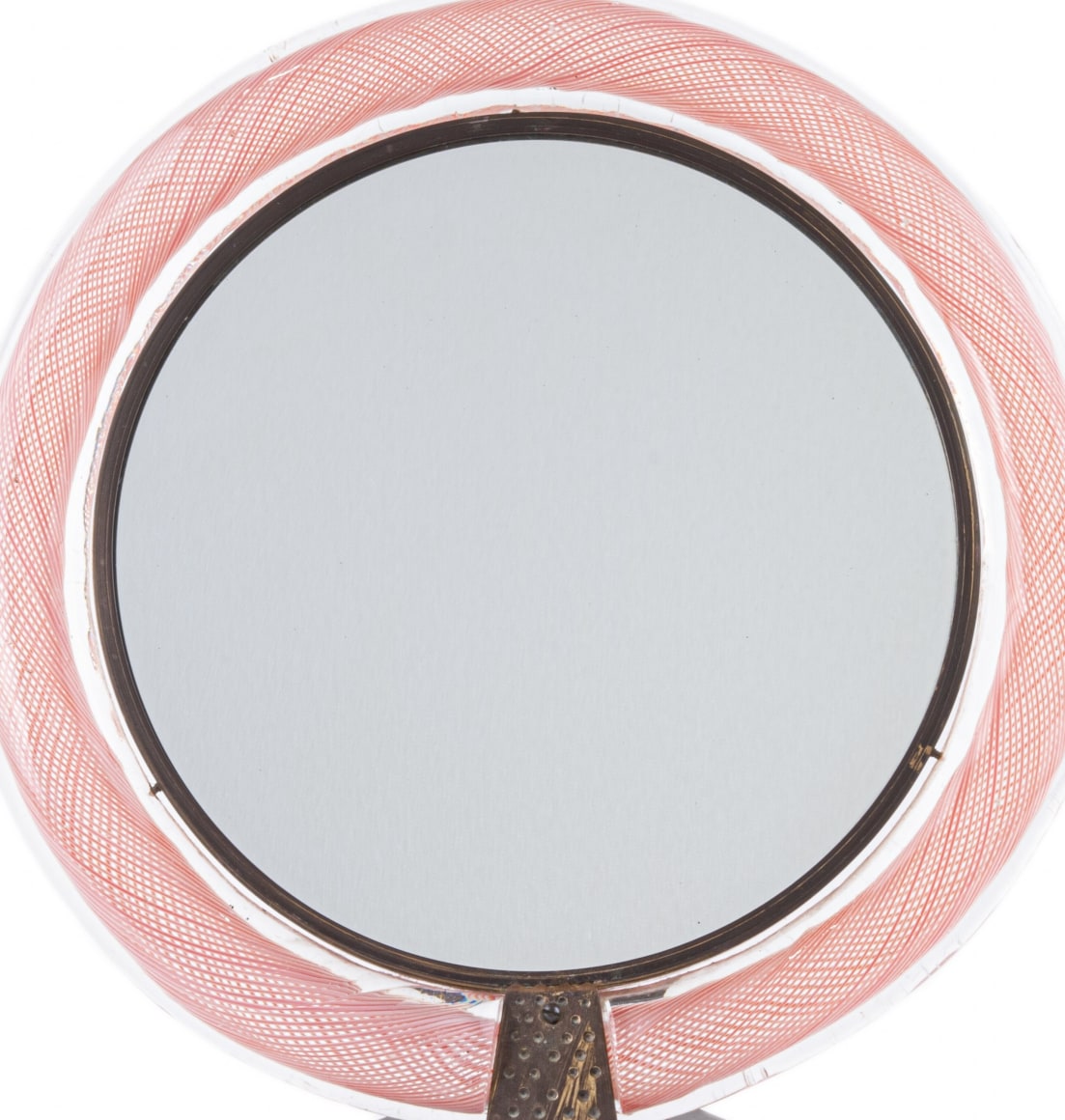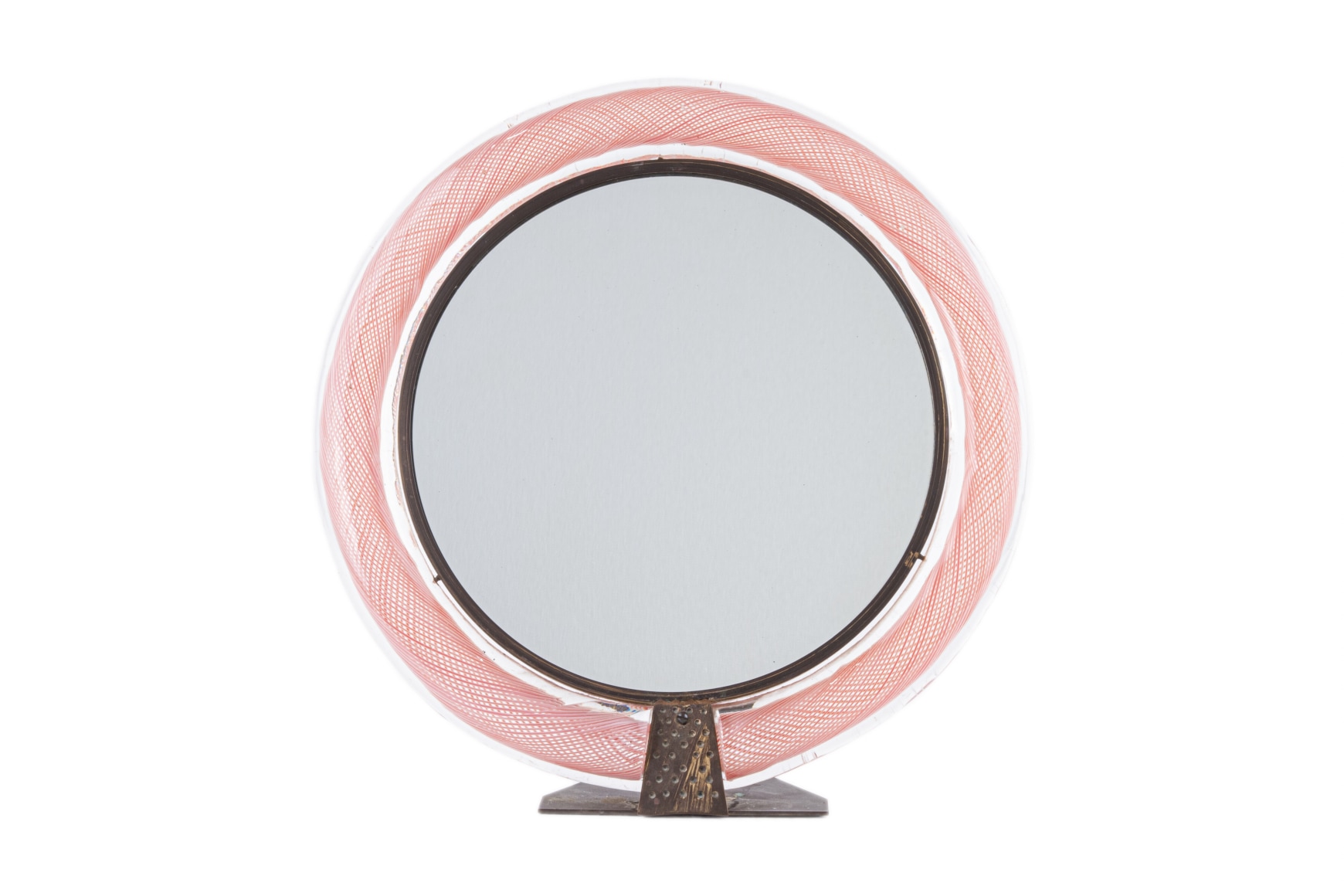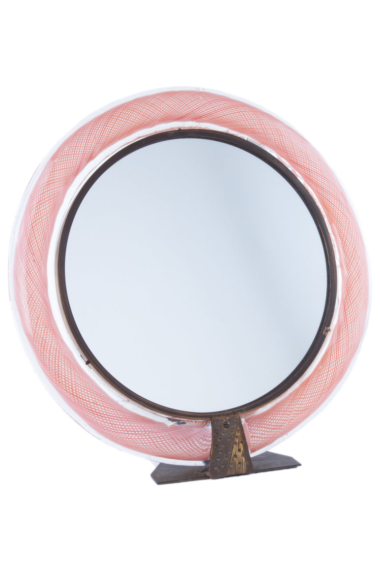 A fine Italian Mid Century Modern glass "Mezza Filigrana" vanity mirror designed by, Carlo Scarpa for Venini. The mirror frame is internally decorated with pink lattice decoration and further decorated with its original brass pedestal and mirrored glass. The mirror is signed on the back side "Made in Italy"
