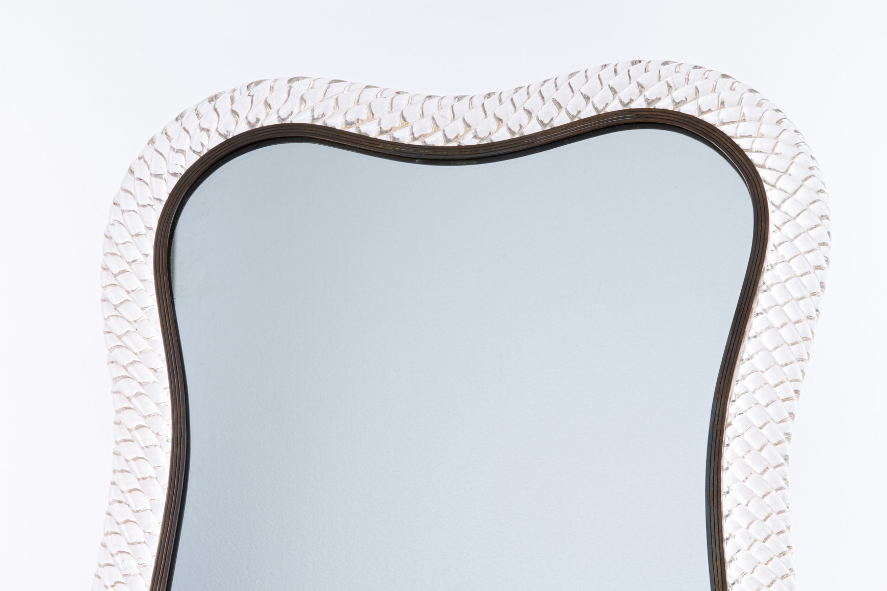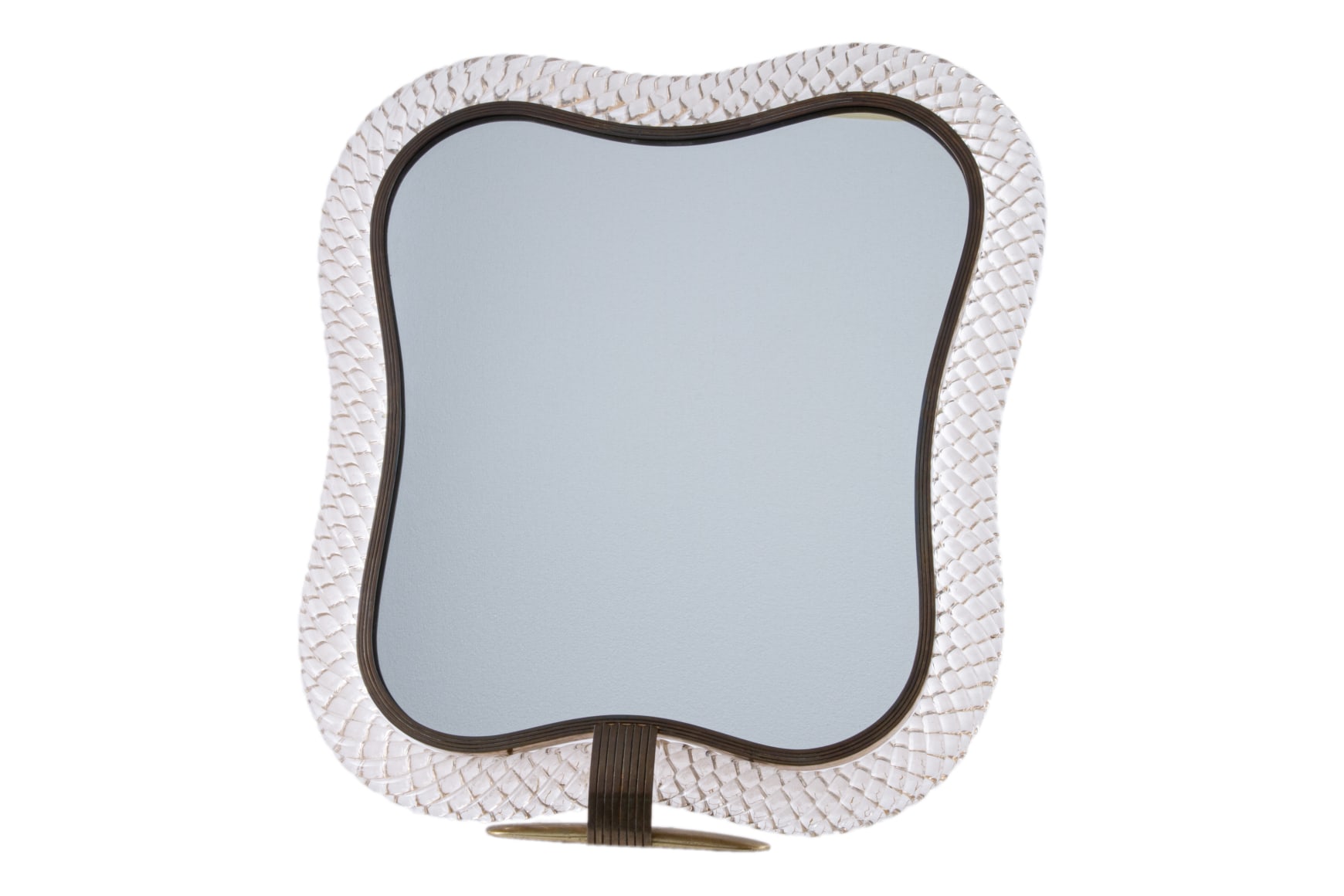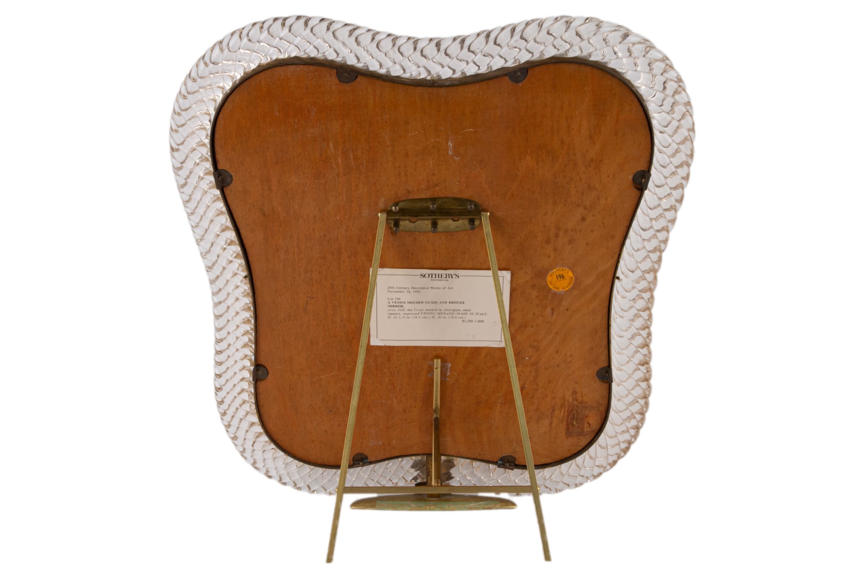 A Mid Century Modern Italian glass, brass and wood "Treccia" vanity mirror by, Murano Italian glass masters Venini. The mirror is decorated with a braided and molded clear glass frame with its original "Art Deco" inspired brass hardware. The frame is signed on the back easel "Venini/Murano/Made in Italy"