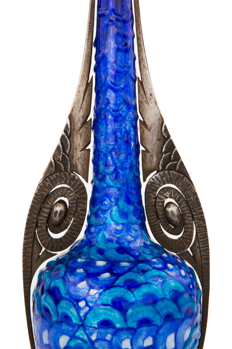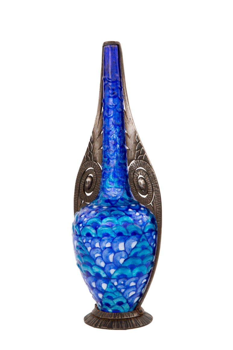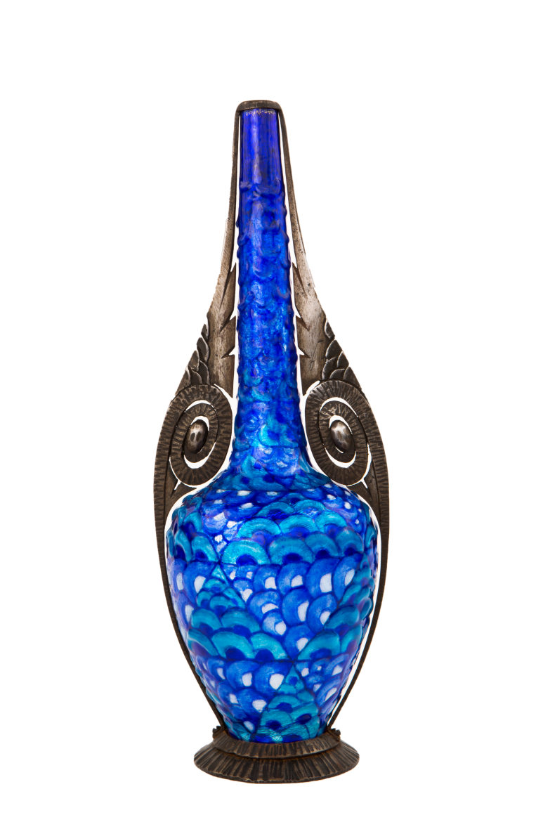 A fine and very rare French Art Deco enamelled on copper & wrought iron "Geometric" vase by, Camille Fauré decorated in colors of blue, white and further decorated and set with in a hand hammered and decorated wrought iron mount. The vase is signed, "CAMILLE.FAURÉ.LIMOGES"