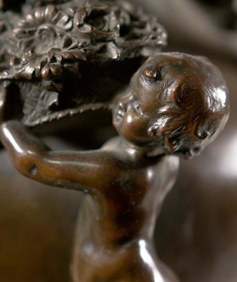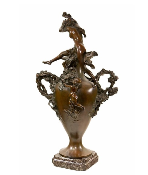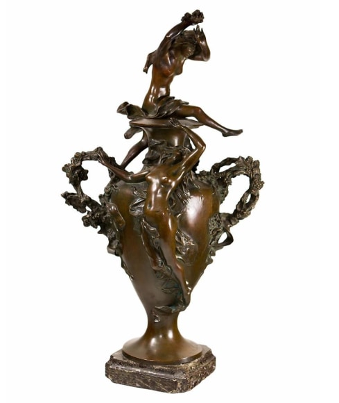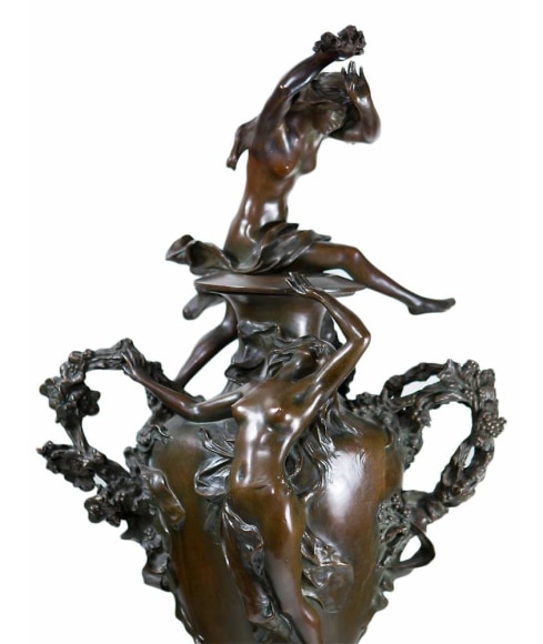 A French Art Nouveau patinated bronze figural urn by, Félix Charpentier decorated with nude maidens URN WITH NUDES patinated bronze on shaped marble base The urn is signed, "F. Charpentier" and stamped with foundry mark "F. Colin & Cie, Paris" and a retailers mark "Tiffany & Co"