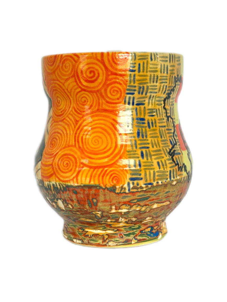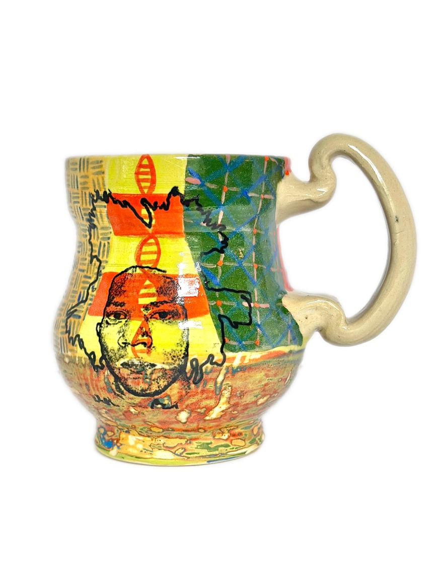 An American Contemporary ceramic mug by, Roberto Lugo. The ceramic mug in bright vibrant glaze of african inspired design with a portriat of Jean Michel Basquait. The mug is unsigned. circa 2025