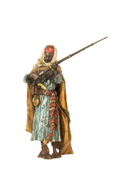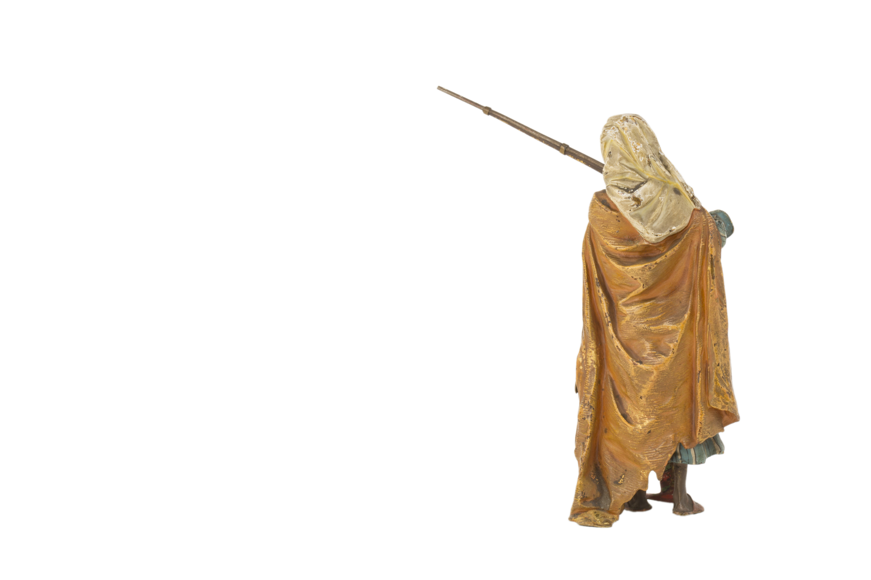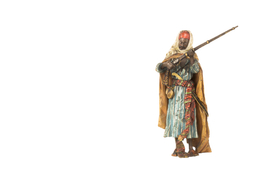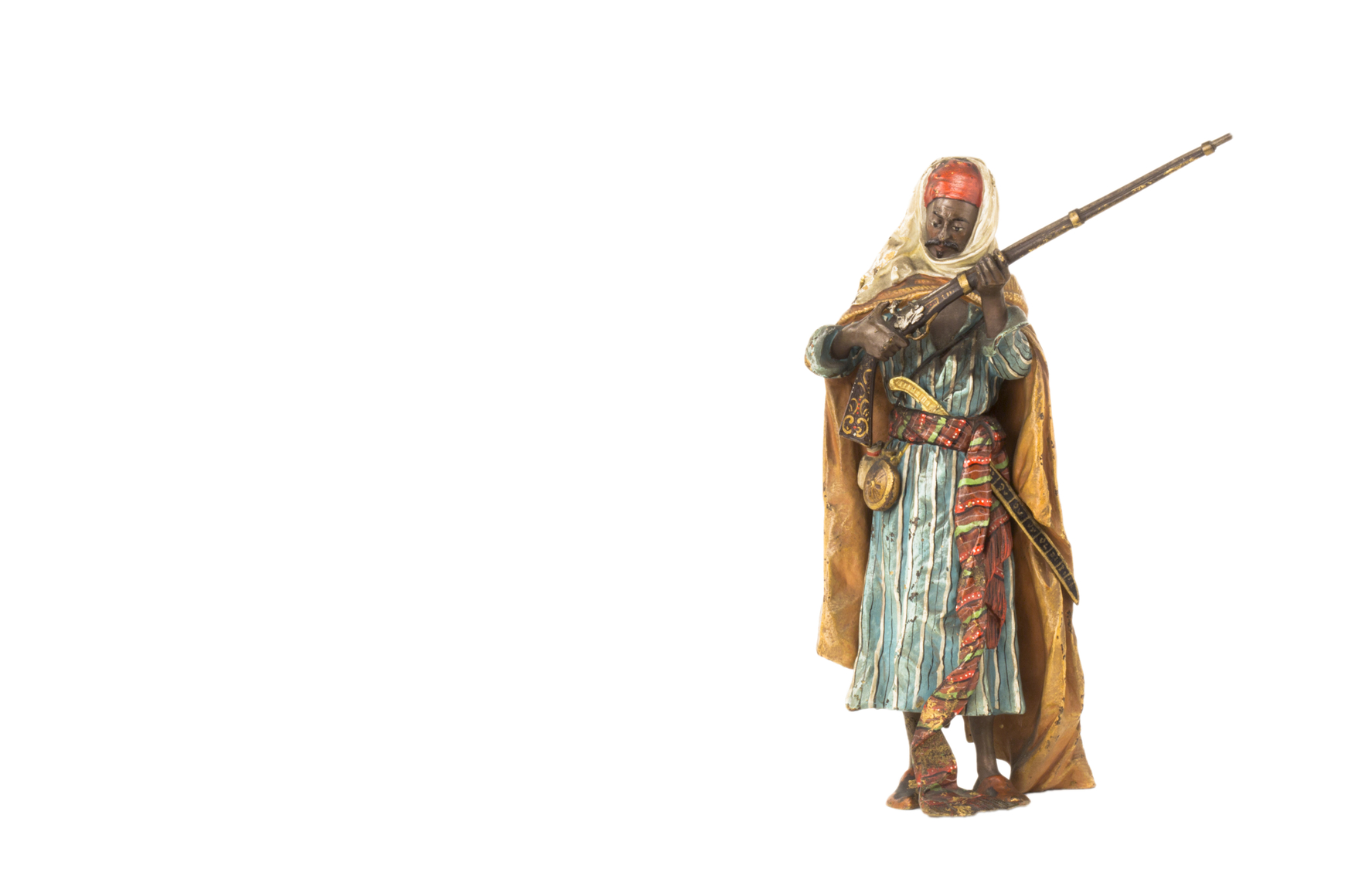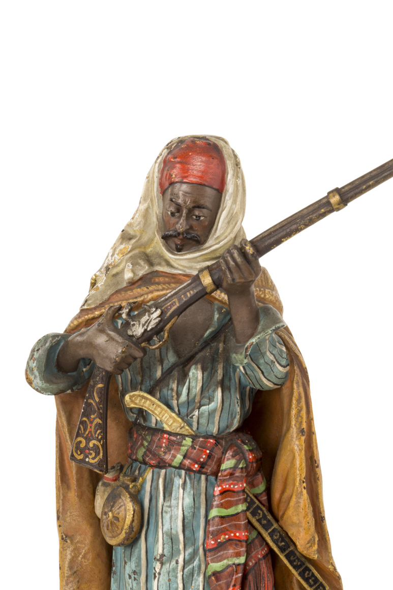 An Austrian Art Nouveau polychromed bronze Orientalist sculpture of a "Bedouin Soldier" by, Franz Bergman reloading a rifle adorned in beautifully polychromed dress. The bronze retains its original polychromed finish and is in good condition with age appropriate wear. The sculpture is signed with the Bergman mark displaying the letter B within a cartouche and is further numbered.