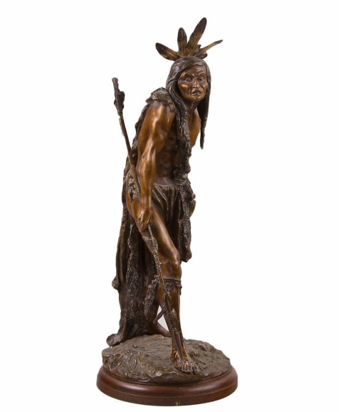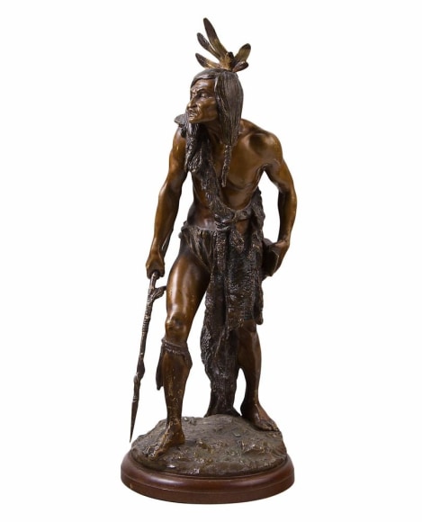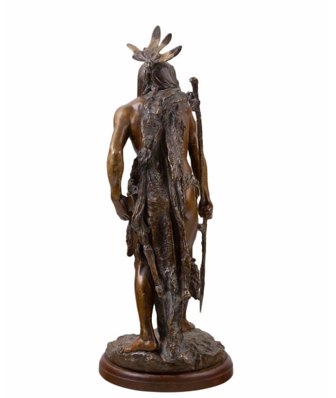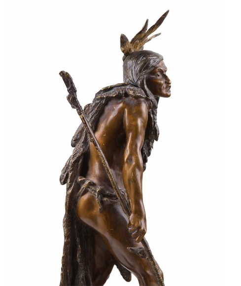 An Austrian polychromed and bronze sculpture of an "Indian Warrior" by, Carl Kauba on guard with battle axe and spear in hand walking amongst leafage a top its original bronze plinth.The Warrior is signed, "C. Kauba" and further signed, "GESCHUTZ 3693" and with the Bergman Foundry cartouche.