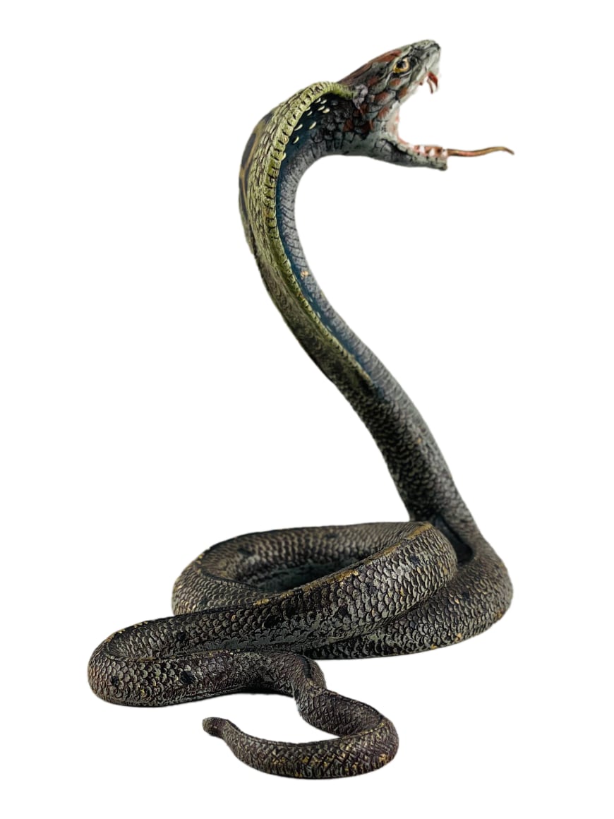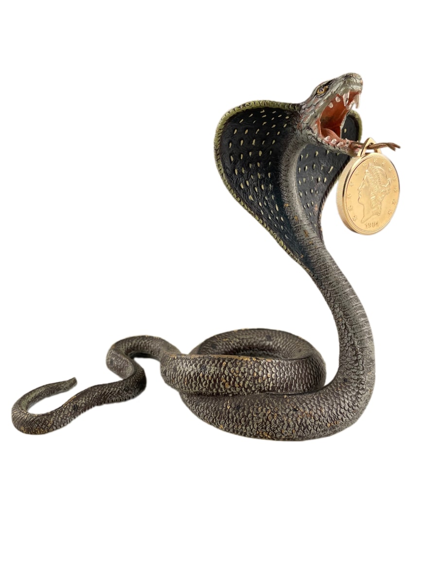 An Austrian cold-painted bronze of a cobra snake coiled with its head fanned out and tongue extended. The tongue is long enough to intercept a pocket-watch as photographed. The bronze is signed with the Bergman Foundry Mark and further signed, "AUSTRIA"