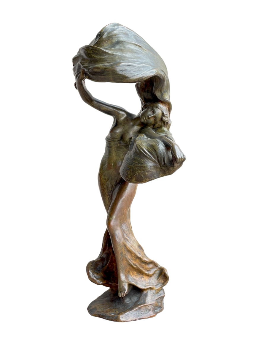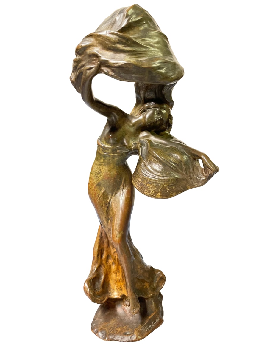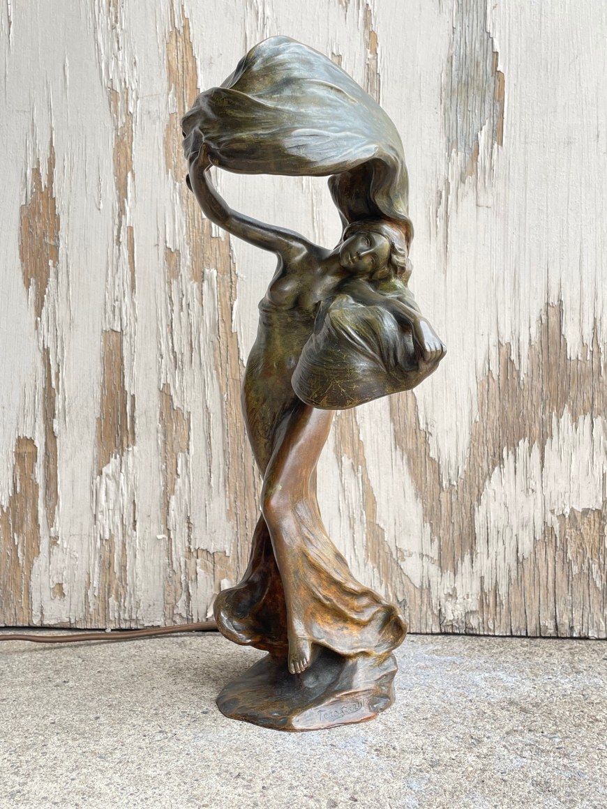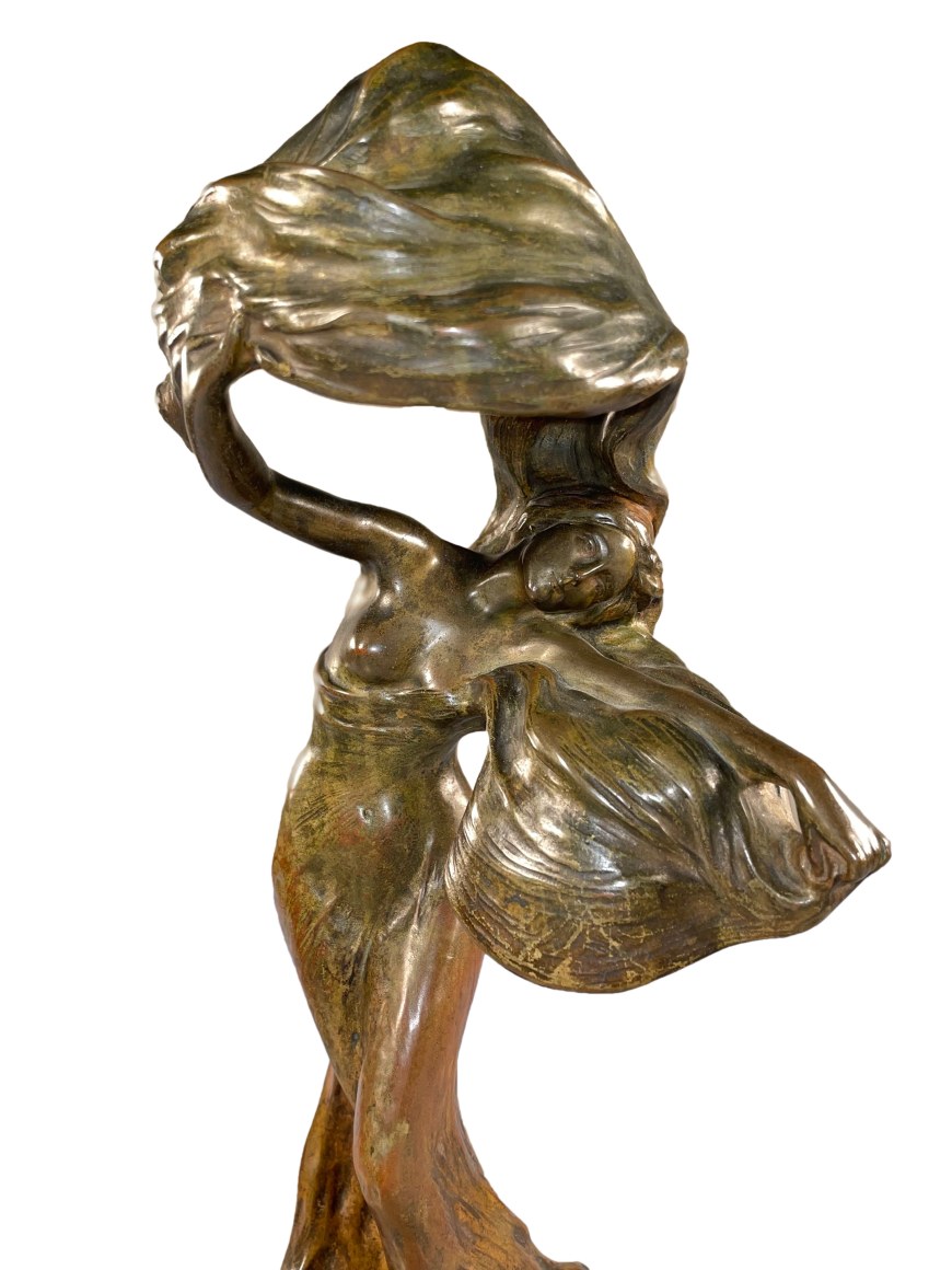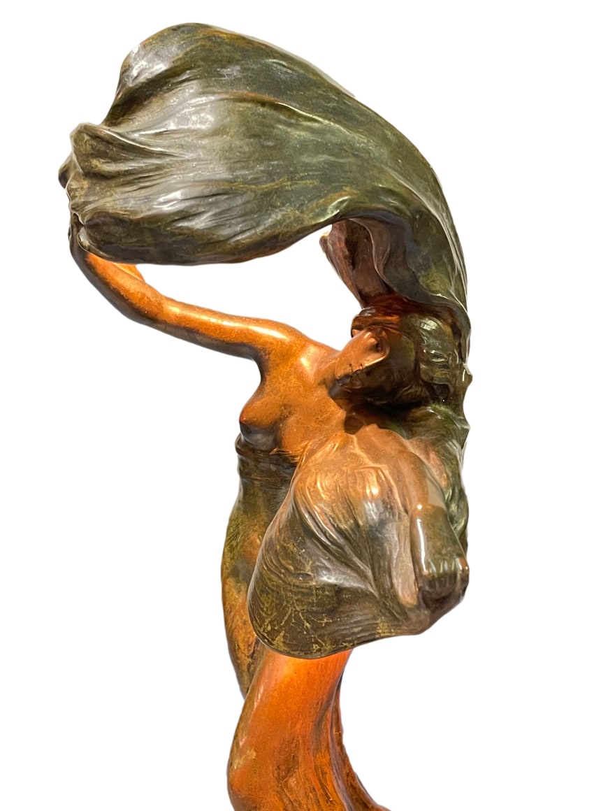 An Early 20th Century Austrian Art Nouveau cast bronze sculptural "Loie Fuller" desk lamp depicting the American Dancer Loïe Fuller, who to many artists of the Art Nouveau era was their muse and was the true definition of which helped shape the Art Nouveau Movement. The sculpture captures the essence of Loie Fuller mid-movement, while a swirling veil of scarves floating above her head, and her body are caught in the most organic form. With-in the folds of the scarves there are two electric bulb which are cleverly hidden within the two folds casting further a golden light down on the sculpture. The sculpture is impressed "Tereszczuk" - circa 1900