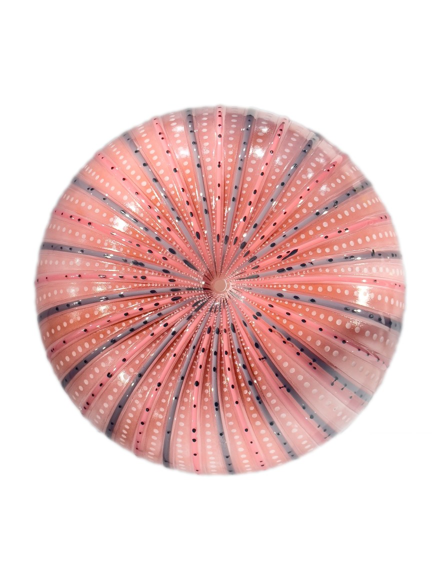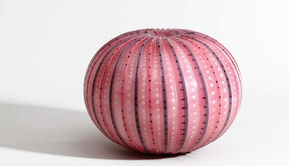 A French Contemporary Art Glass "Pink Oursins" (Sea Urchin) vase by, French Glass Master Michel Détré. The vase in the form of a sea urchin is hand blown and finished and further wheel carved. The vase predominately finished in Pink is further accunetuated with pink and purple ribbing and further wheel carved and with black spots throughout. The vase is signed, "Michel Détré de Soire"
