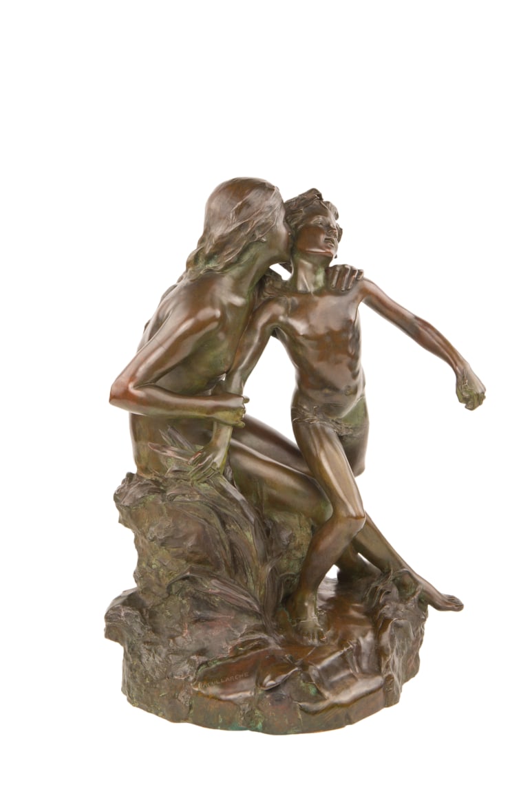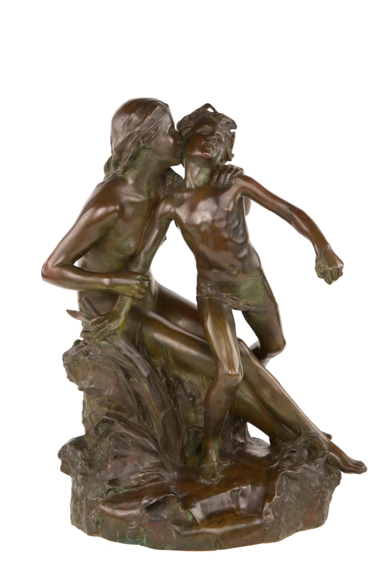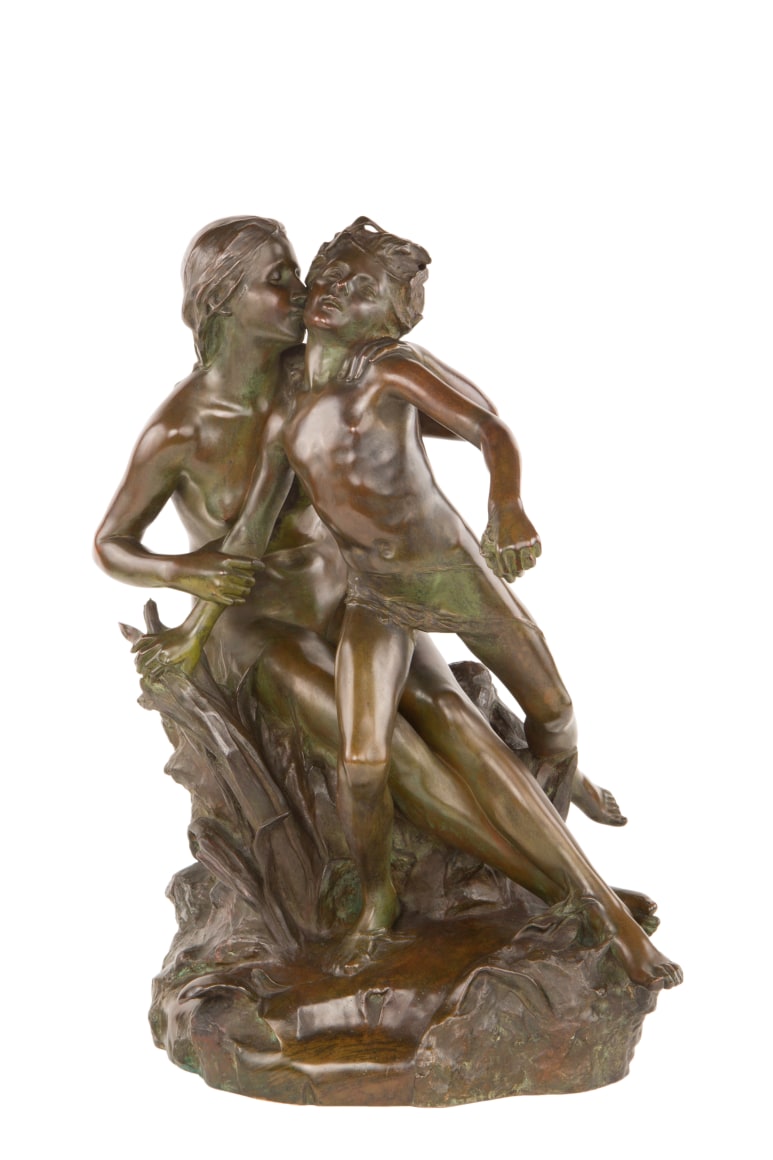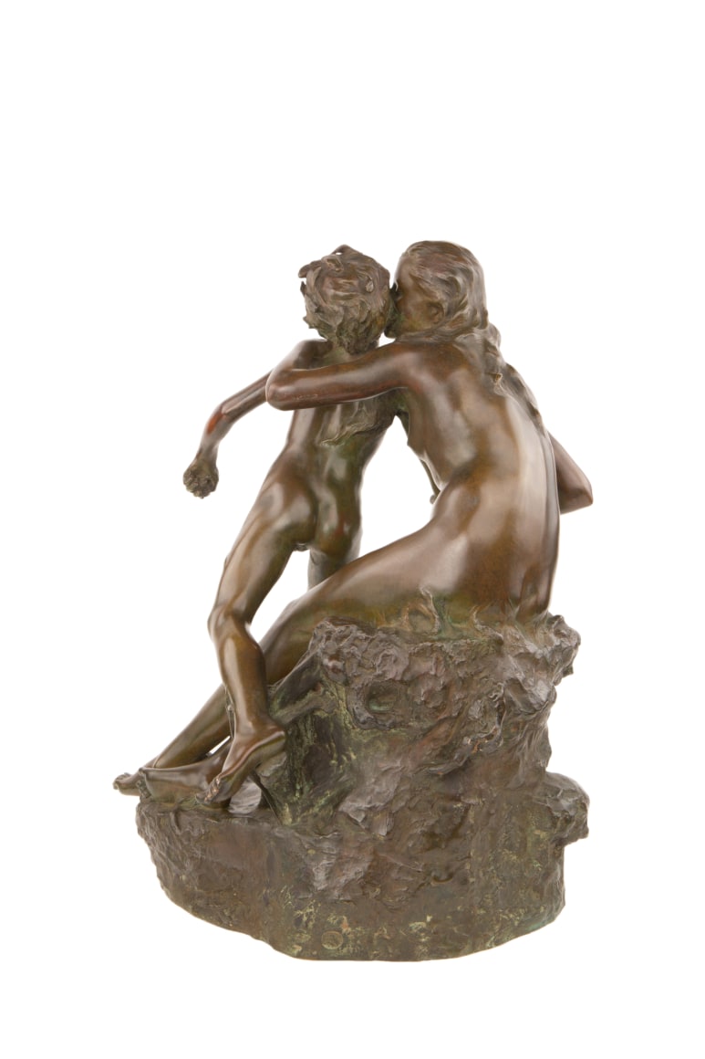 An exceptional patinated bronze sculpture "La Source et le Ruisseau" ("The Source of the Stream") by, François Raoul Larche" of a mother and her young child at the mouth of a river embracing her son and gently kissing him upon his cheek. The sculpture is signed, "Raoul Larche" and furhter impressed bearing the foundry seal: "Siot-Decauville, Fondue Paris, N734"