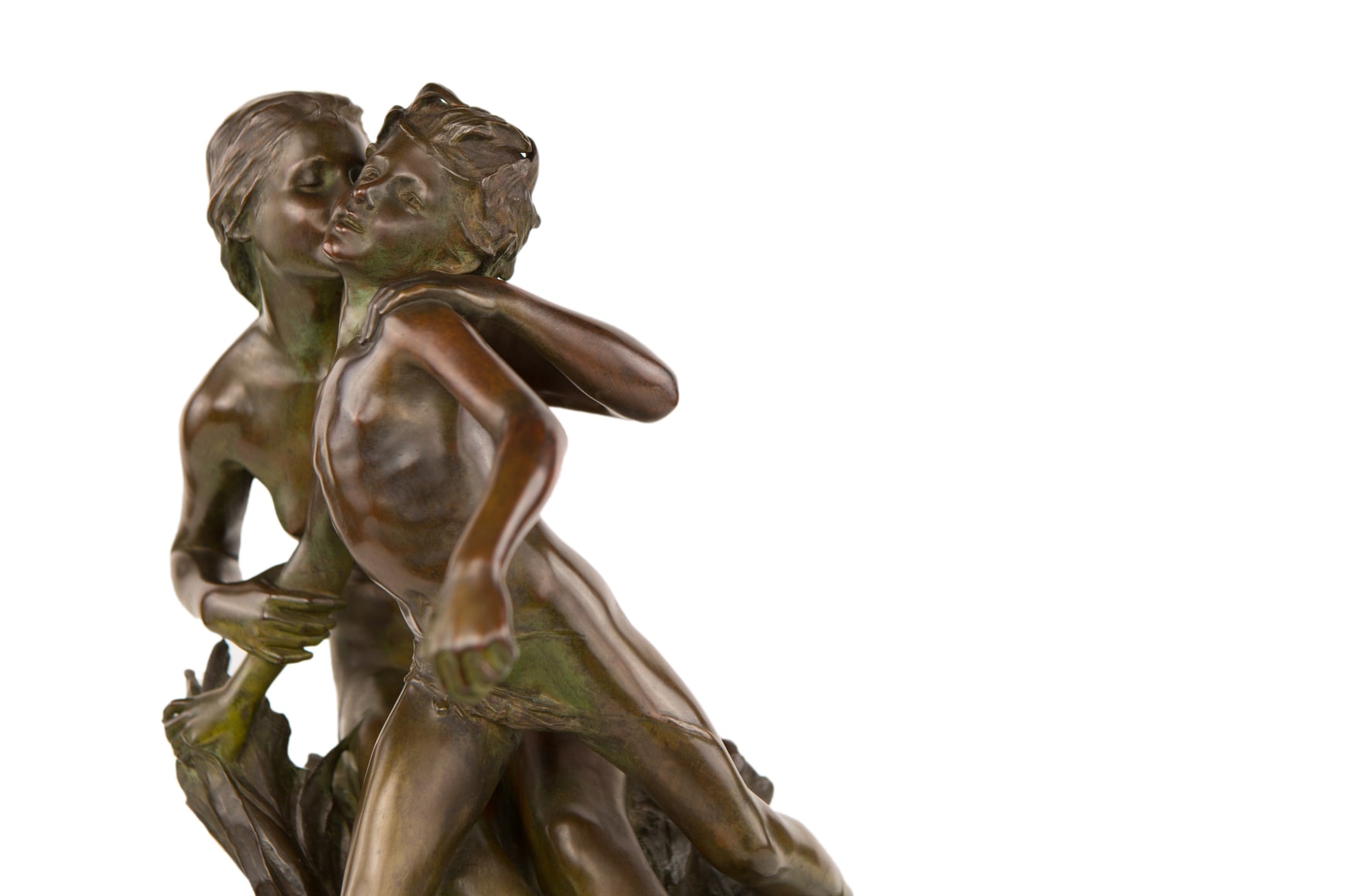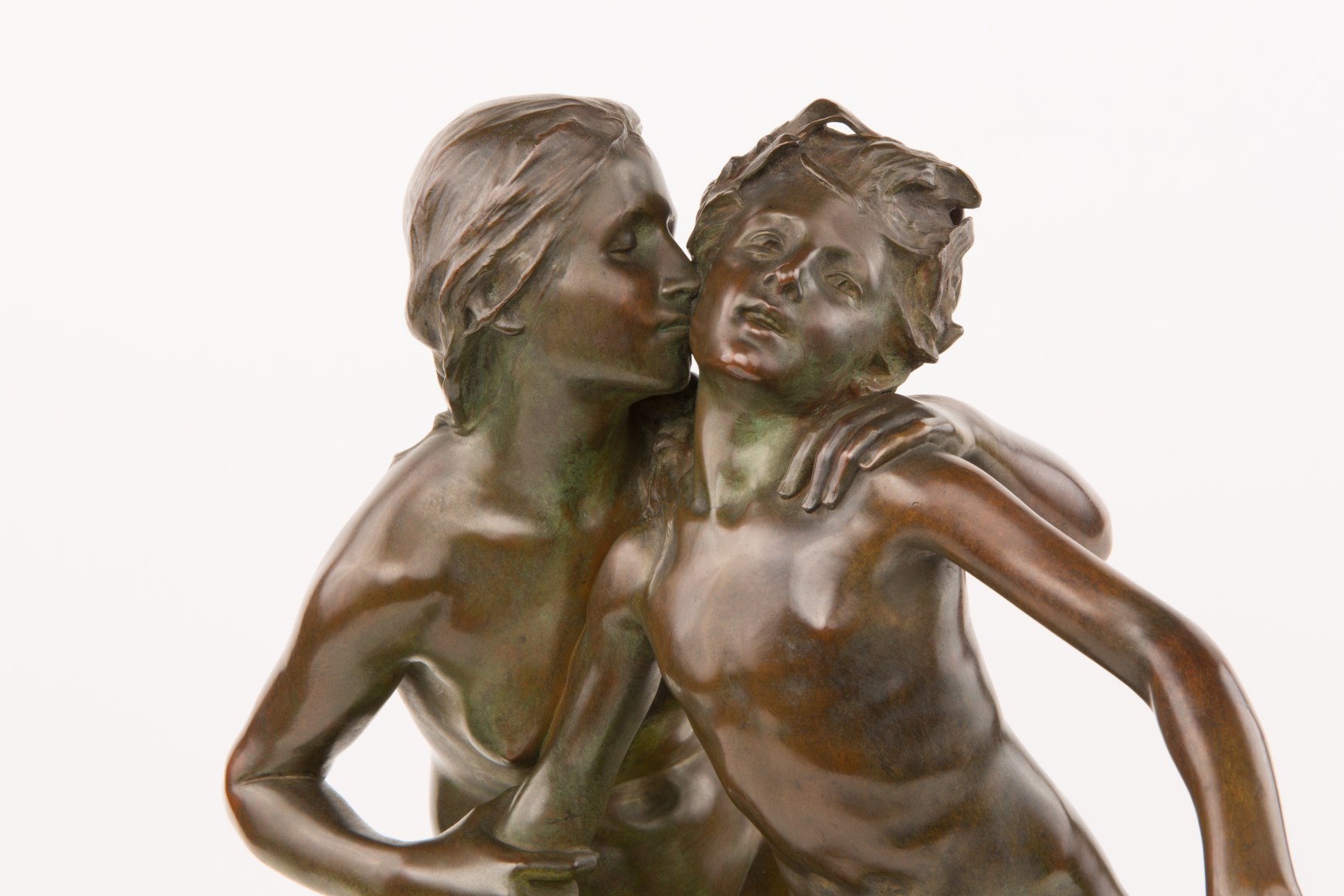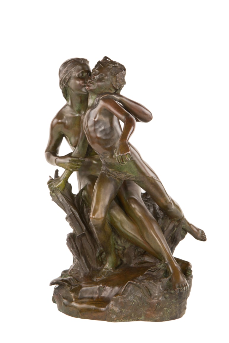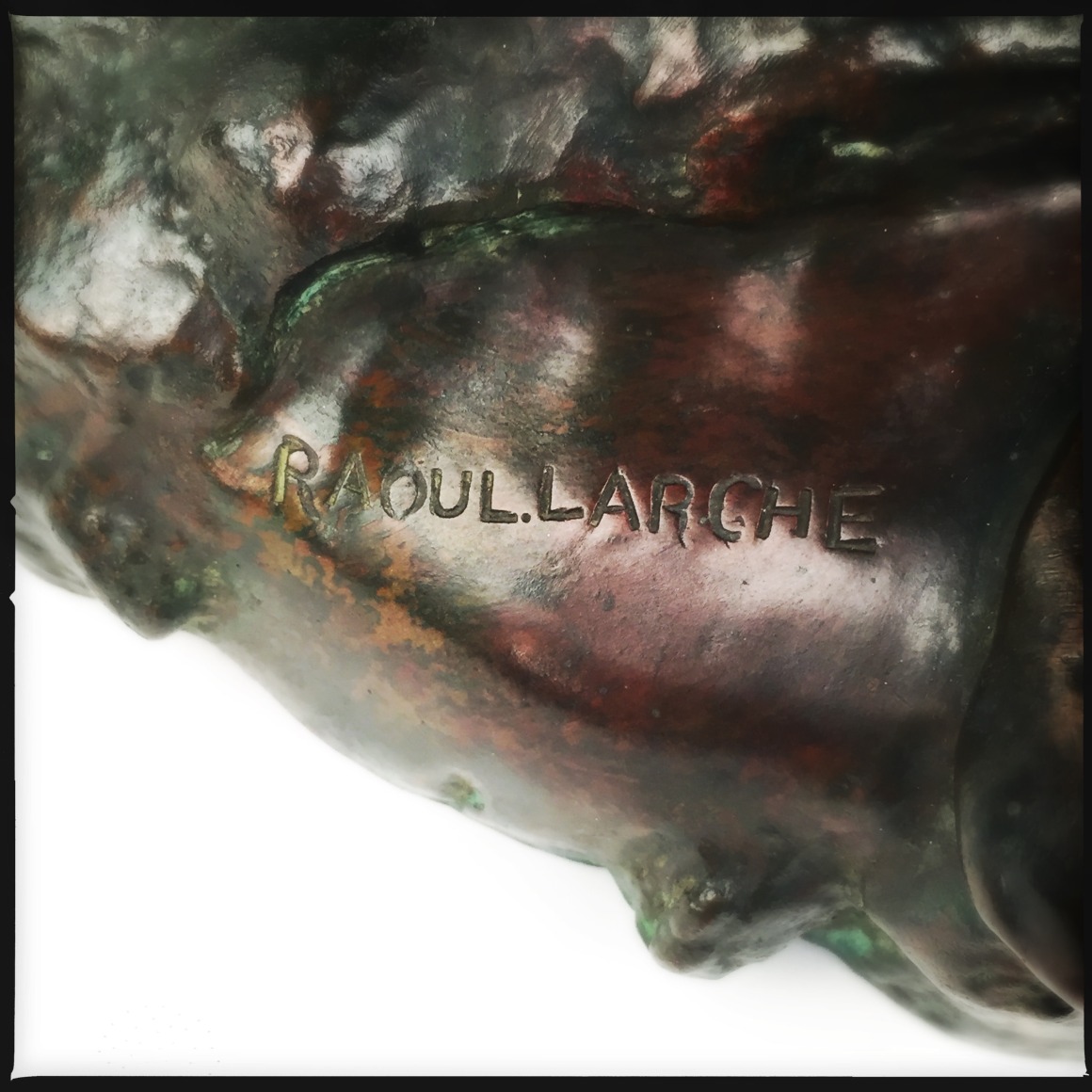 An exceptional patinated bronze sculpture "La Source et le Ruisseau" ("The Source of the Stream") by, François Raoul Larche" of a mother and her young child at the mouth of a river embracing her son and gently kissing him upon his cheek. The sculpture is signed, "Raoul Larche" and furhter impressed bearing the foundry seal: "Siot-Decauville, Fondue Paris, N734"