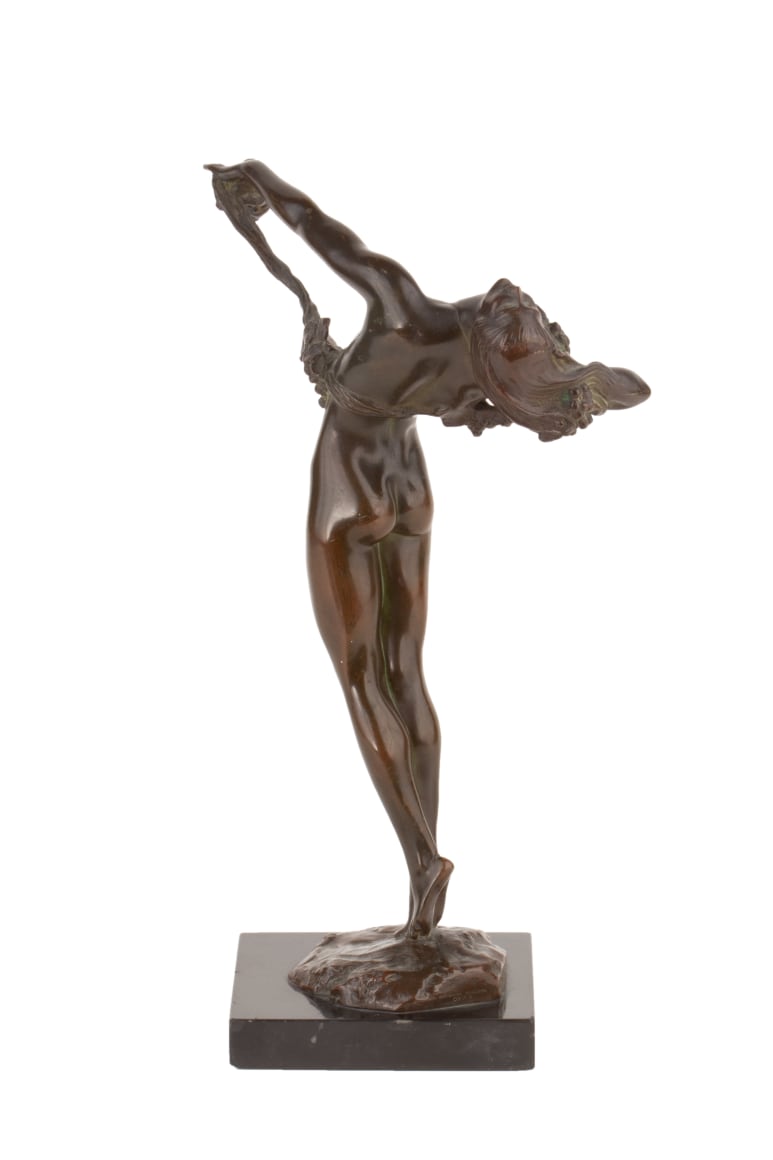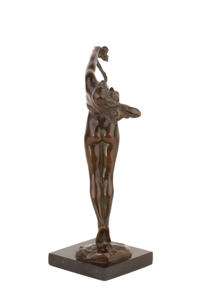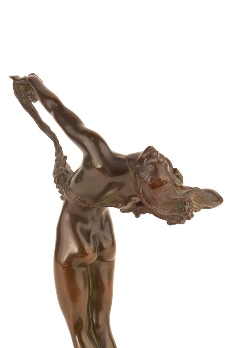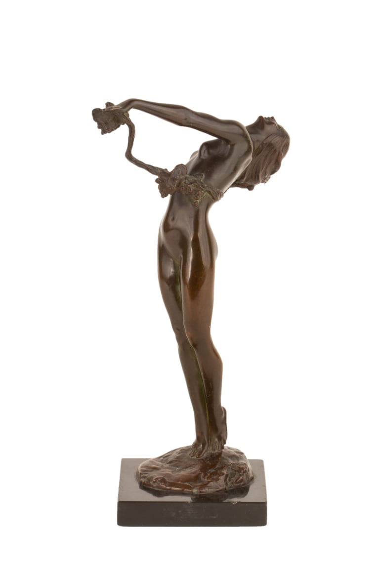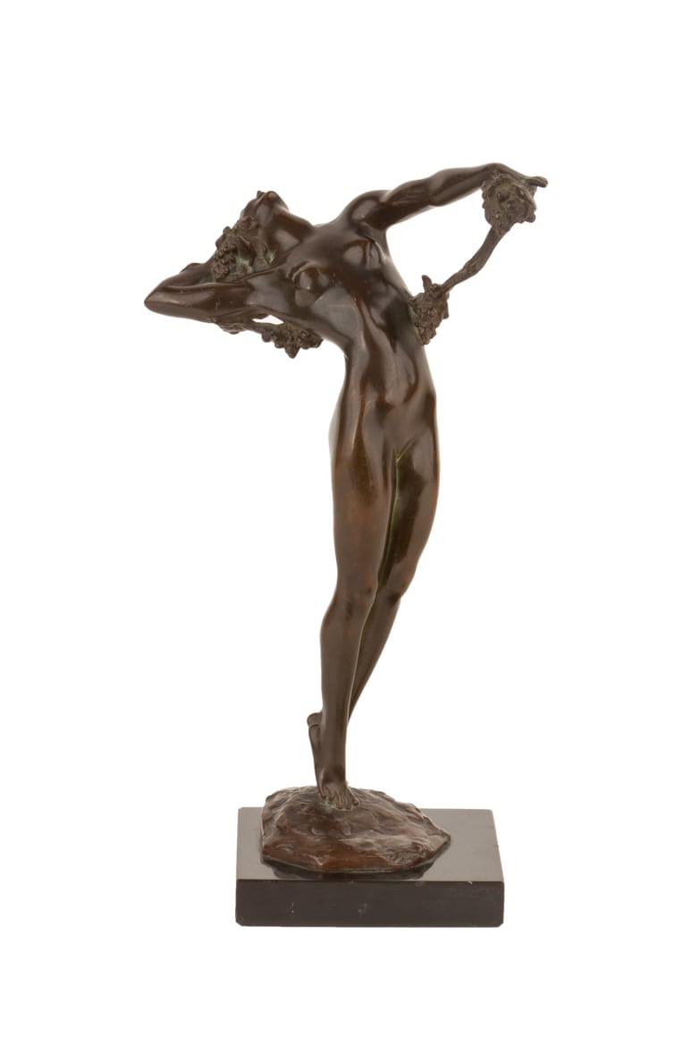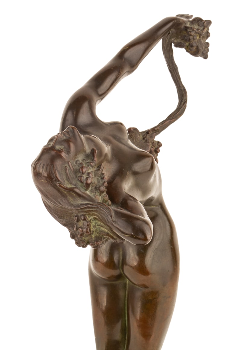 An American Art Nouveau cast patinated bronze sculpture "The Vine" by female sculptor, Harriet Whitney Frishmuth. The Vine depicts a nude dancer with outstretched arm with a grapevine growing off of her arm and holding a bunch of grapes. The dancers pose mimics that of how grapes grow off a vine. The sculpture is signed, "HARRIET W. FRISHMUTH" and further impressed "GORHAM CO FOUNDERS/QBWS"