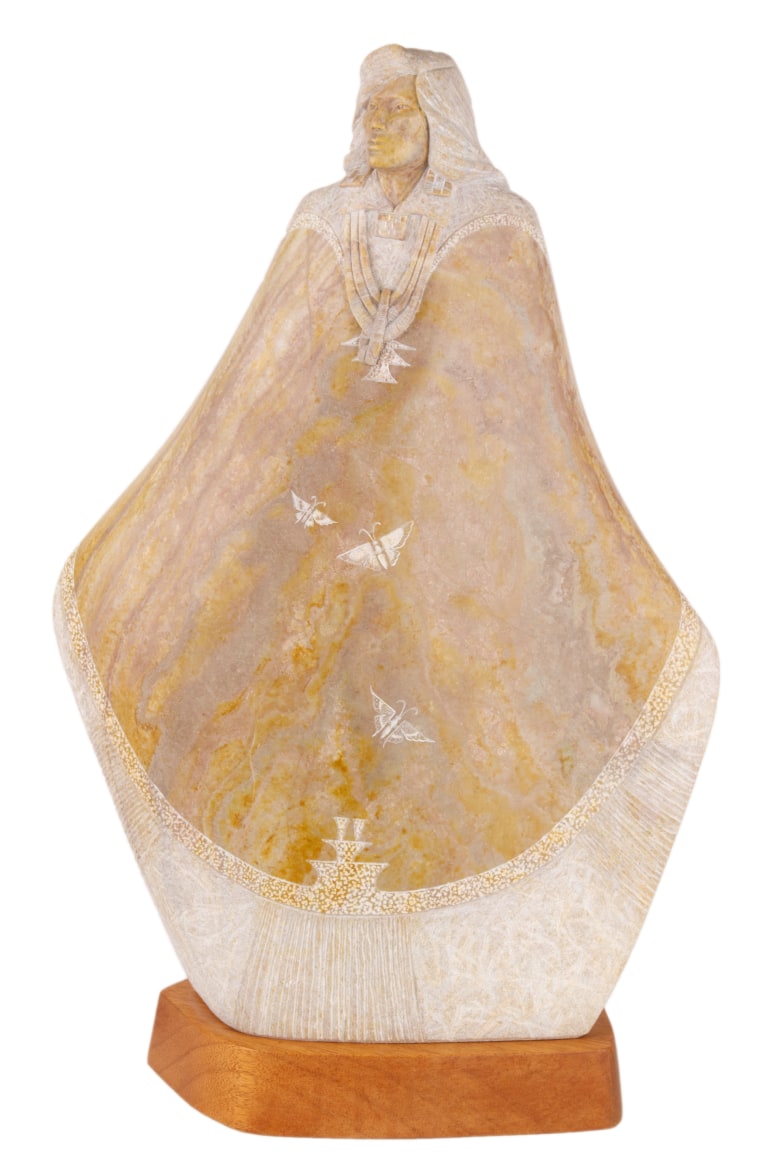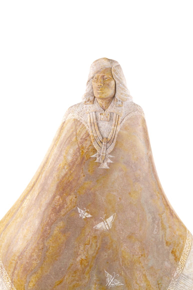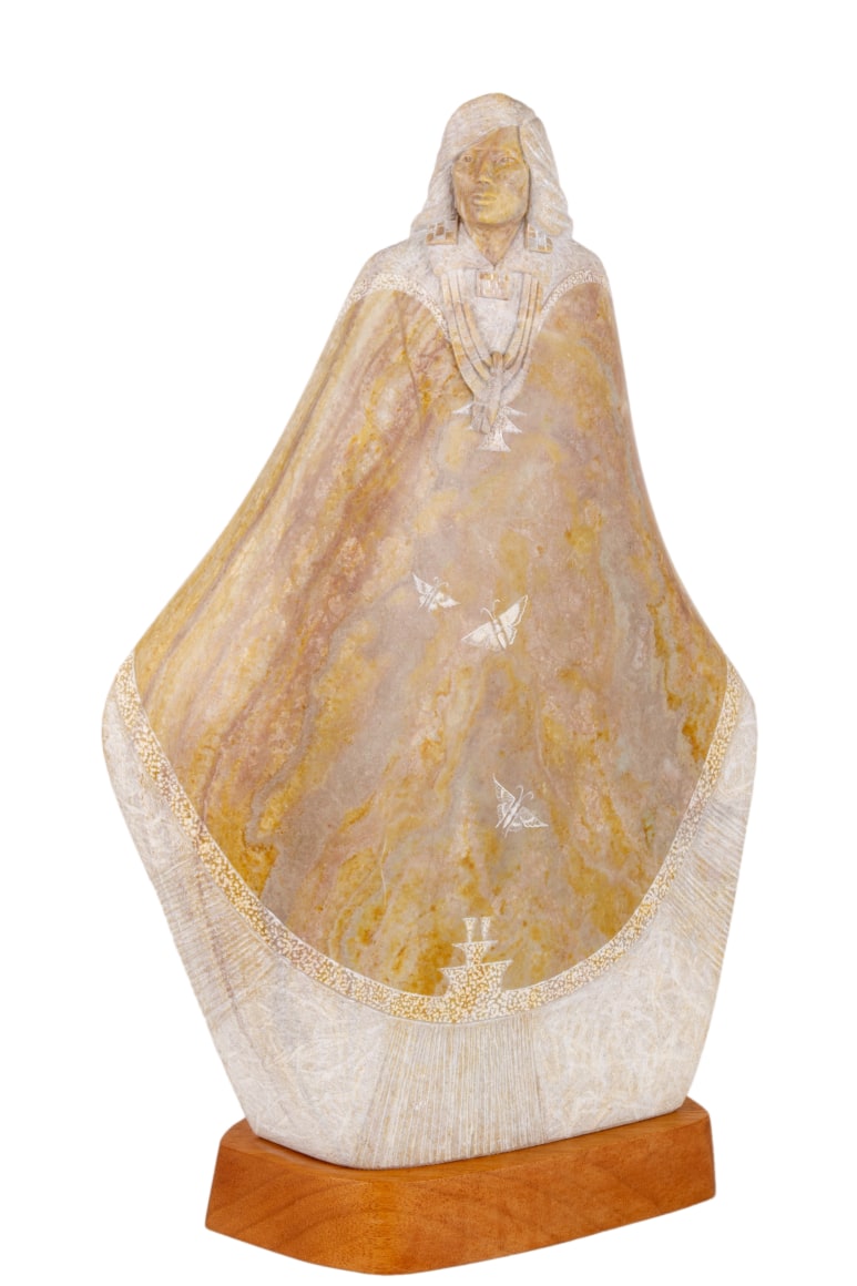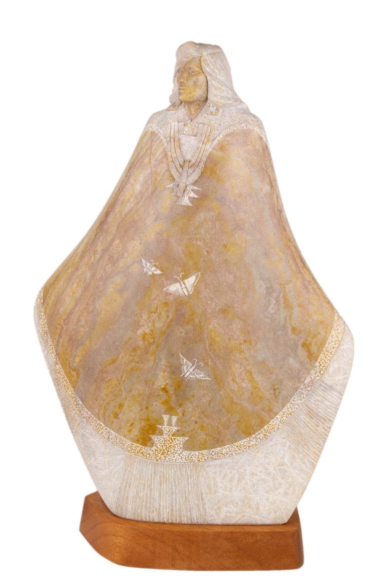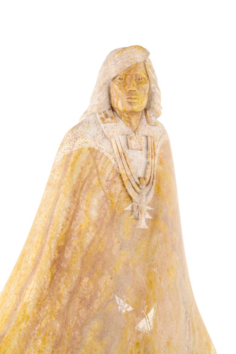 An American Post Modern Native American carved alabaster sculpture "Butterfly" by, Oreland Joe C. Jr. depicting a Navajo stnding upright with windswept hair and an elaborate carved shawl with butterflies and navajo design all carved out of a Colorado Alabaster and sits a top its orignal wood base. The sculpture is signed, "© O.C.JOE 88" circa 1988.