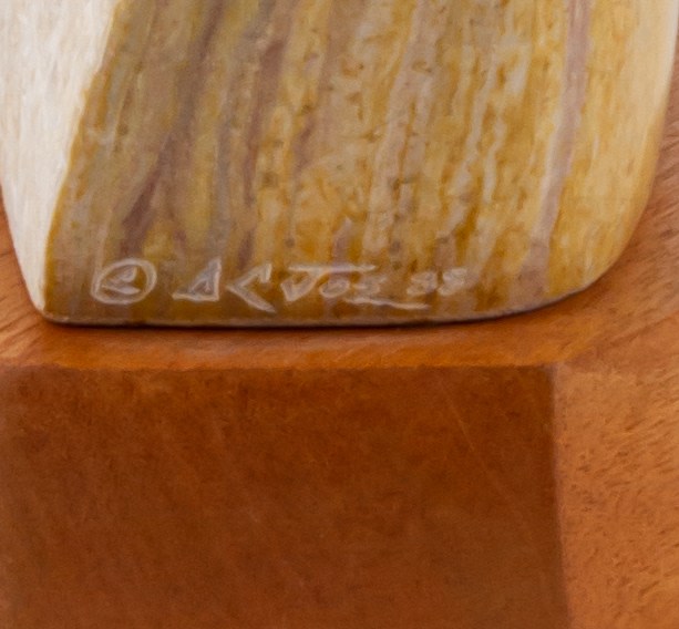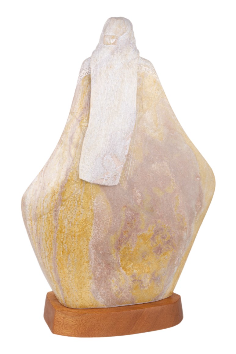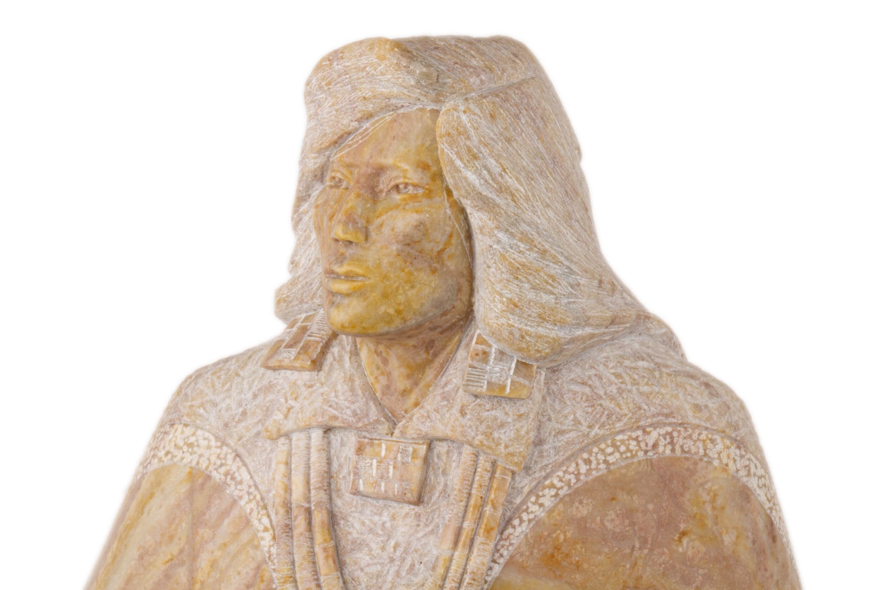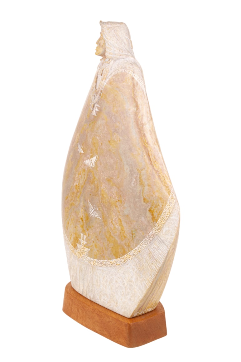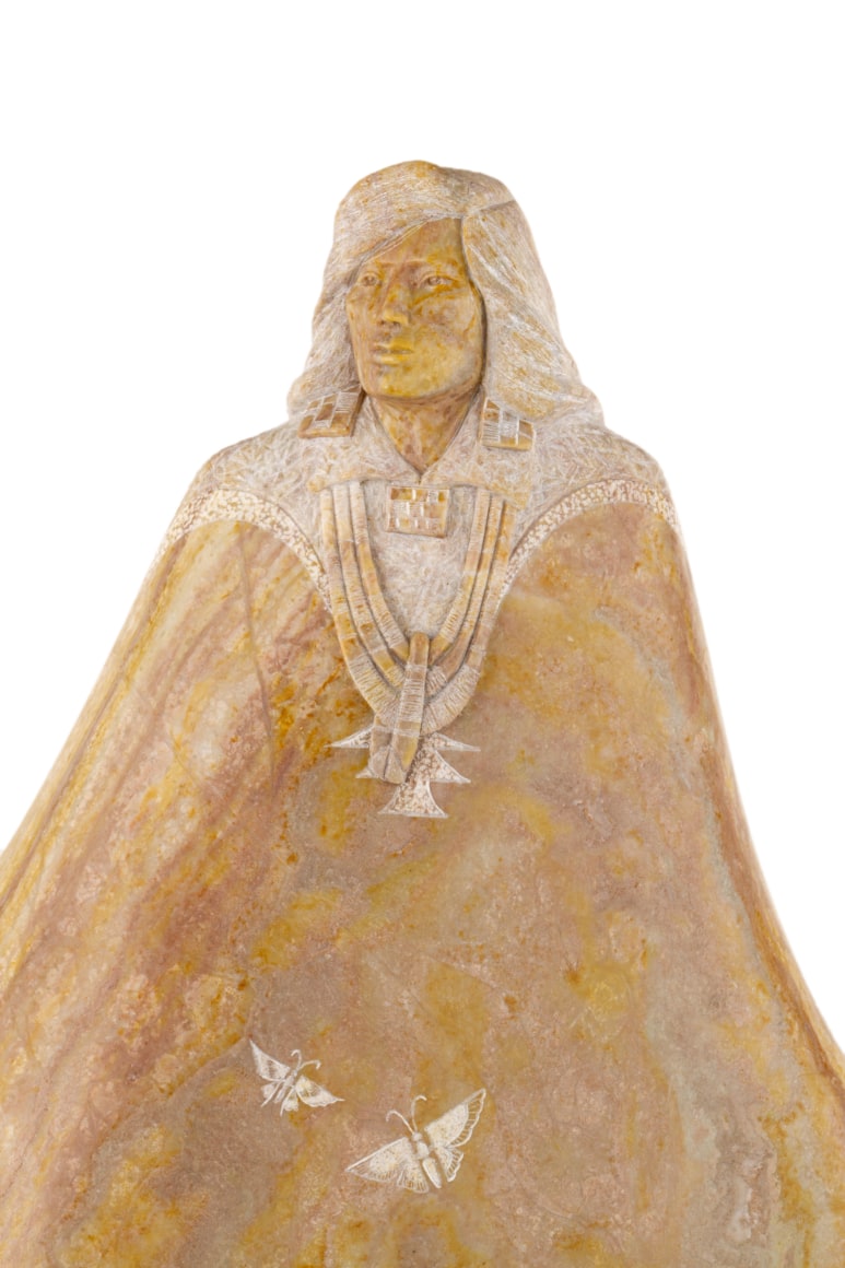 An American Post Modern Native American carved alabaster sculpture "Butterfly" by, Oreland Joe C. Jr. depicting a Navajo stnding upright with windswept hair and an elaborate carved shawl with butterflies and navajo design all carved out of a Colorado Alabaster and sits a top its orignal wood base. The sculpture is signed, "© O.C.JOE 88" circa 1988.