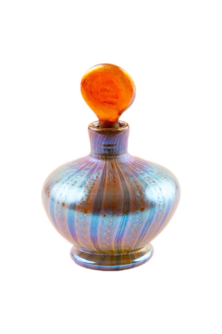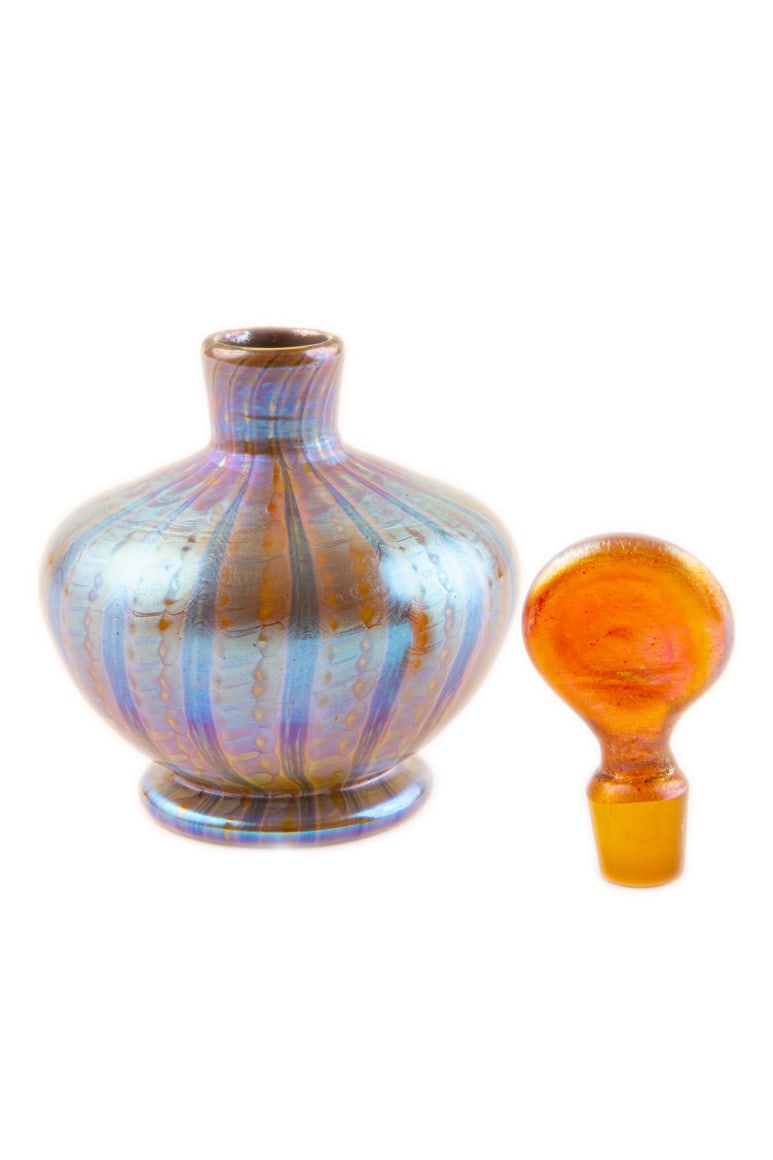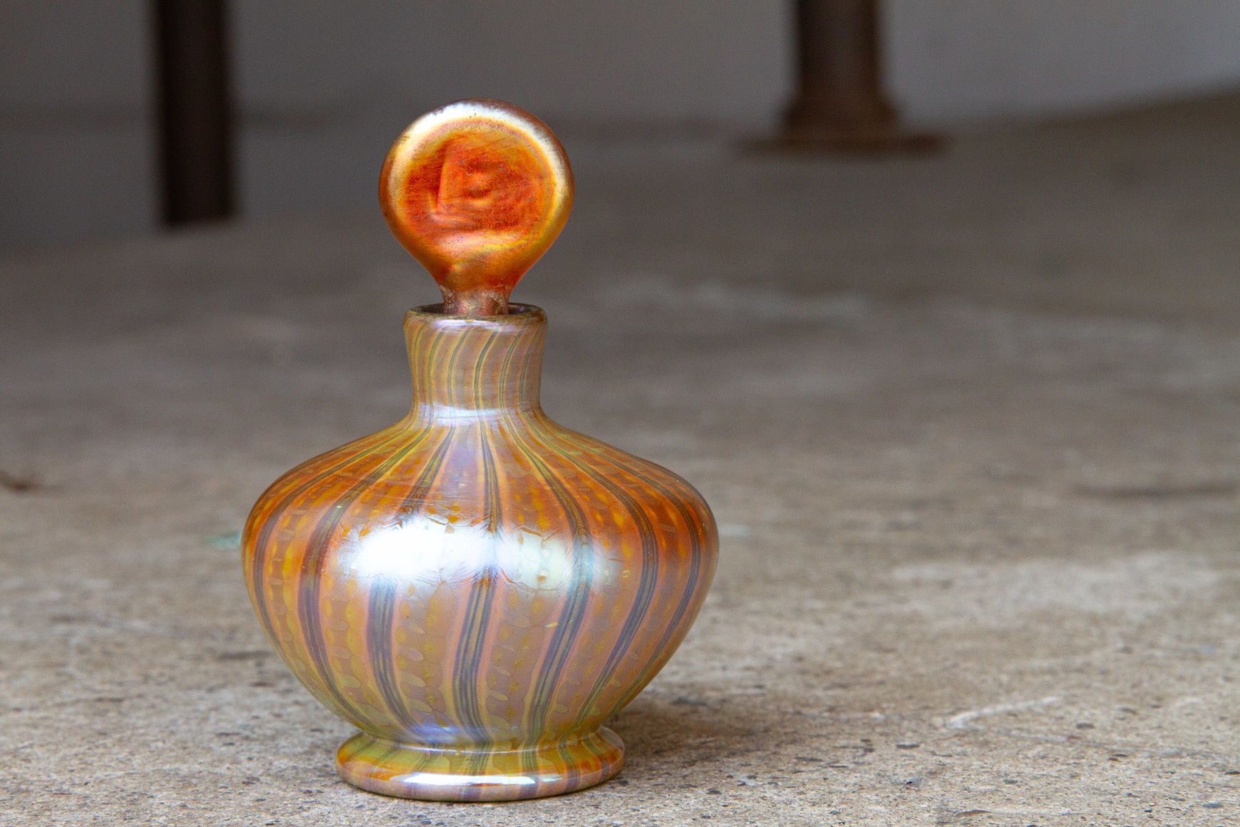 A very rare American Art Nouveau Tiffany Favrile decorated "Agate" perfume bottle by, Tiffany Studios New York. The body of the perfume is decorated with iridescent zipper decoration against a heavily iridescent and reactive orange yellow, background and furhter finished with its original iridescent stopper. The bottle is reactive and will reflect different hues varying on lighting. The bottle is signed, "L.C.Tiffany Favrile 2019K" and the stopper is numbered "2019K"