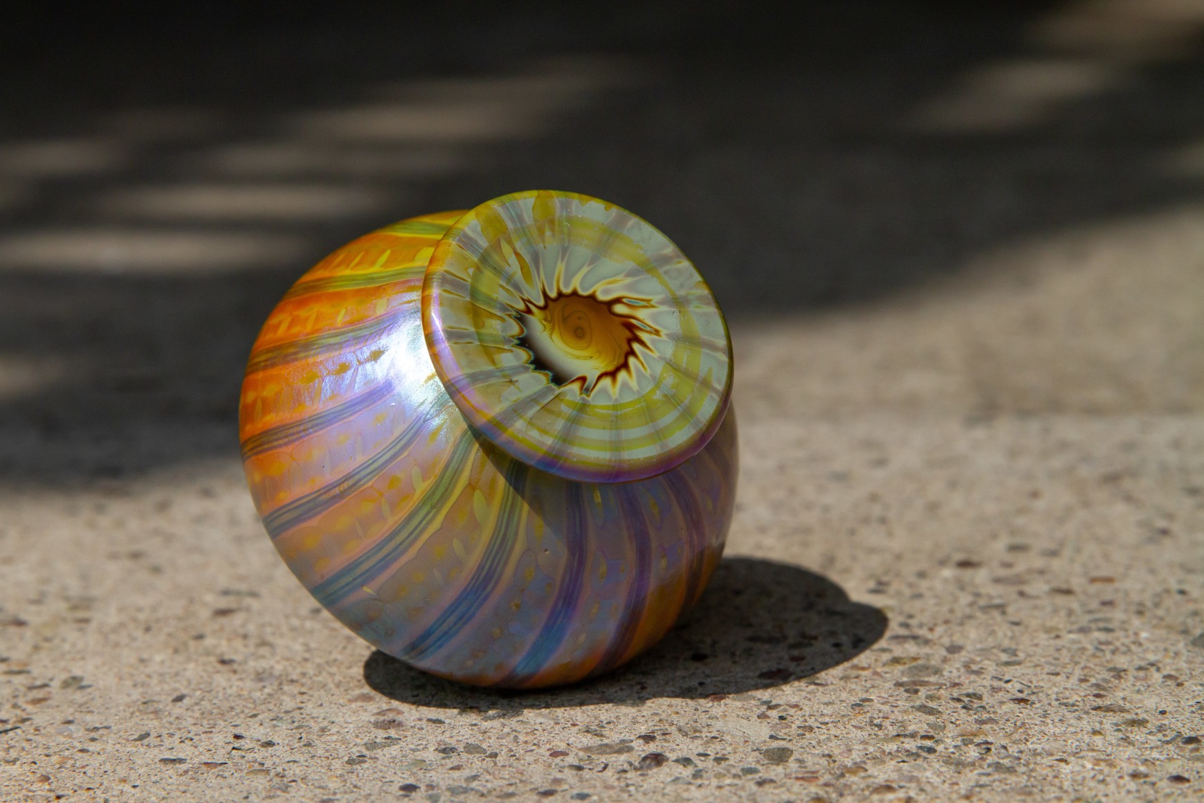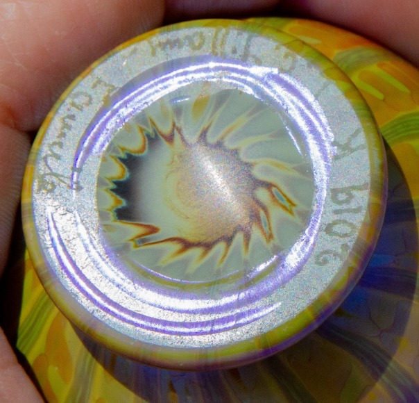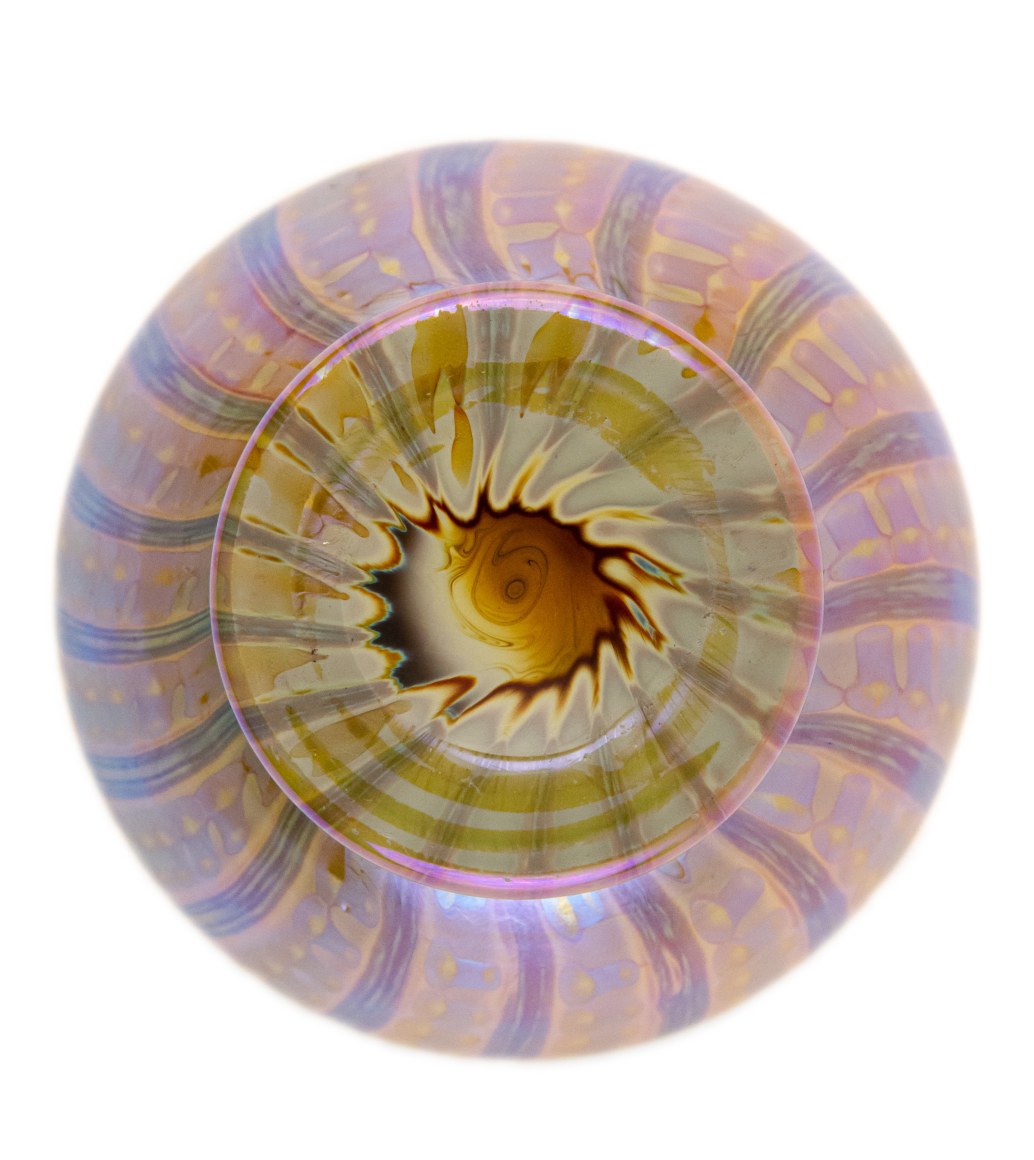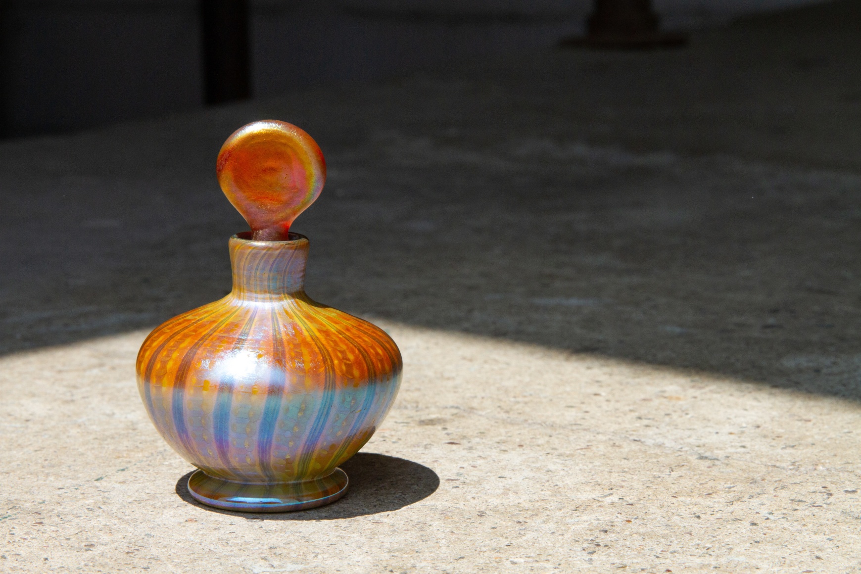 A very rare American Art Nouveau Tiffany Favrile decorated "Agate" perfume bottle by, Tiffany Studios New York. The body of the perfume is decorated with iridescent zipper decoration against a heavily iridescent and reactive orange yellow, background and furhter finished with its original iridescent stopper. The bottle is reactive and will reflect different hues varying on lighting. The bottle is signed, "L.C.Tiffany Favrile 2019K" and the stopper is numbered "2019K"