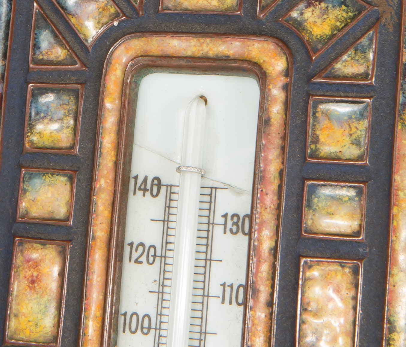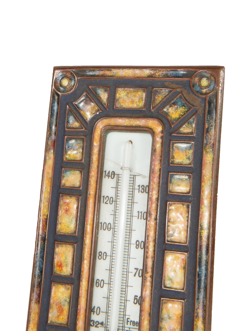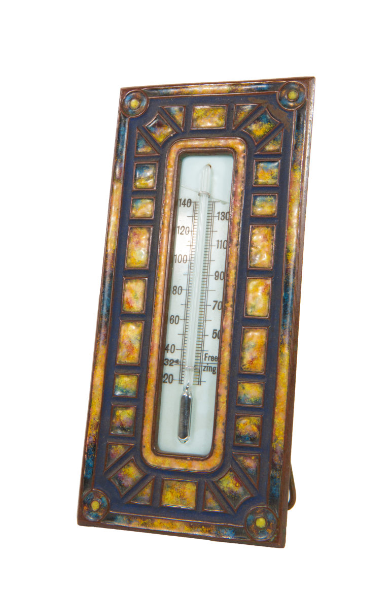 A rare bronze and enameled Tiffany Furnaces "Art Deco" pattern desk Thermometer by, Tiffany Studios decorated with yellow-orange & blue enameled squares finished in its original patinta finish. The thermometer is signed, "Louis C. Tiffany Furnaces INC. 364" and is further impressed with the furnaces monogram.