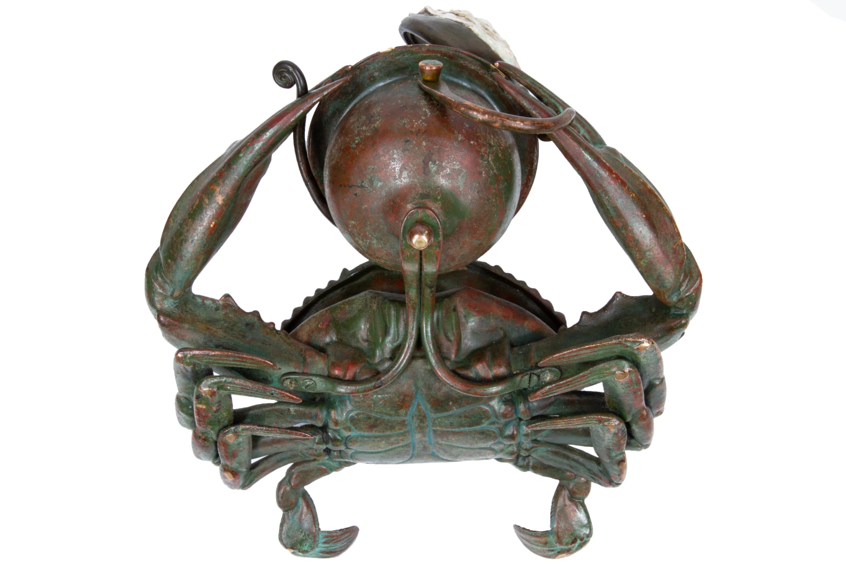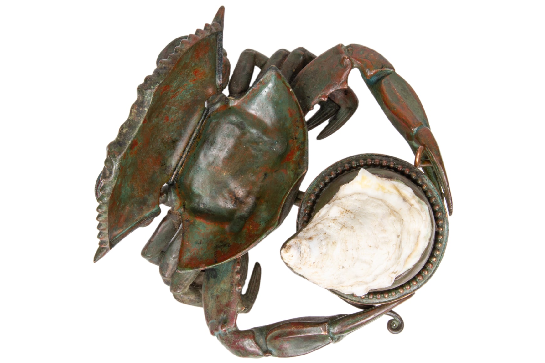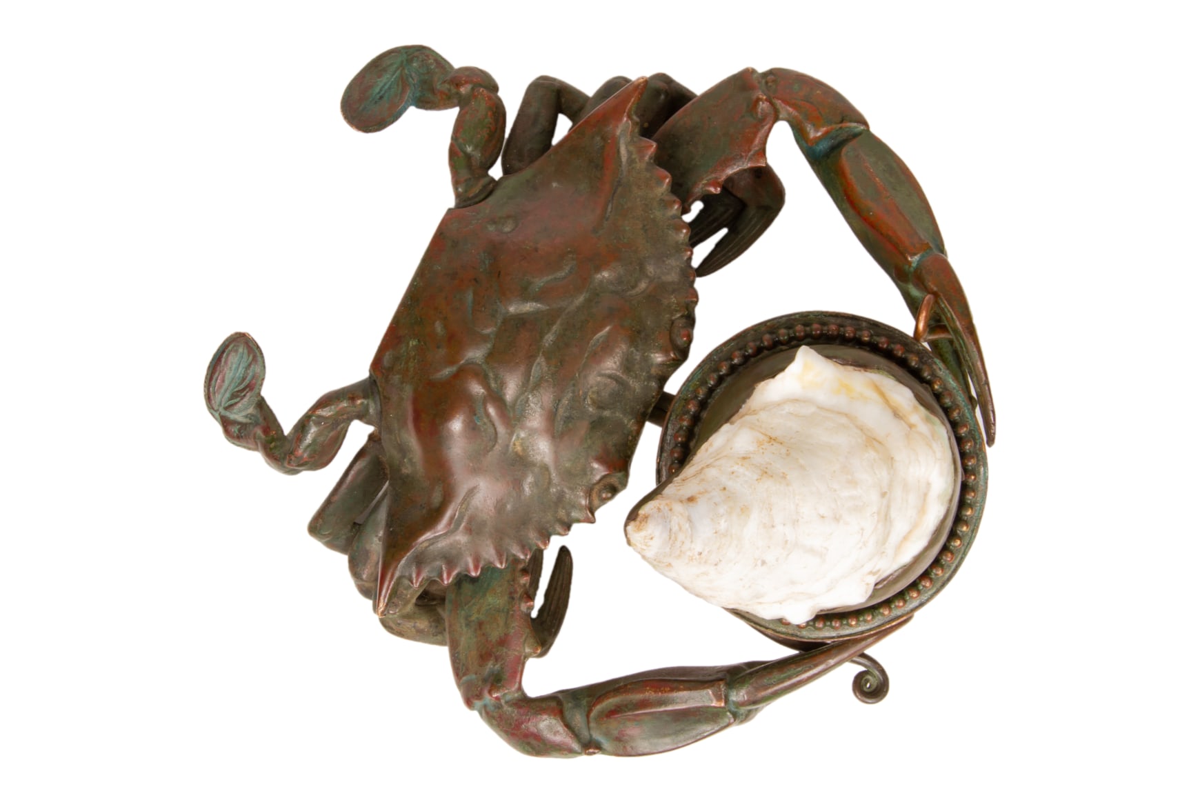 An American Art Nouveau patinated bronze "Crab" inkwell by, Tiffany Studios cast as a crab decorated with seashell lid to and body opens as well. The inkwell retains its original clear glass liner and is signed, Tiffany Studios New York 29233" and further impressed with the Tiffany Studios Decorating Company monogram and also numbered 20"