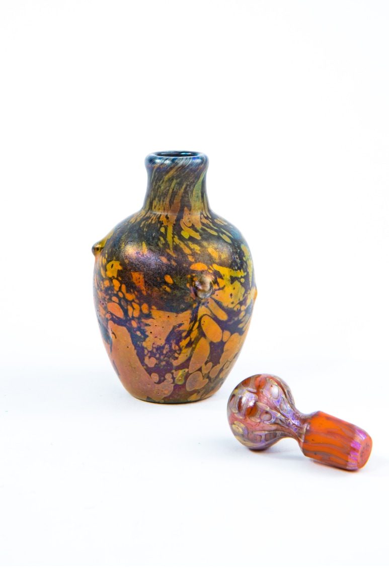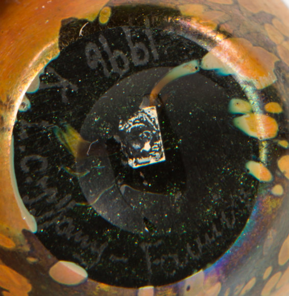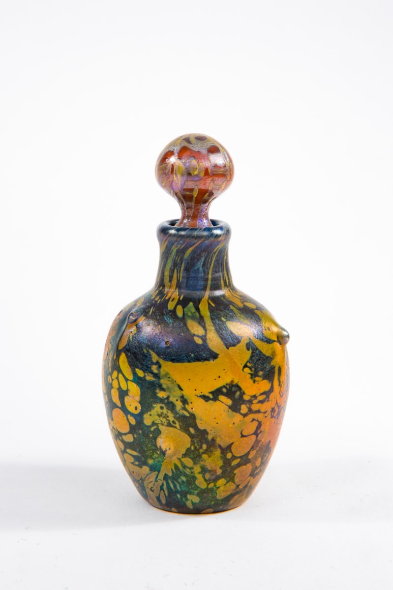An extremely rare and stunning American Art Nouveau blown glass "Cypriote" perfume bottle by, Tiffany Studios decorated with vibrant colors of hot iridescent orange, yellow and green against a black-green background further decorated with prunts throughout. The bottle retains its original stopper. The bottle is signed,"1966K L.C.Tiffany Favrile" and the stopper is signed, "1966K"