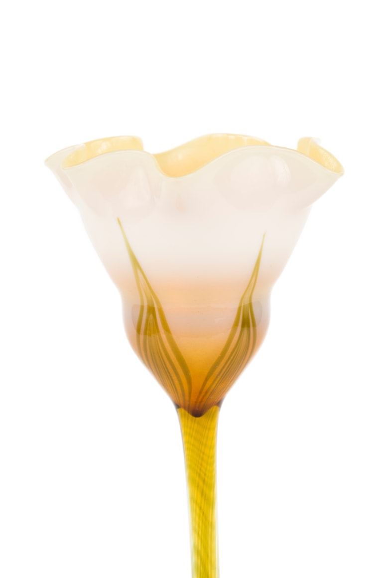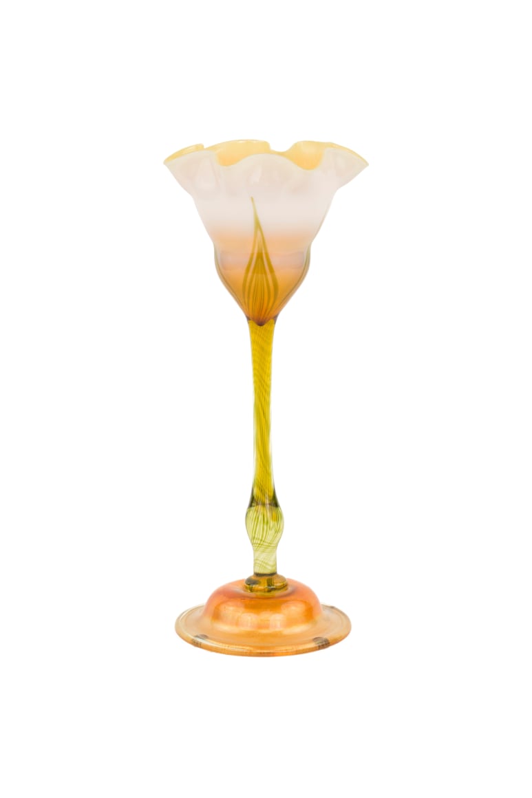 An American Art Nouveau favrile glass "Pulled Feather" Flower Form vase by, Tiffany Studios decorated with pulled feather decoration flowing through to the stem of the vase emulating leafs against a graduated iridescent white transluscent background further decorated with with an applied iridized quilted foot. The vase is signed, "L.C.T. T325"