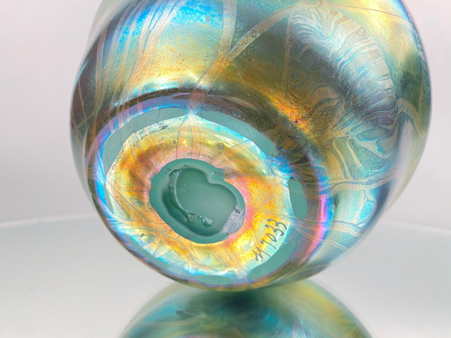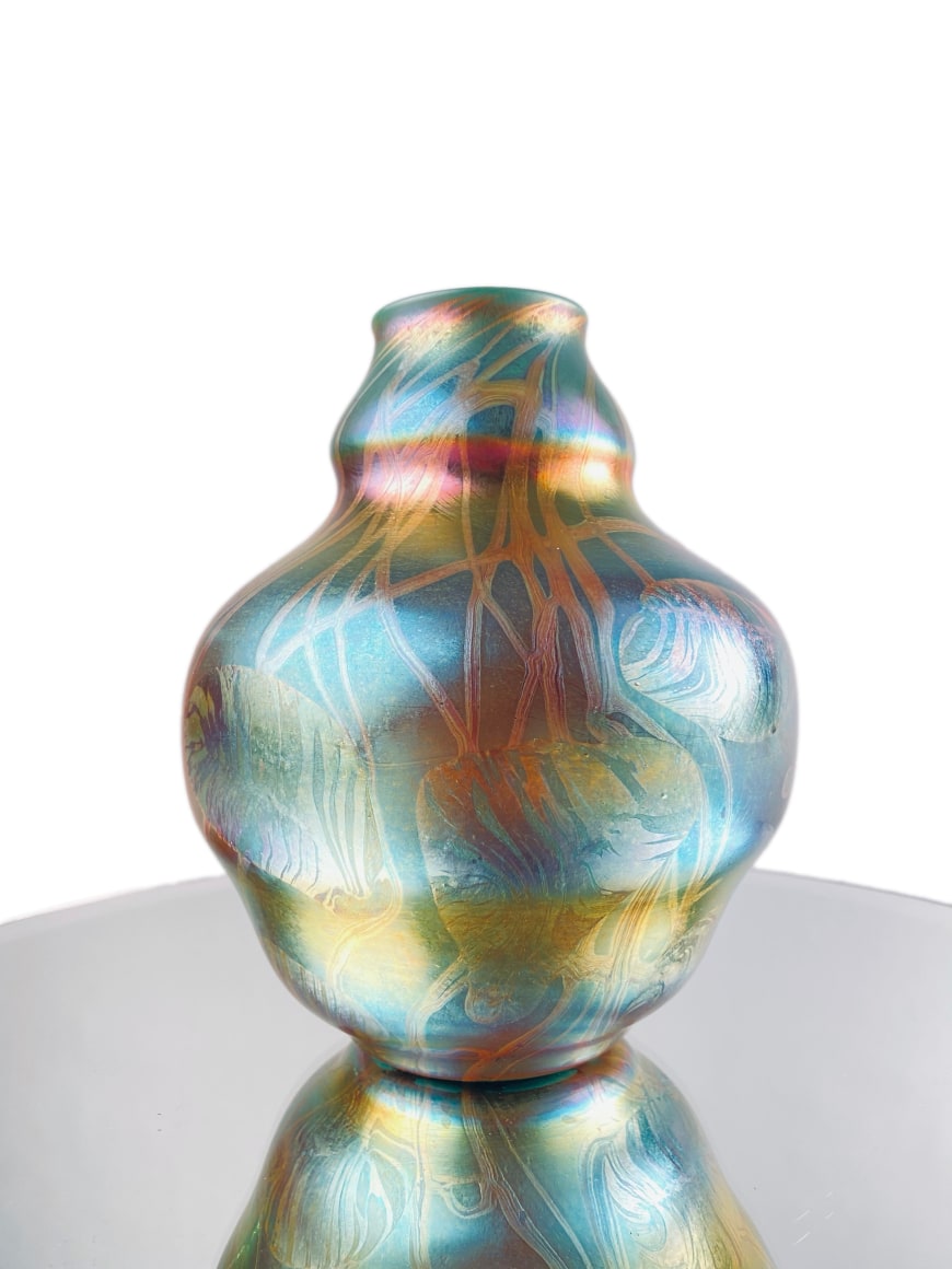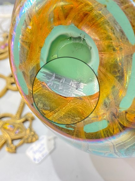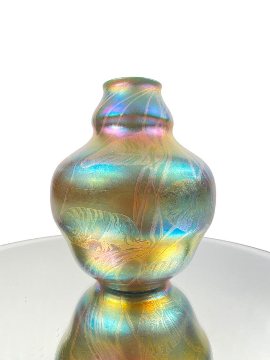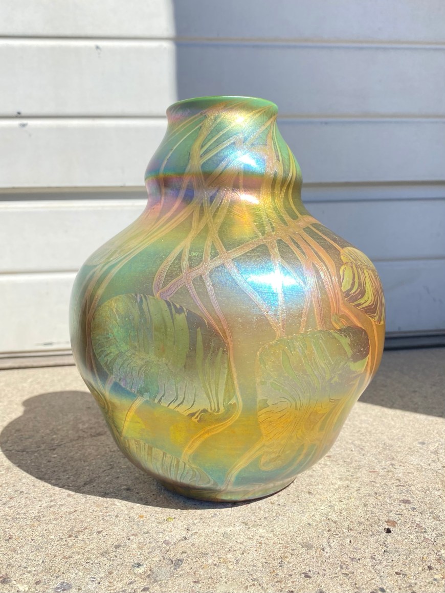 Please note that the vase is heavily reactive to light. The light whether displayed in natural, artificial, low/hot and or led light the vase will display differently and the iridescence will display differently as well.