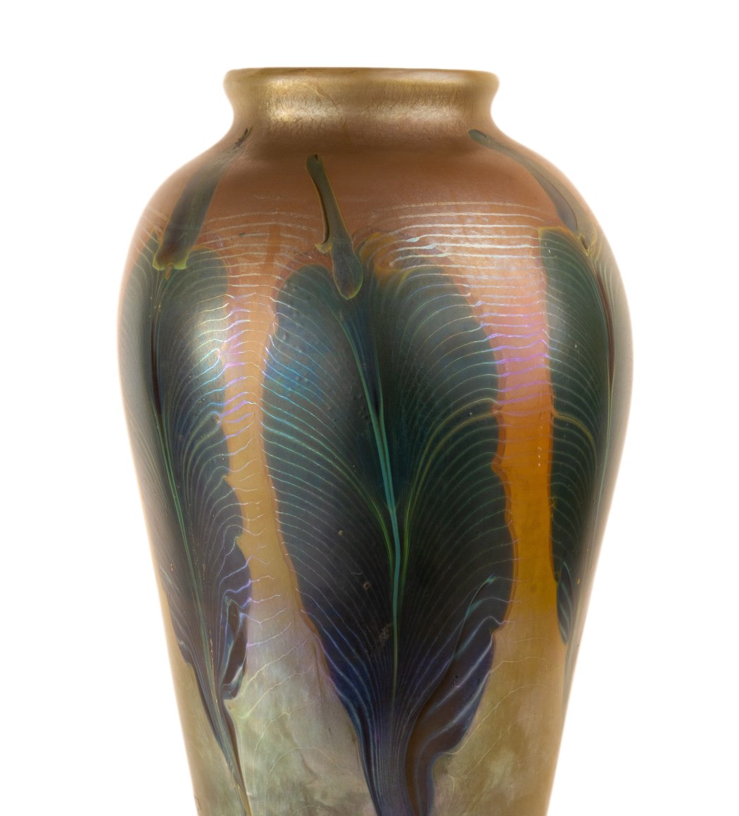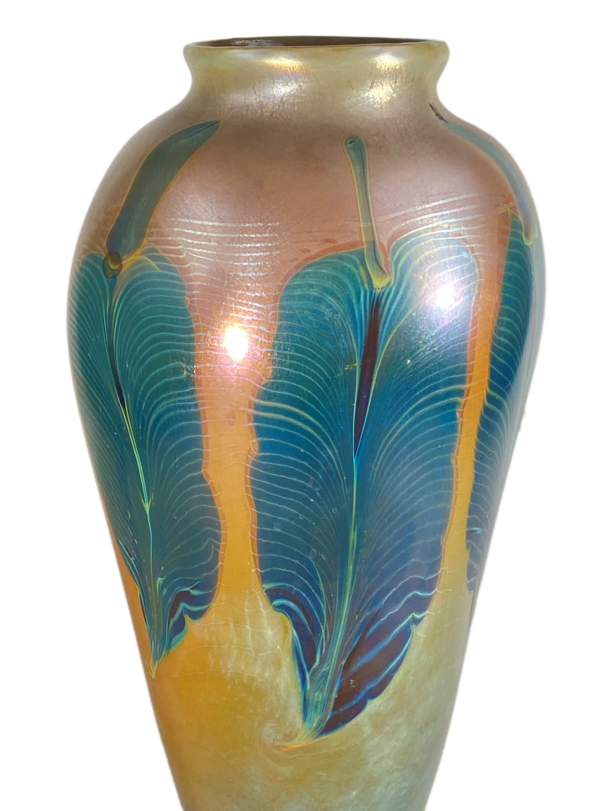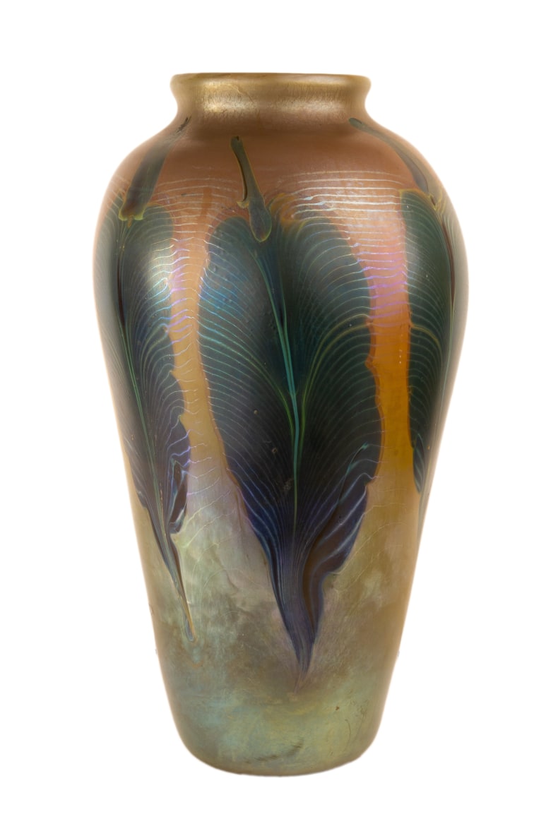 An extremely rare and Important Monumental American Art Nouveau blown glass Tiffany Favrile "Peacock Feather" Vase by, Tiffany Studios decorated with all-over stylized and further iridescent peacock feather design against a mauve-butterscotch iridescent background. The vase is signed, "Louis C. Tiffany D1218" - circa 1900