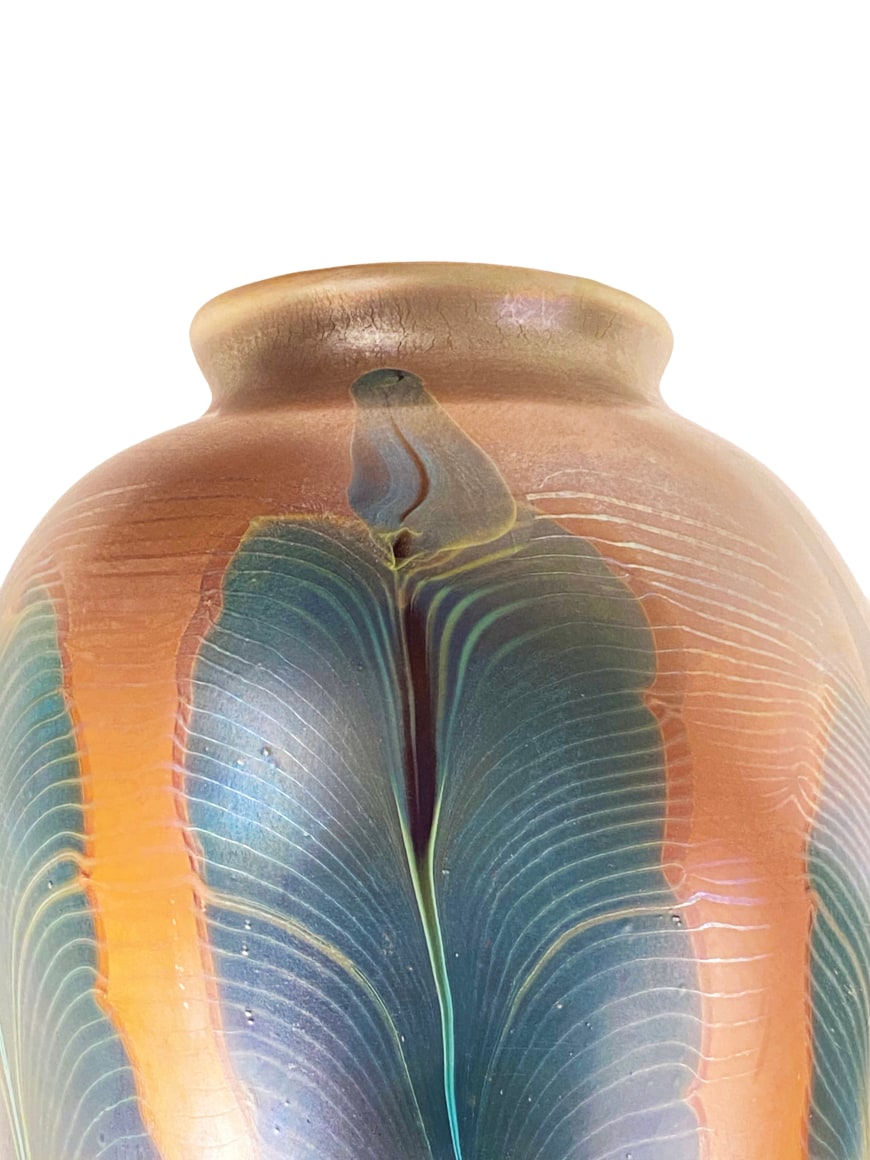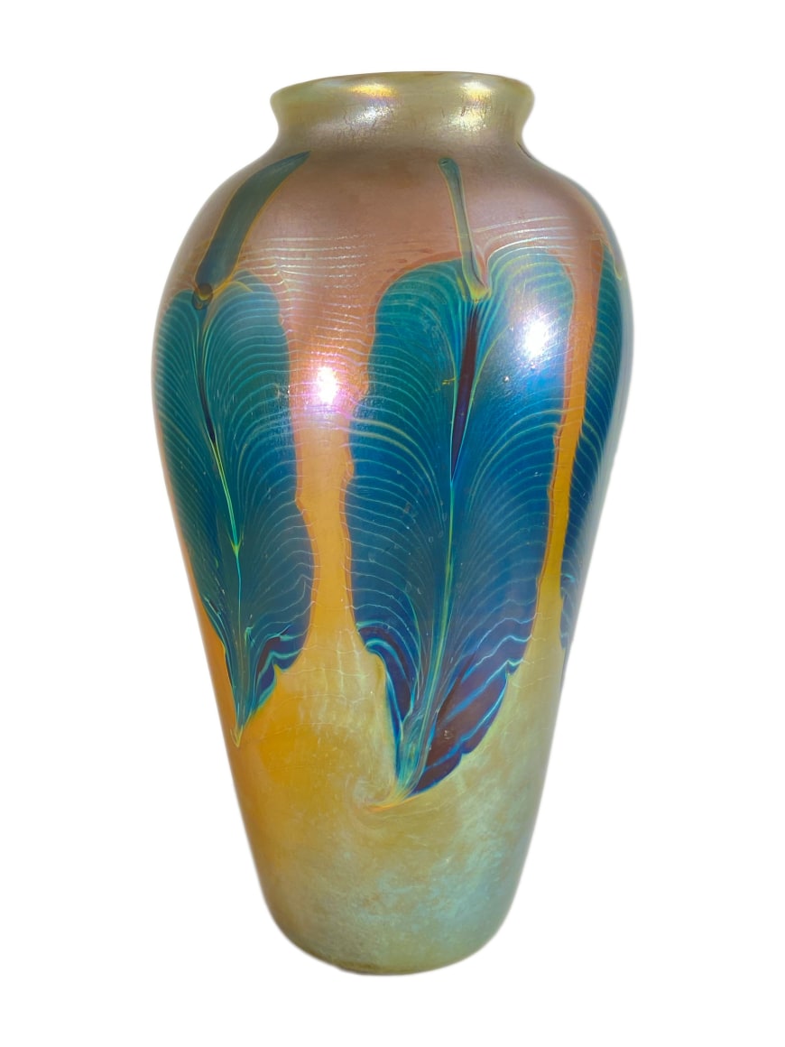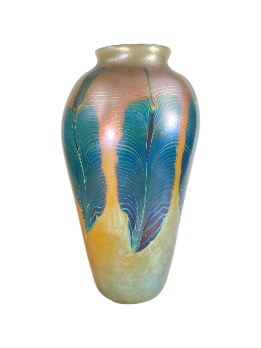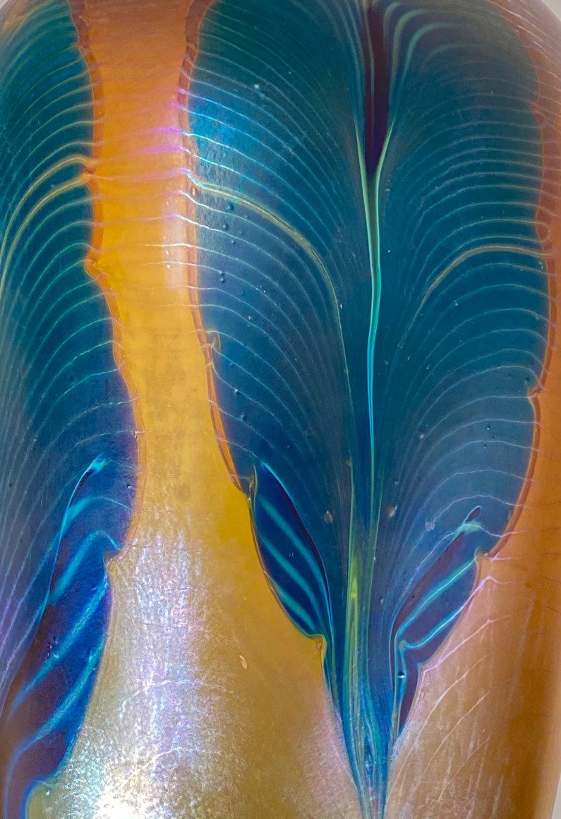 An extremely rare and Important Monumental American Art Nouveau blown glass Tiffany Favrile "Peacock Feather" Vase by, Tiffany Studios decorated with all-over stylized and further iridescent peacock feather design against a mauve-butterscotch iridescent background. The vase is signed, "Louis C. Tiffany D1218" - circa 1900