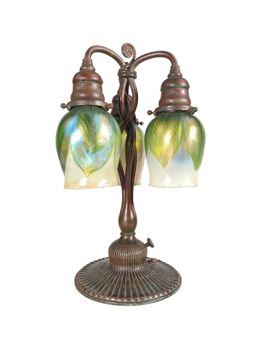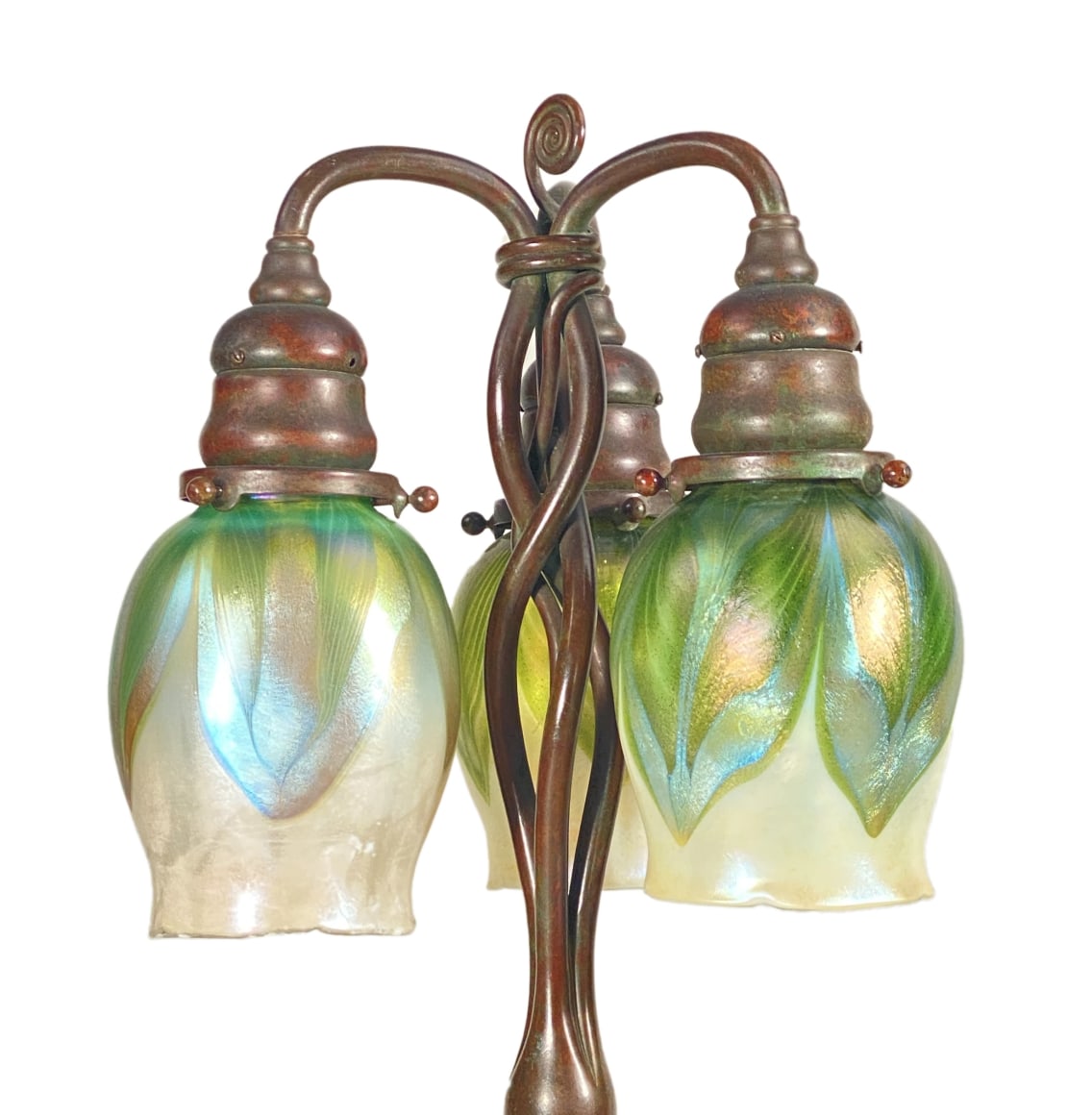 An American Art Nouveau bronze and favrile "Newel Post" desk lamp by Tiffany Studios with three Tiffany Favrile tulip form "Pulled Feather" shades each decorated with iridescent pulled feather decoration against white transparent backgound. The shades are suspended from a three armed organically twisted cast bronze base with open graduating into a ribbed paltform finished with an organic swirl decoration. The lamp is finished in its original and the base is signed, "Tiffany Studios New York 10077" as well as all favrile shades are signed, L.C.T.