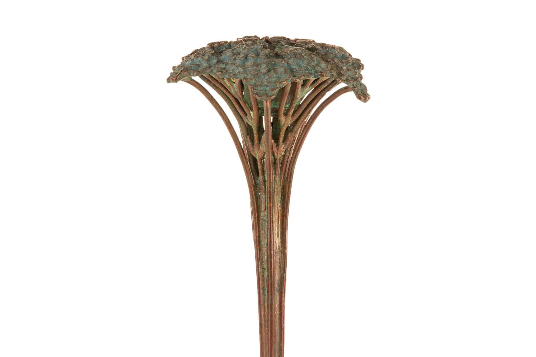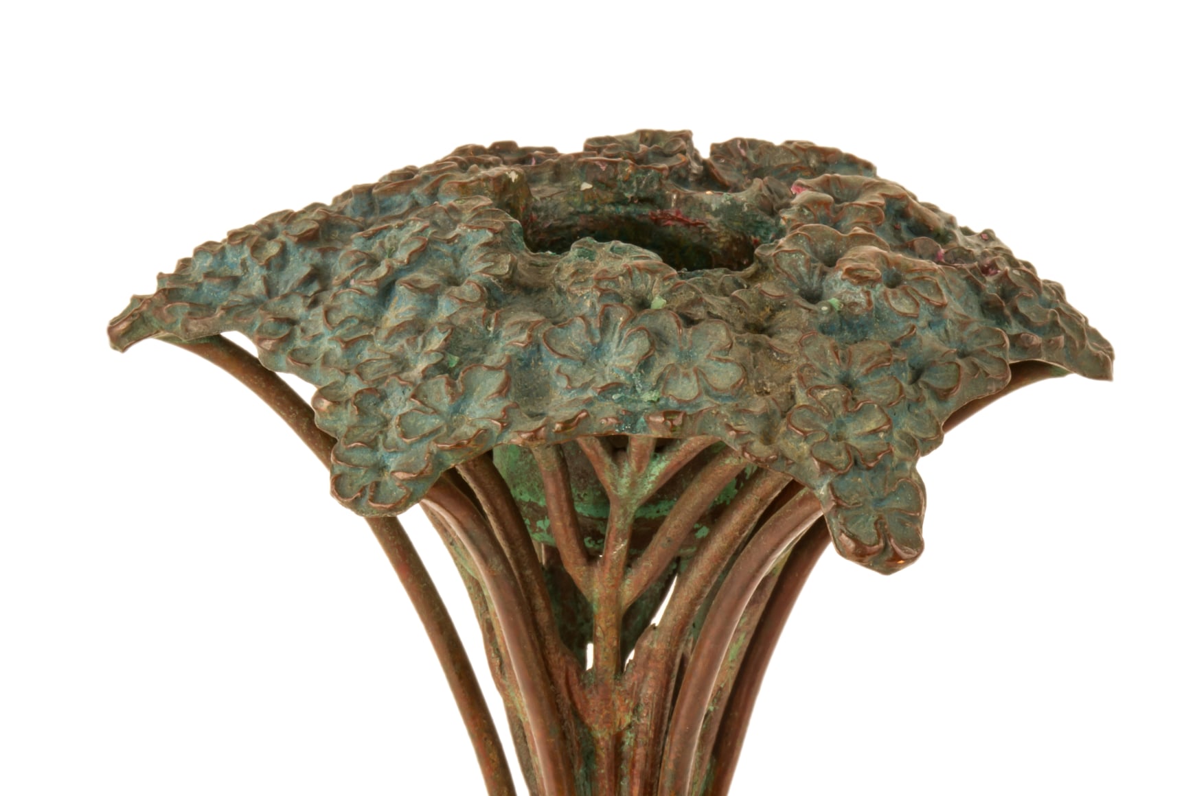 A Rare American Art Nouveau patinated bronze "saxifrage" candlestick by, Tiffany Studios. This candlestick in the form a saxifrage plant exemplifies the studios deep influence with nature and its perception in defining beauty. The candlestick decorated with a cluster of leaves in which forms the base into, a corded stem twisting upwards, and a cluster of flowers which act as the candle cup. A very intricate and exceptionally designed candlestick. The candlestick retains its original patina, is in excellent condition and is unsigned.