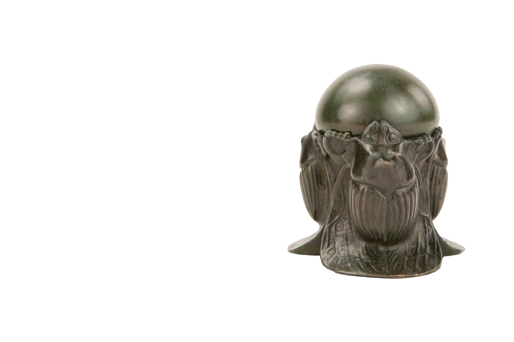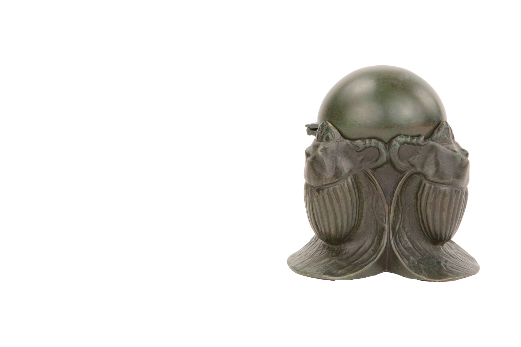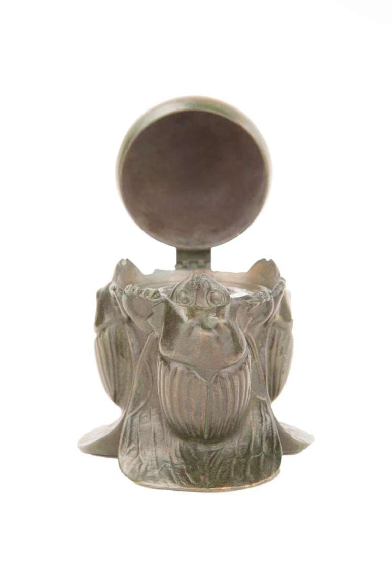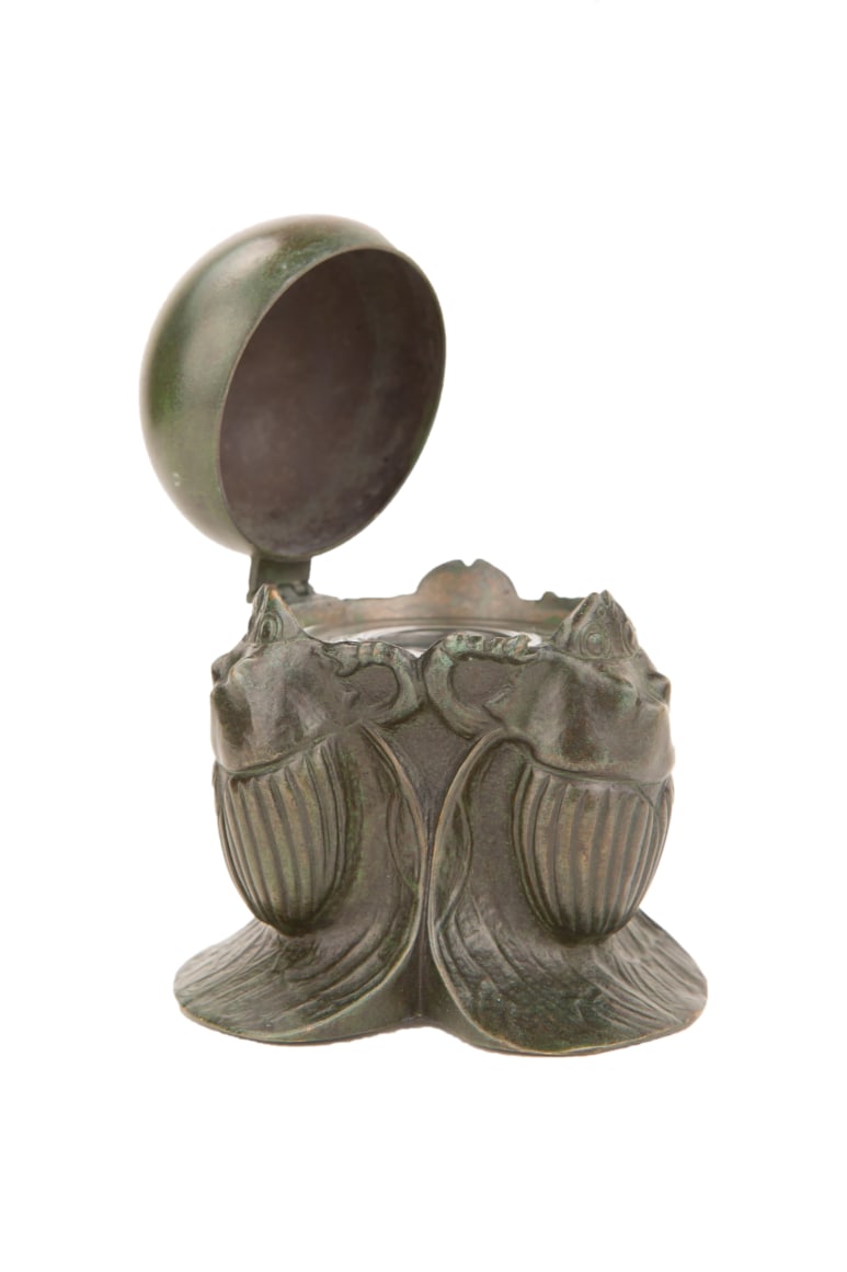 A rare American Art Nouveau bronze and glass "Scarab" inkwell by, Tiffany Studios decorated as three scarabs with a lid and further decorated with a clear glass insert. The inkwell is signed "TIFFANY STUDIOS NEW YORK 21568" and further signed with the Tiffany Glass & Decorating Company monogram.
