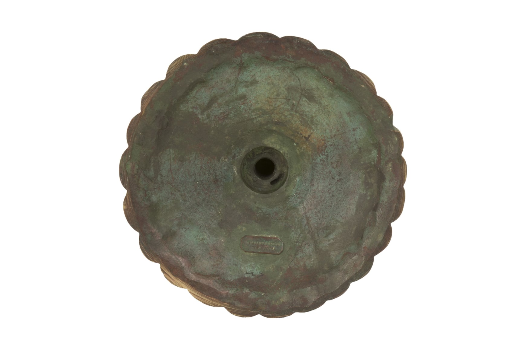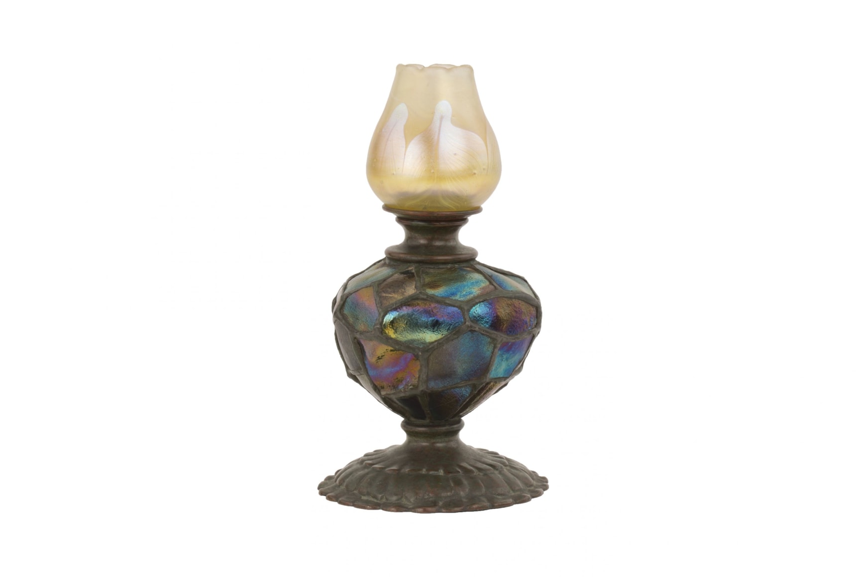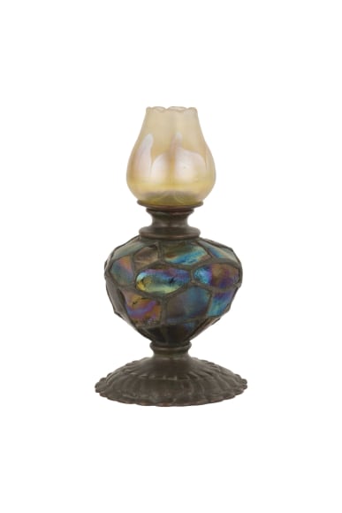 An extremely rare bronze & glass "Turtleback Tile" candlestick by, Tiffany Studios decorated with chunked iridescent turtleback glass a top a decorated bronze foot. The candlestick is signed, "Tiffany Studios New York 1221"